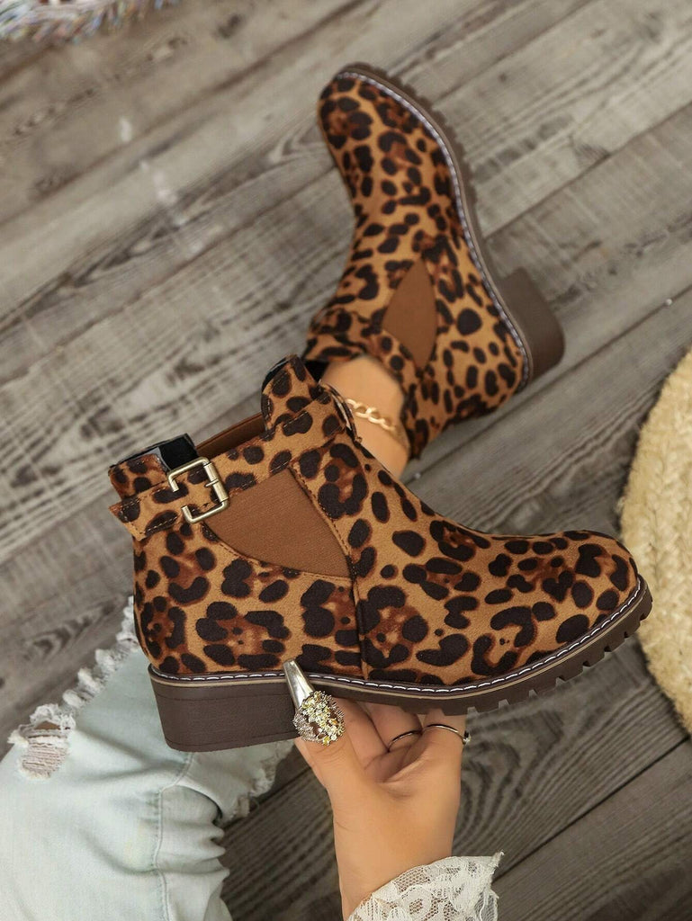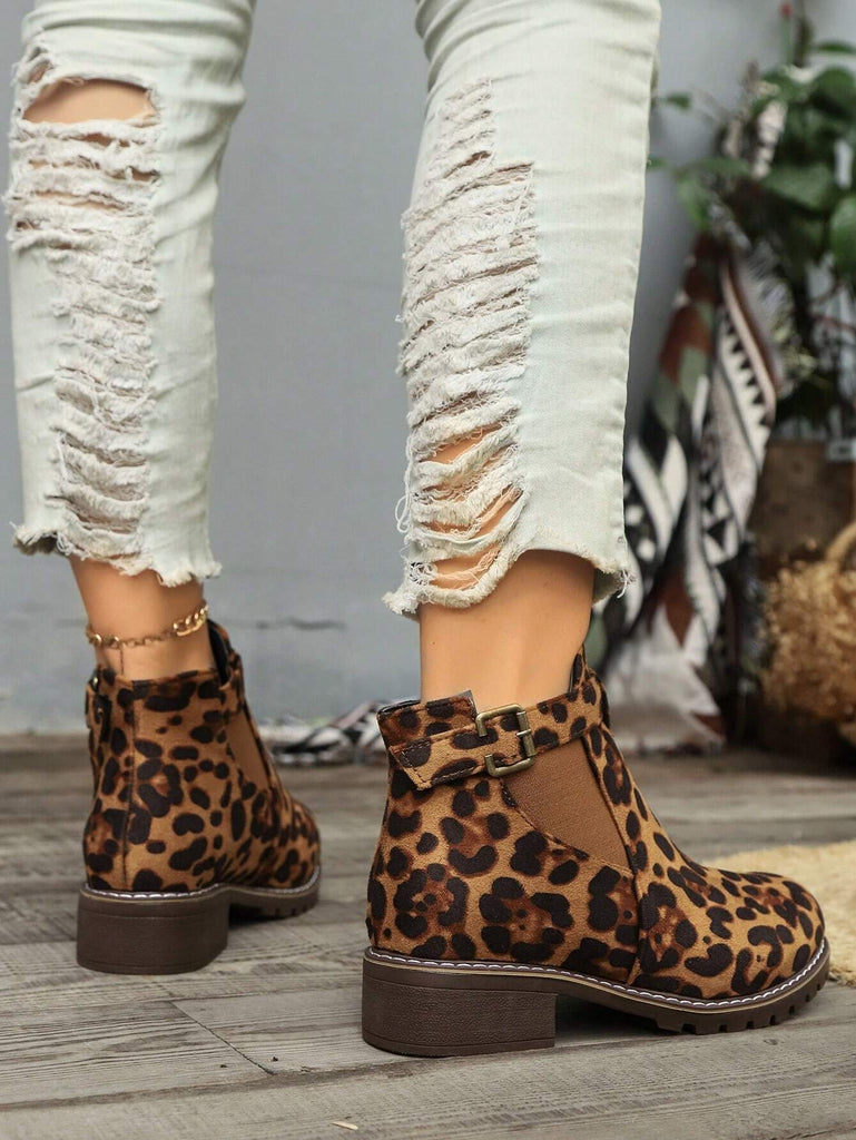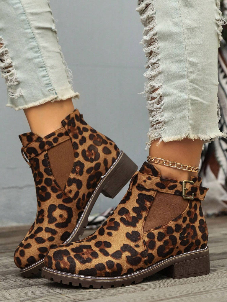 Plus Size Women Fashion Fall Leopard Print Short Boots, Lightweight Retro European Style Versatile Chelsea Boots With Chunky Heel And Pointed Toe,Match With Jacket