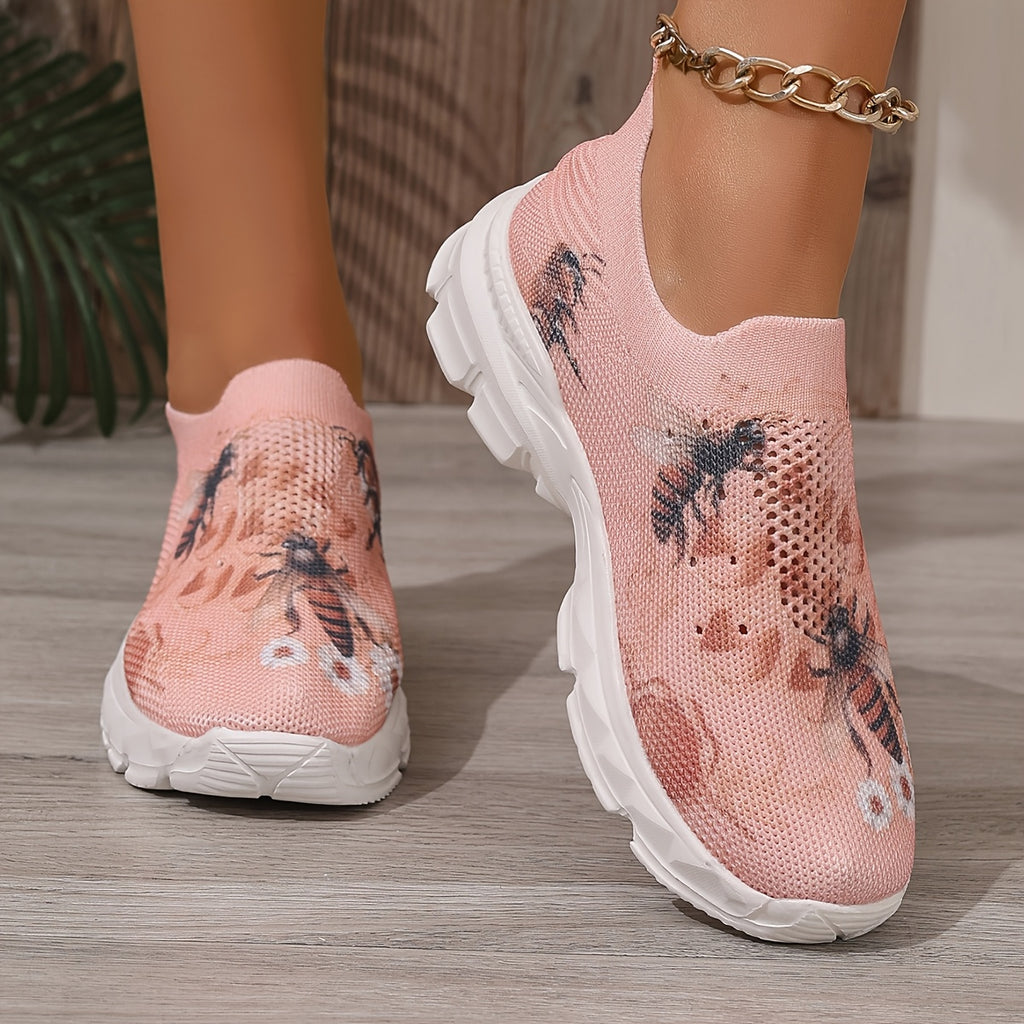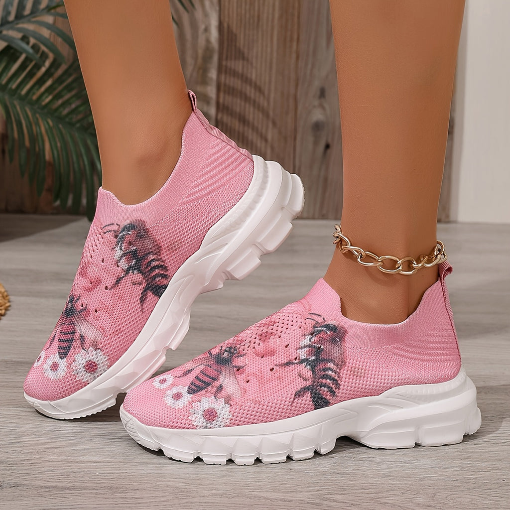 Women's Bee Print Platform Sneakers, Breathable Knit Slip On Outdoor Shoes, Comfortable Low Top Sport Shoes