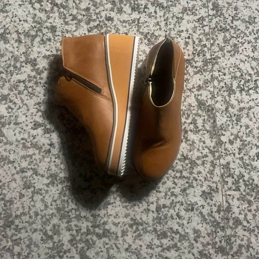 Women's Elegant Slip-Resistant Wedge Heel Ankle Boots - Comfortable PU Cover Upper, Side Zipper Closure, Black & Brown Contrast Design, All-Season Casual Shoes for Casual Attire, Breathable Interior Lining