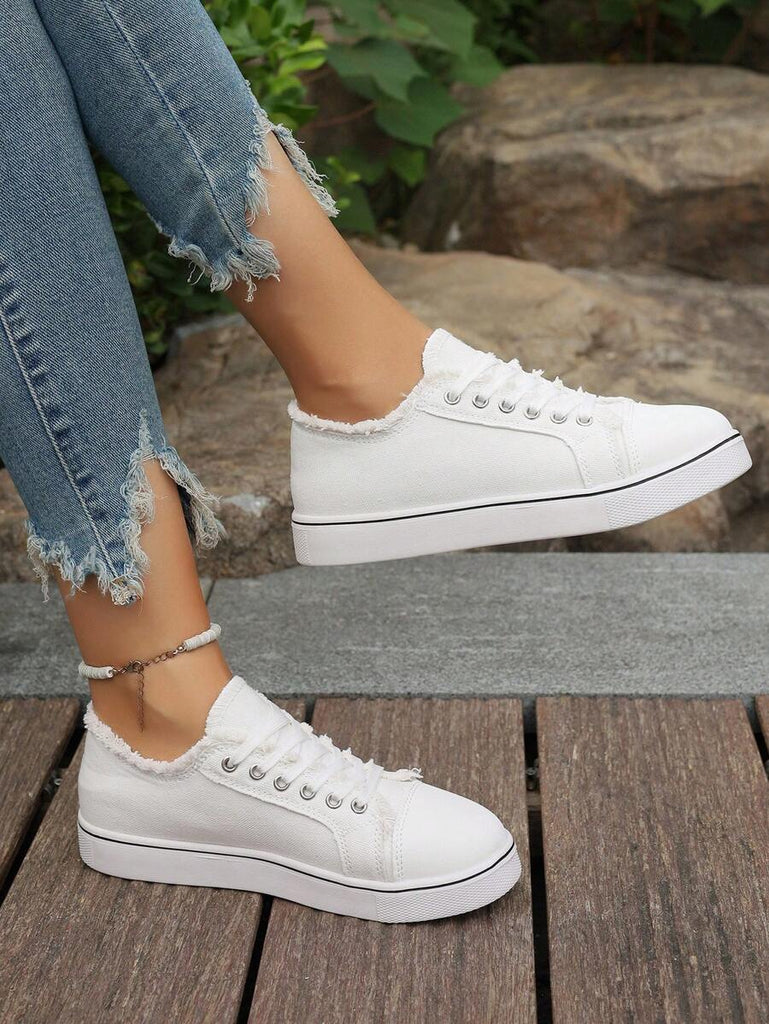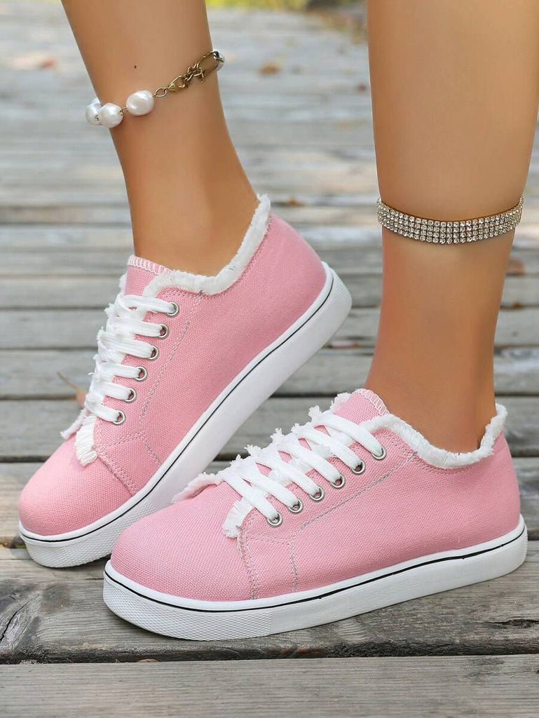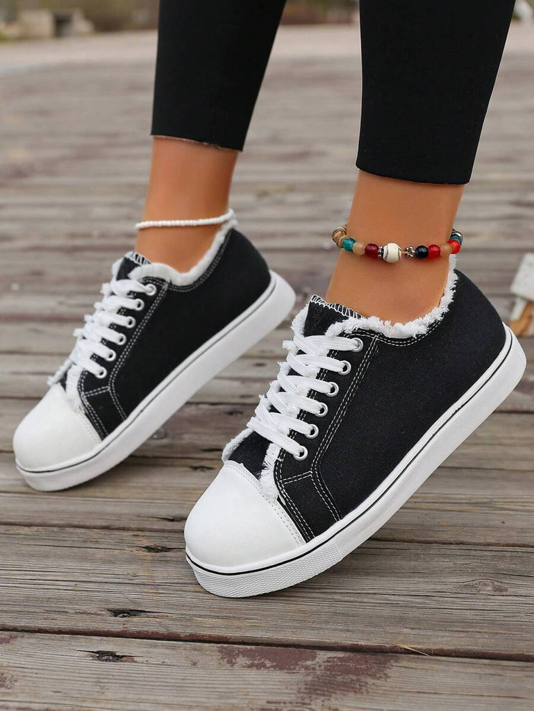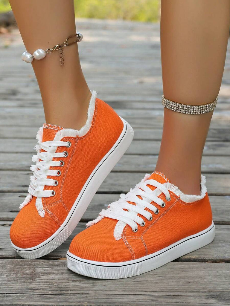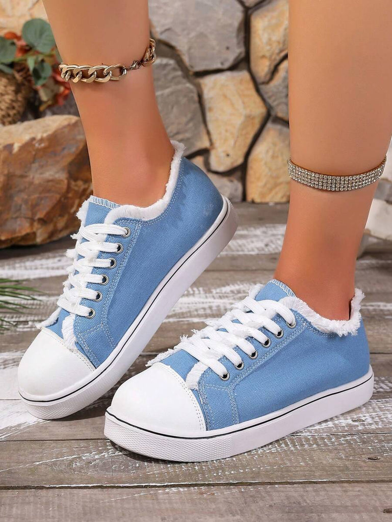 Women's Round Toe Casual Canvas Sneakers, Lace-Up Design With Fuzzy Trim, Suitable For Campus, Daily Life, Home, Commute, Work In 2024, PVC Lightweight Sole, Comfortable & Breathable, All-Season Wear