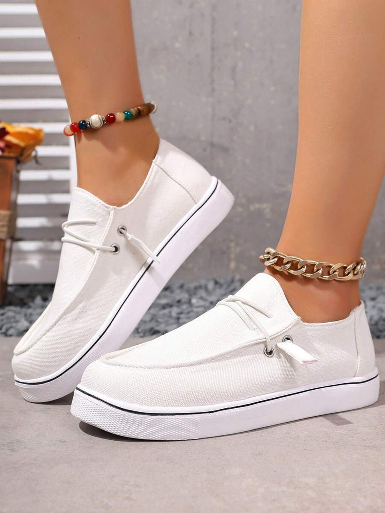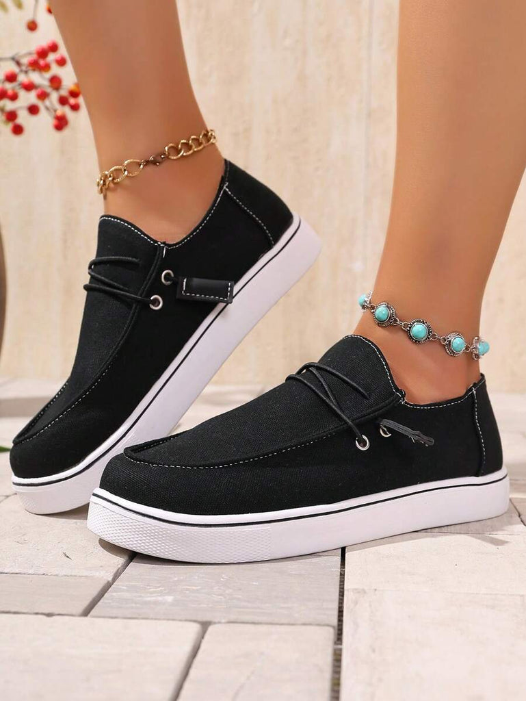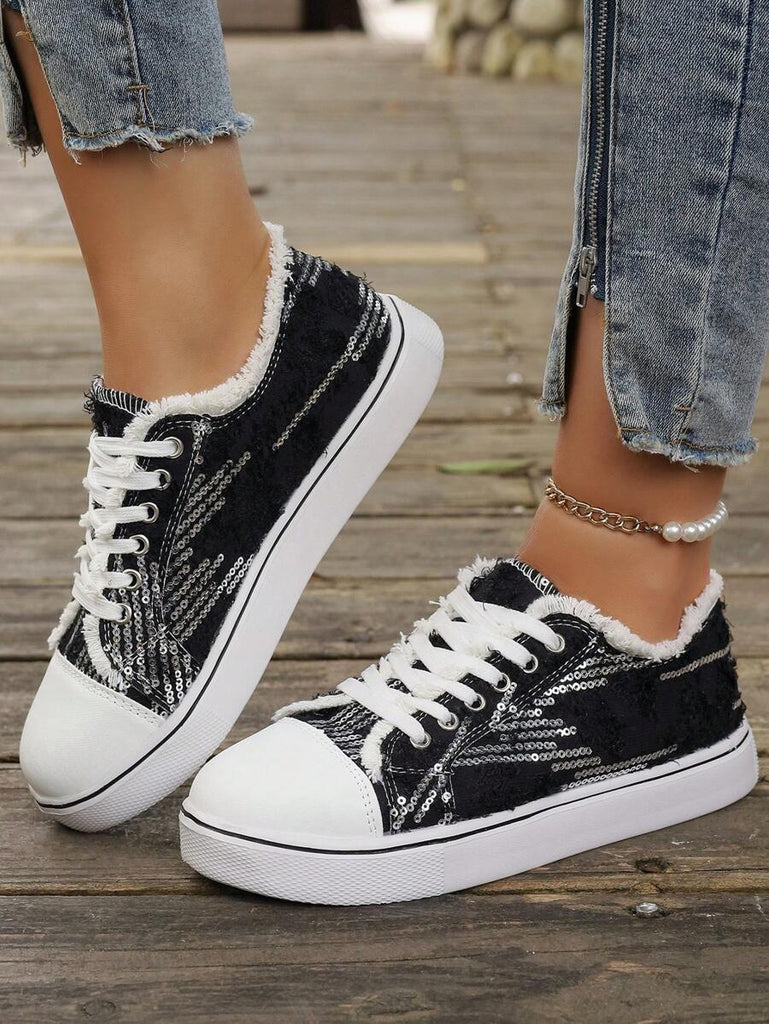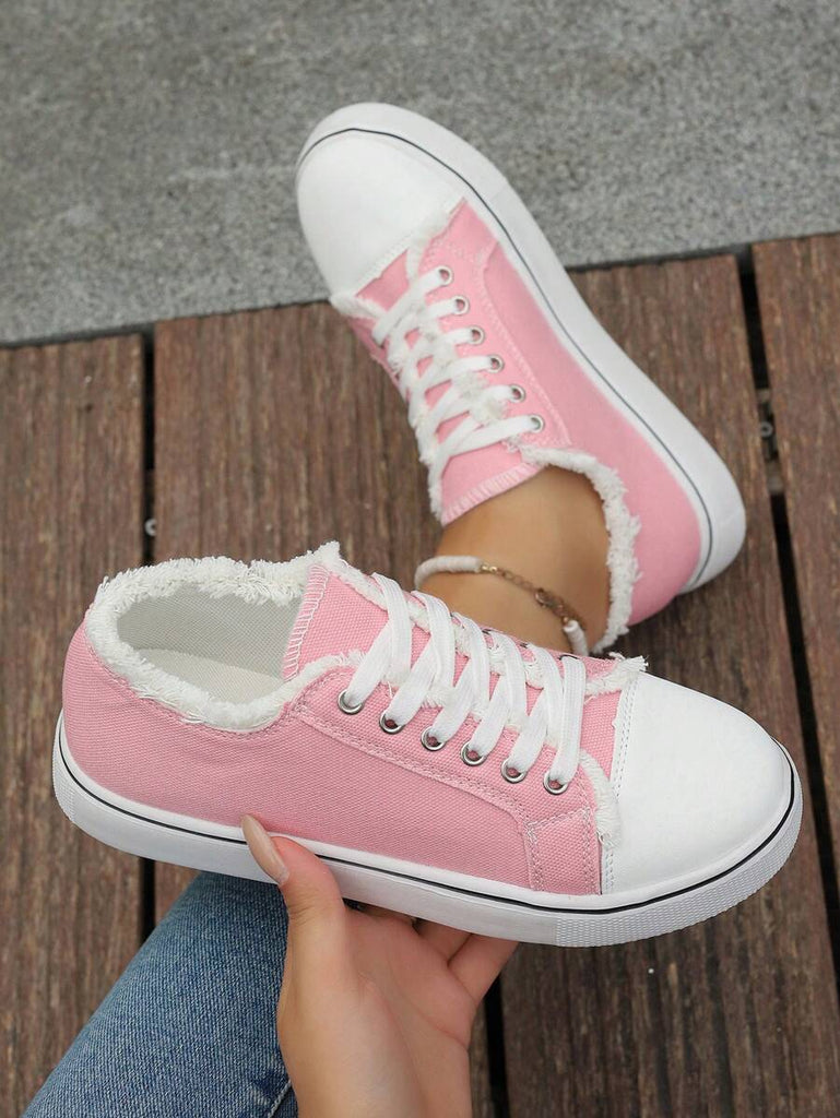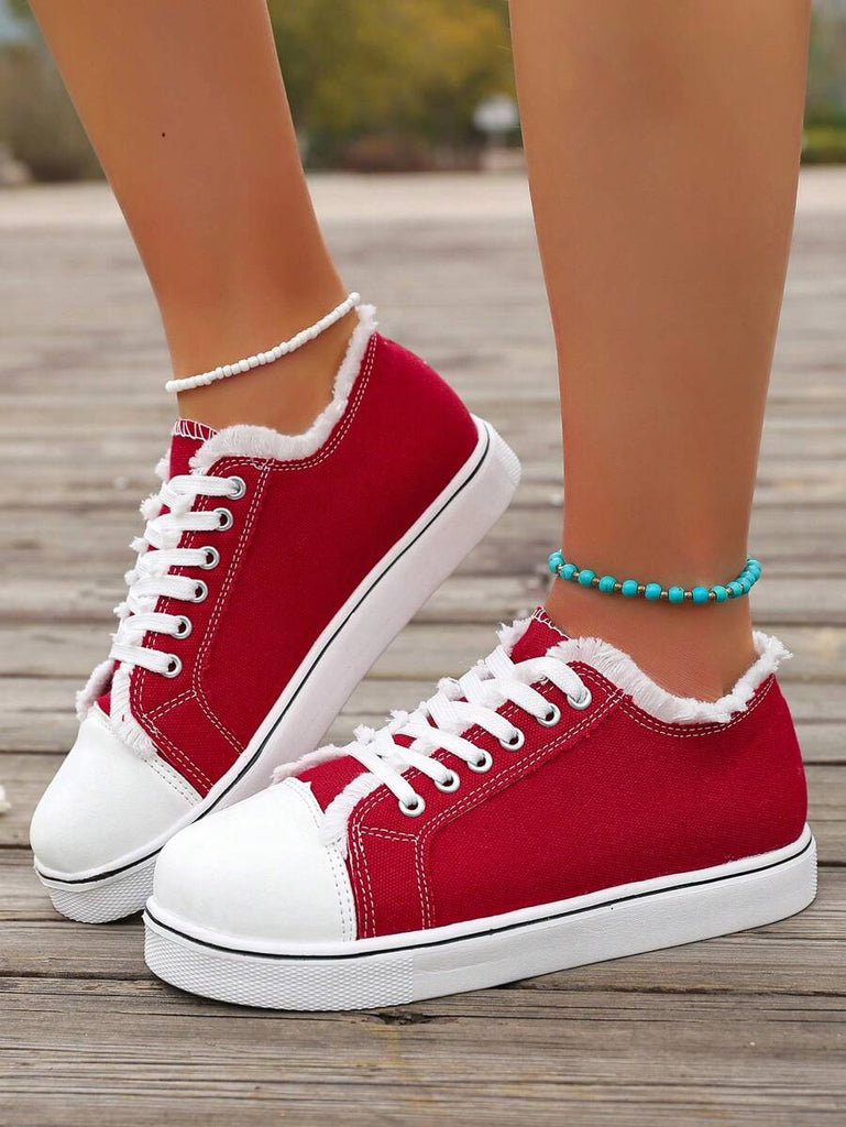 Women's Round Toe Casual Canvas Sneakers, Lace-Up Design With Fuzzy Trim, Suitable For Campus, Daily Life, Home, Commute, Work In 2024, PVC Lightweight Sole, Comfortable & Breathable, All-Season Wear