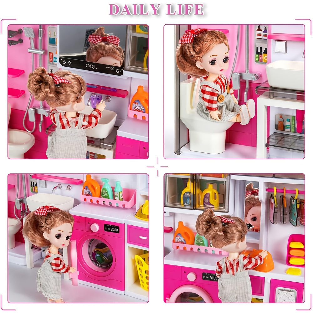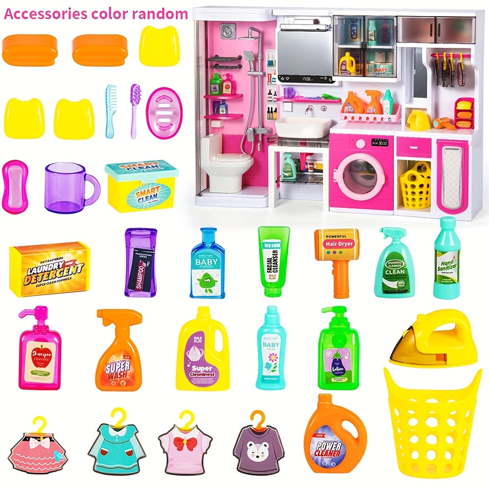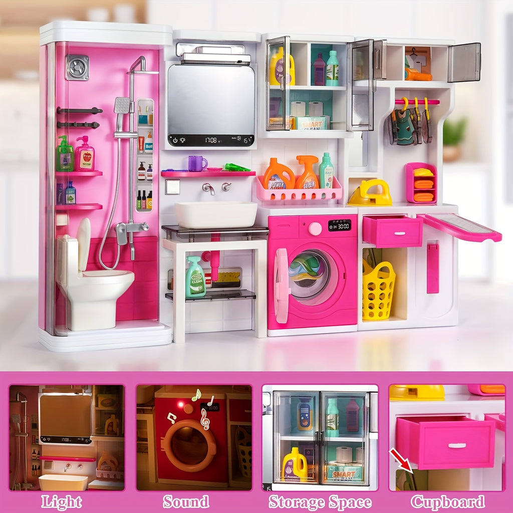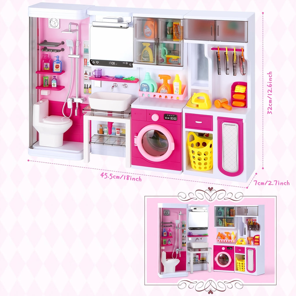 MQUDUO Pink Bathroom Playset with Shower, Vanity, Laundry Cabinet, and Ironing Board, Christmas/Thanksgiving/New Year Gift, Accessories color random