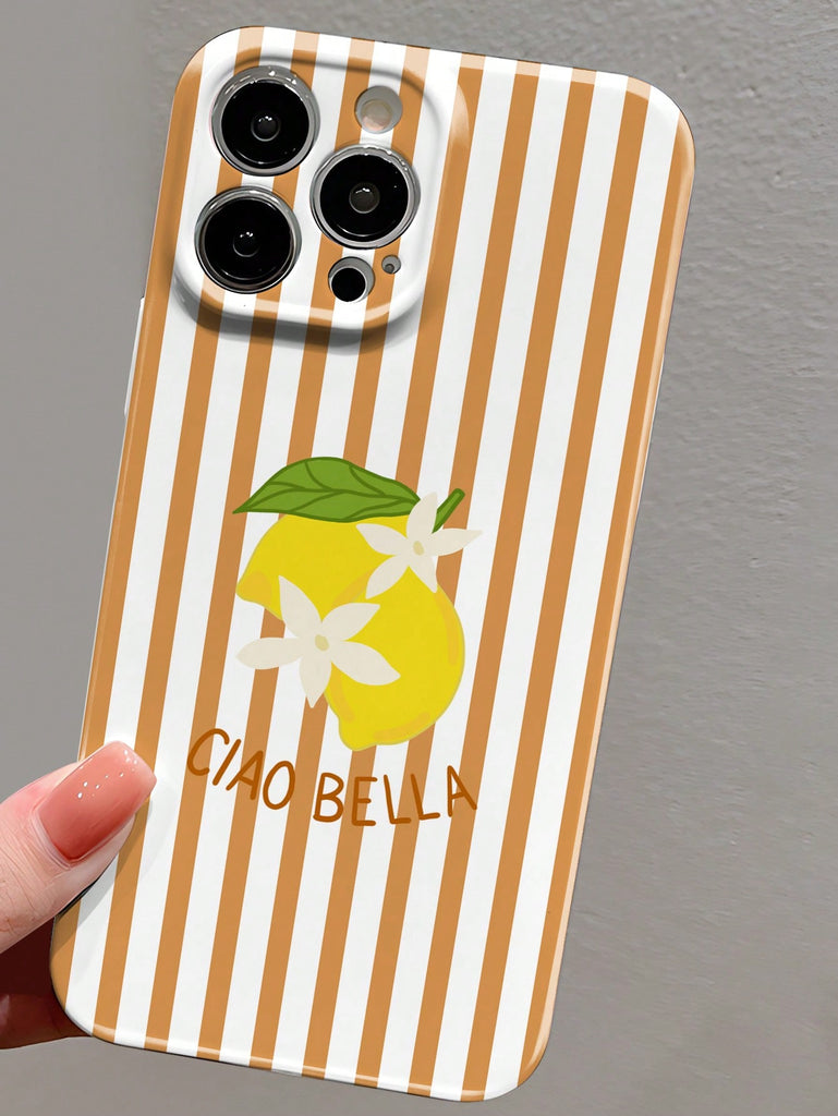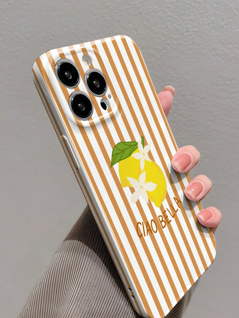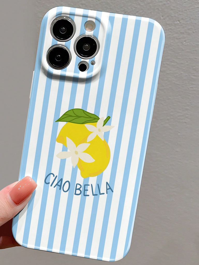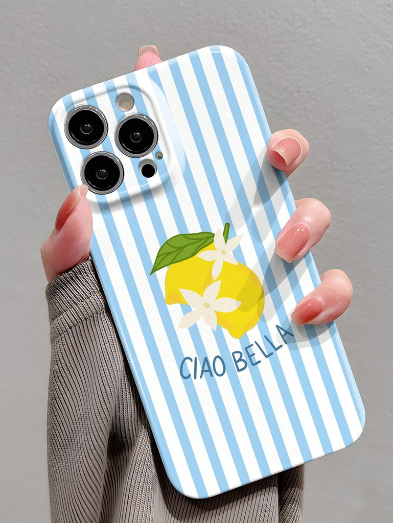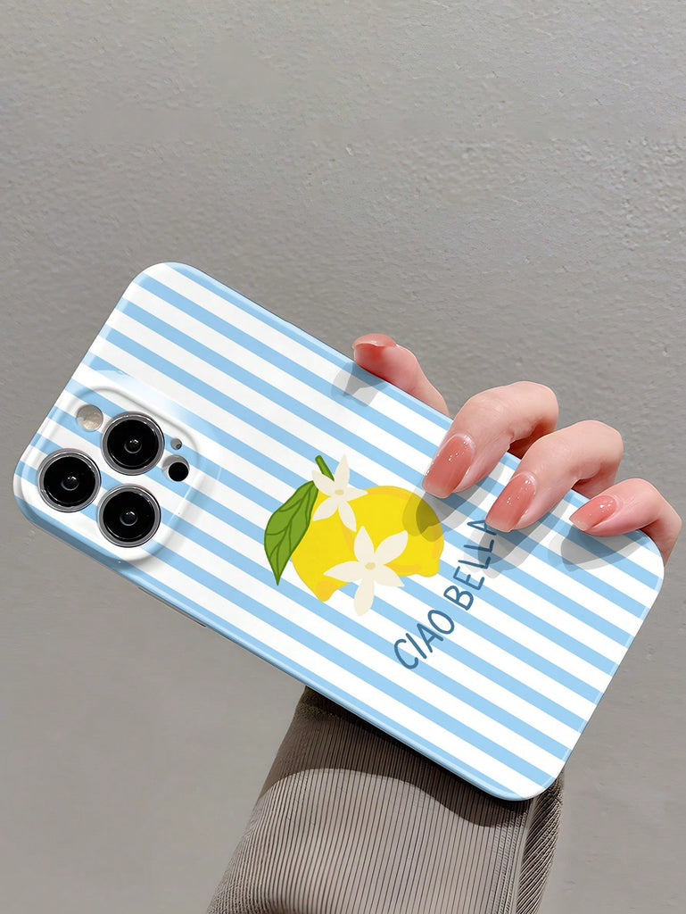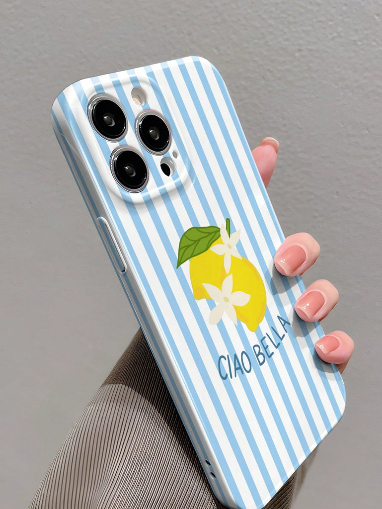 1pc Minimalist Blue & White Striped Lemon Flower Pattern Glossy Perforated Hard Mobile Phone Case Cover For IPhone 11/12/13/14/15/16 Pro Max