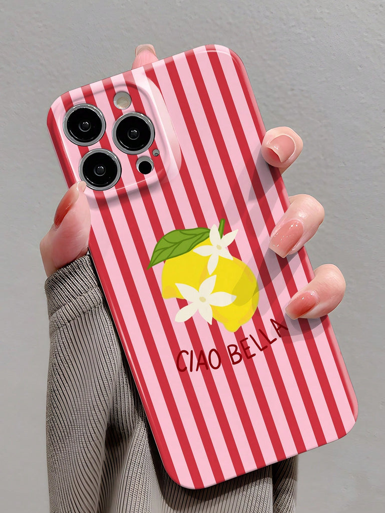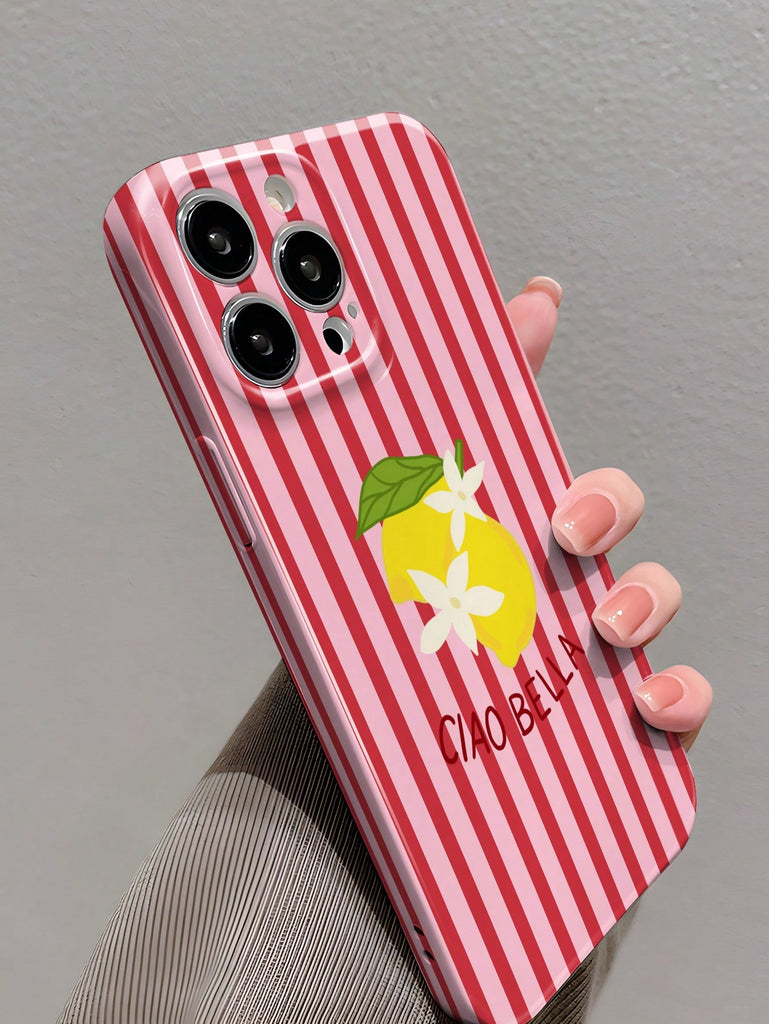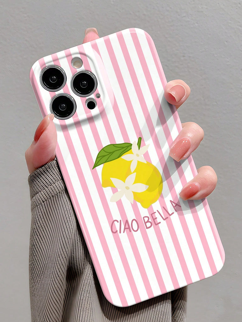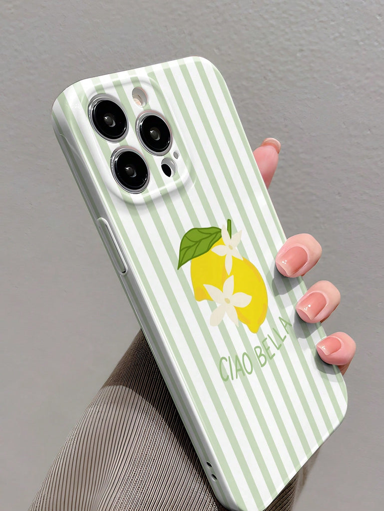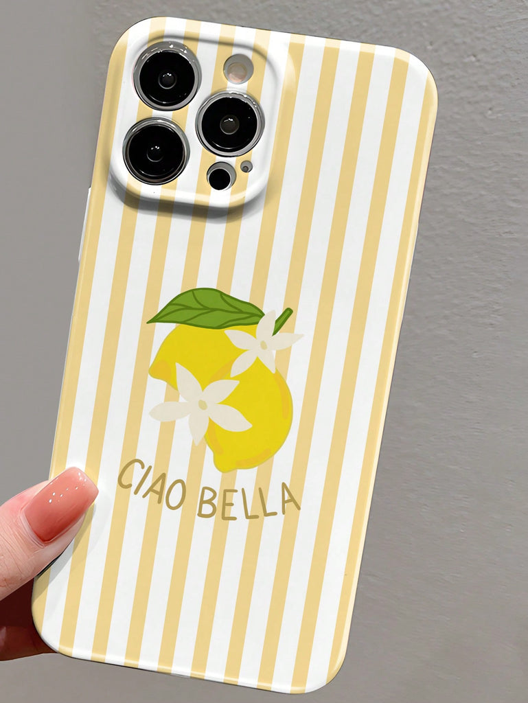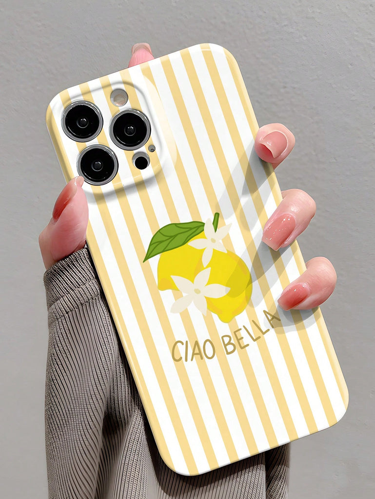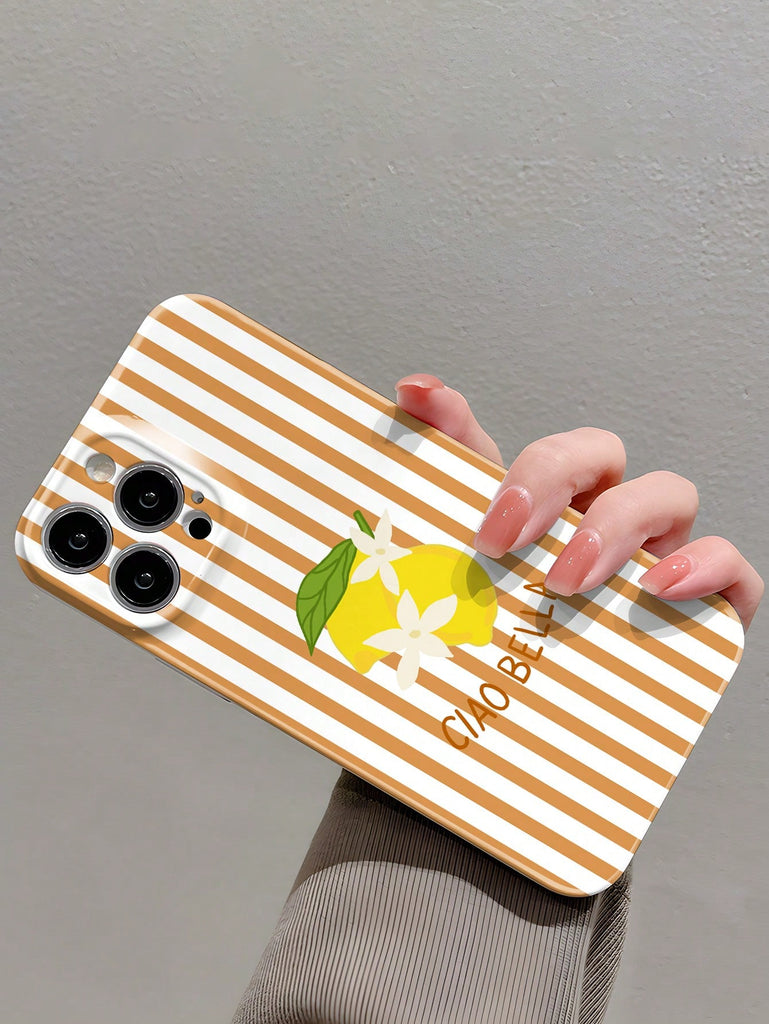 1pc Minimalist Blue & White Striped Lemon Flower Pattern Glossy Perforated Hard Mobile Phone Case Cover For IPhone 11/12/13/14/15/16 Pro Max