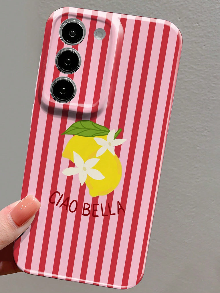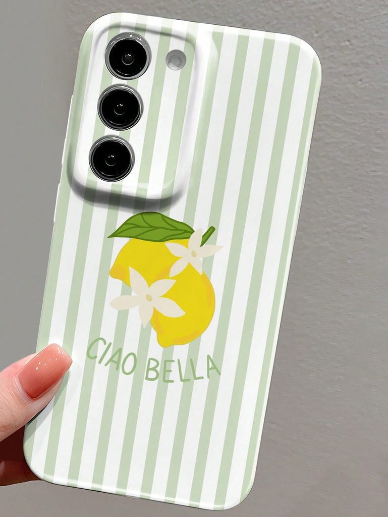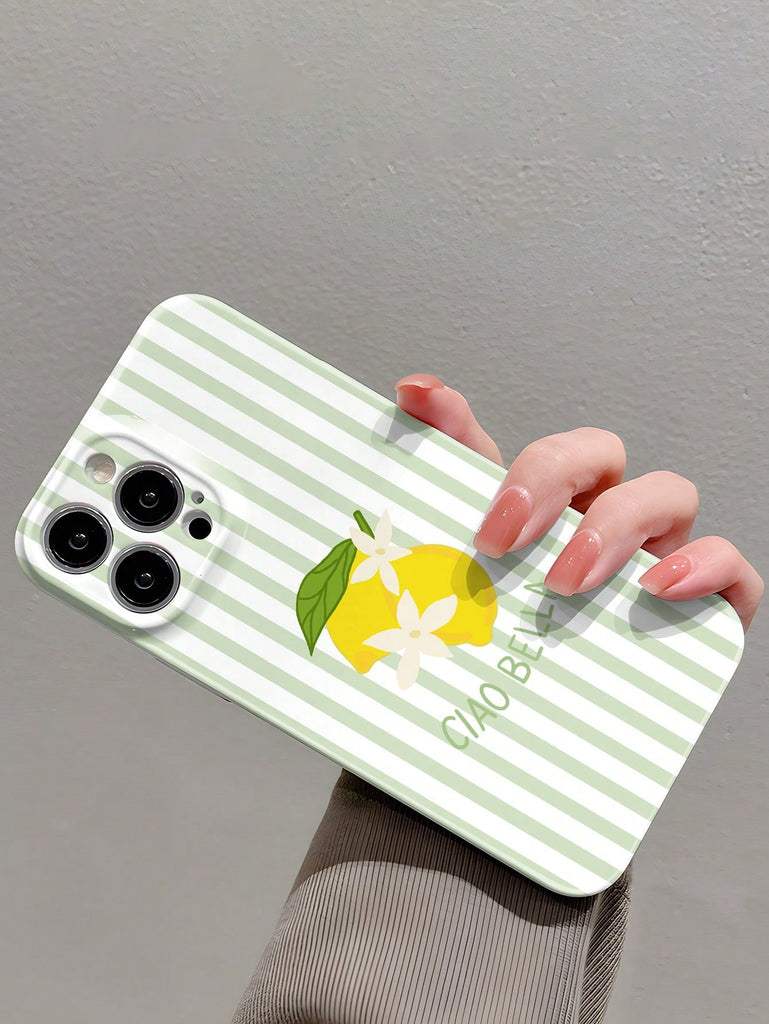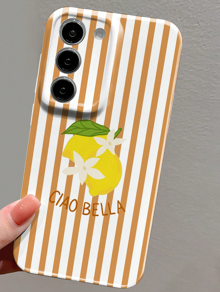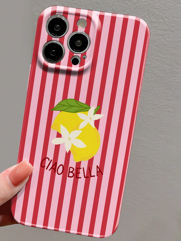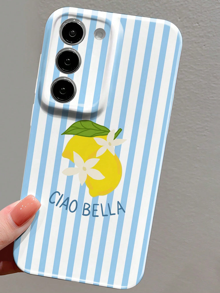 1pc Minimalist Blue & White Striped Lemon Flower Pattern Glossy Perforated Hard Mobile Phone Case Cover For IPhone 11/12/13/14/15/16 Pro Max