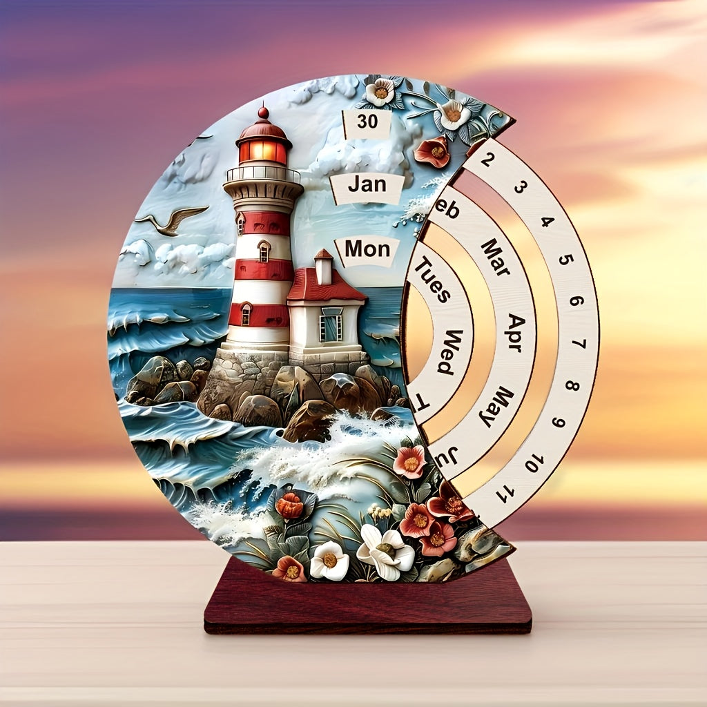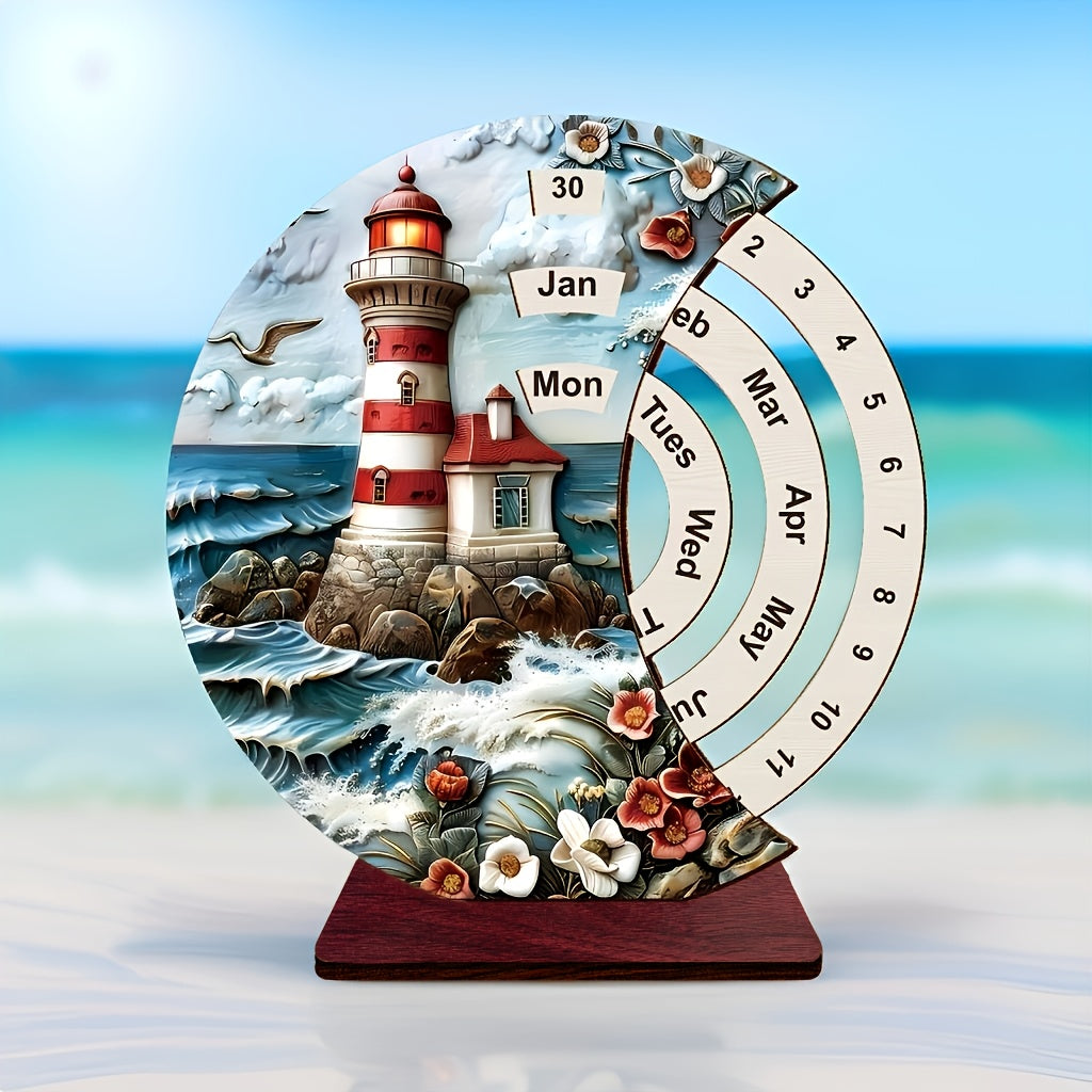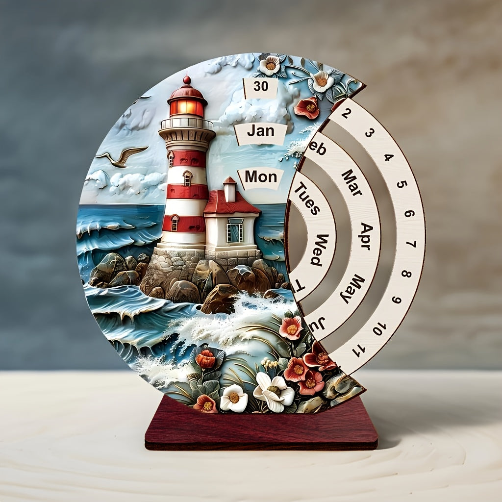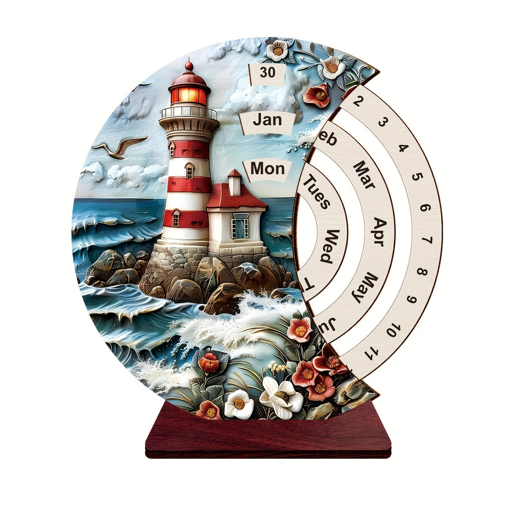 Nautical Lighthouse & Floral Wooden Desk Calendar - Manual Rotating, 2D Flat Design for Home, Office, and Hallway Decor, Creative, Desktop Calendar