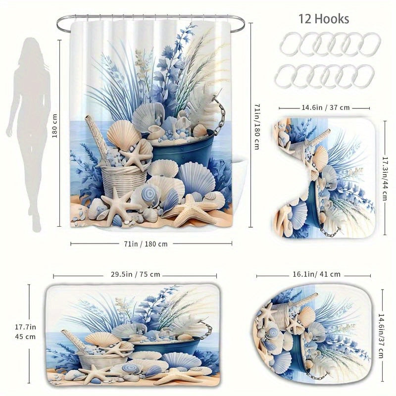 1/4pcs Creative Beach Shell Starfish Pattern Shower Curtain Set, Spring And Summer, Home Bathroom Modern Style, Bathroom Shower Decoration, Advanced Bathroom Home Decoration Accessories, Universal All Year Round, Machine Washable, 12 Hooks, Essential Hoo