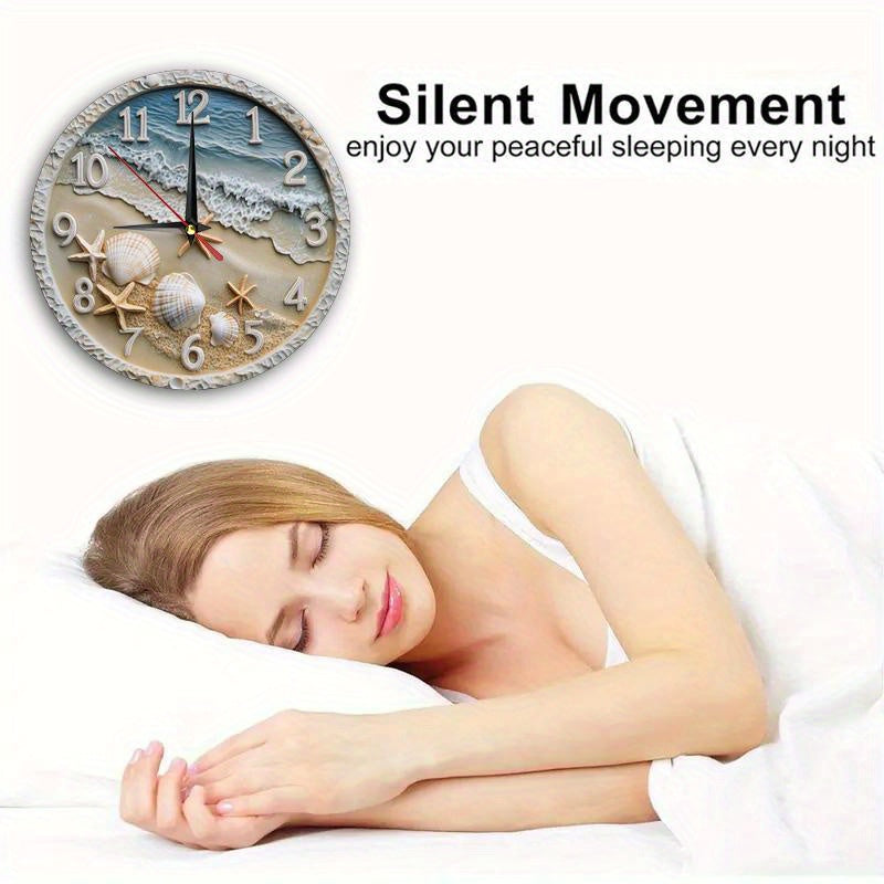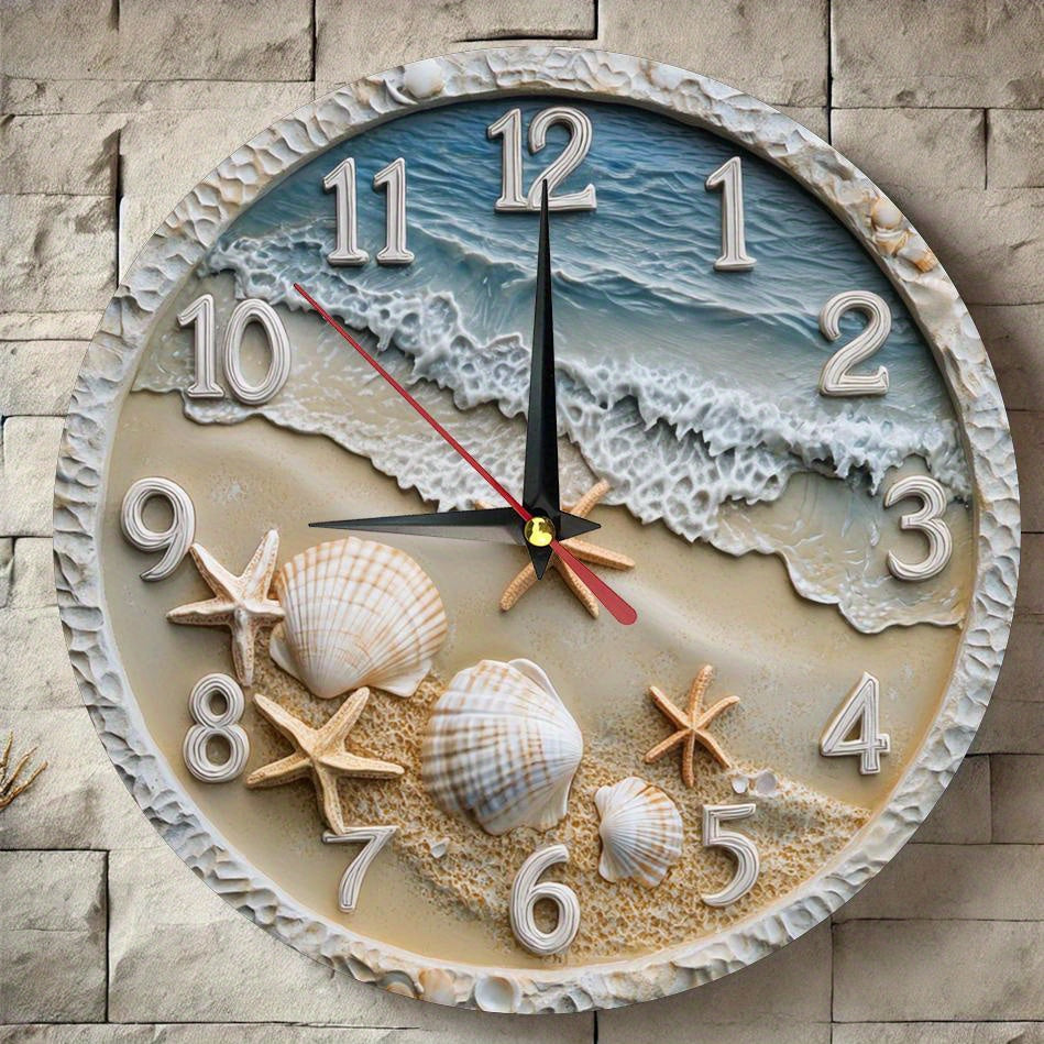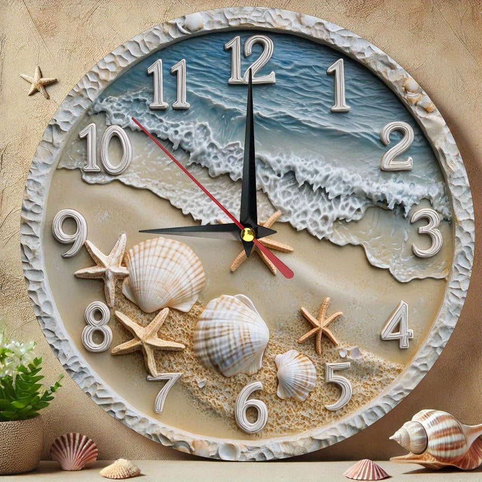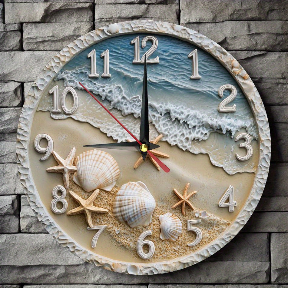 1pc Beach Shells Theme Wooden Round Wall Clock, Farmhouse Style Home Decor for Kitchen, Bedroom, Office, Easy to Read, No Ticking Sound, Battery Not Included, 24.89x24.89 cm
