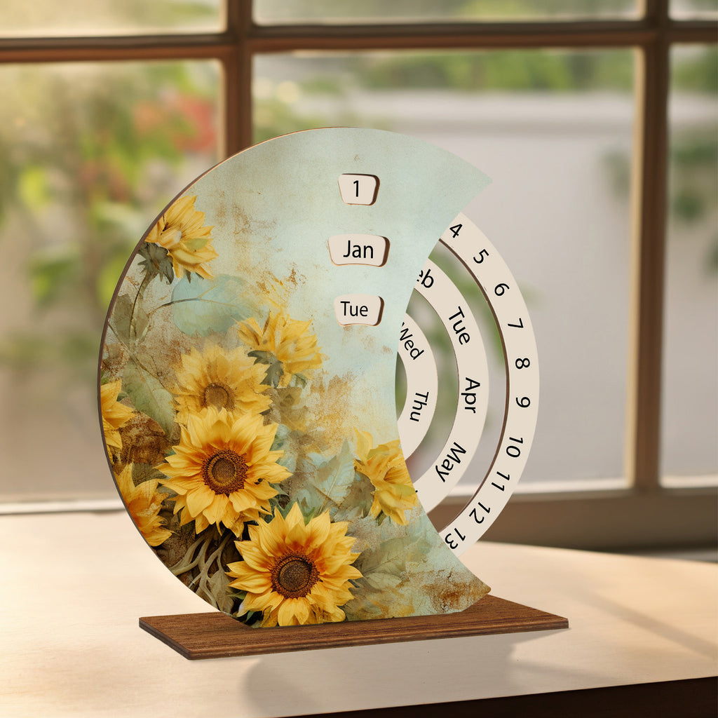 1SET Unique Wooden Rotating Calendar with Sunflower Pattern, Desk Decor for Home and Office, Creative Date Changer, Artistic Craft Gif