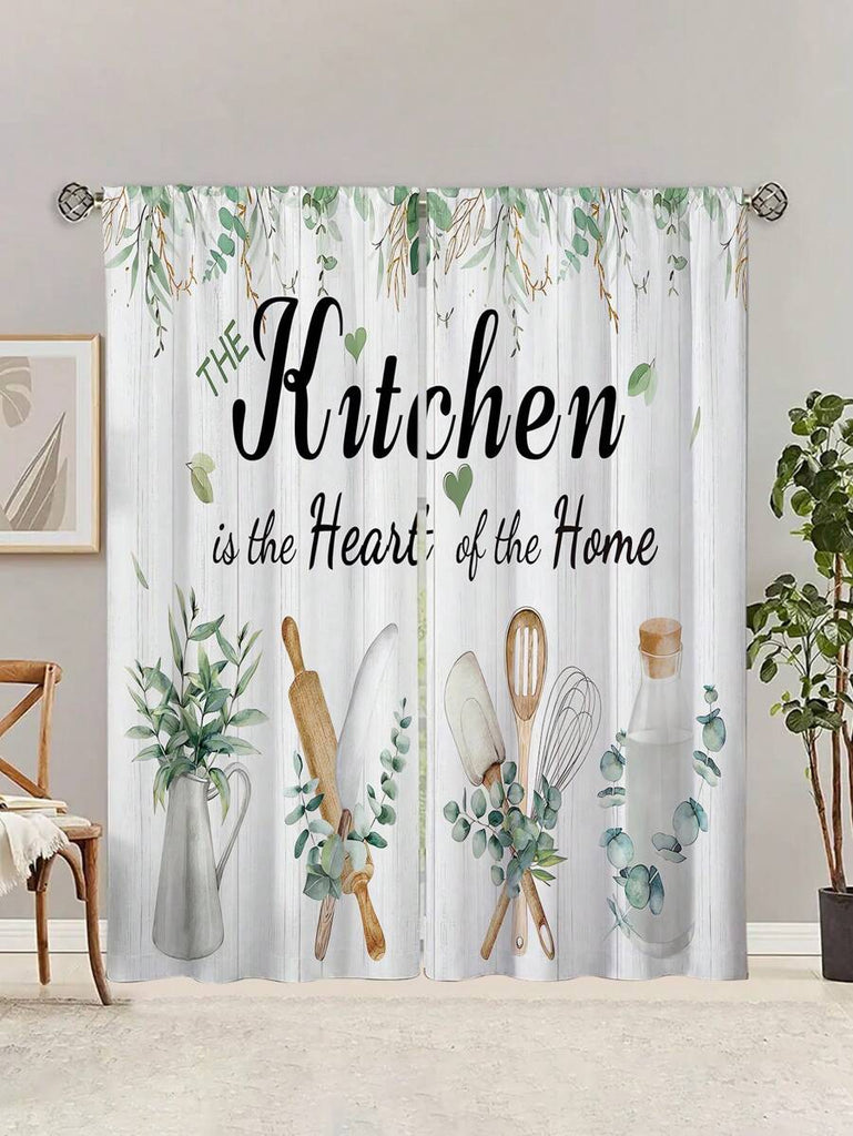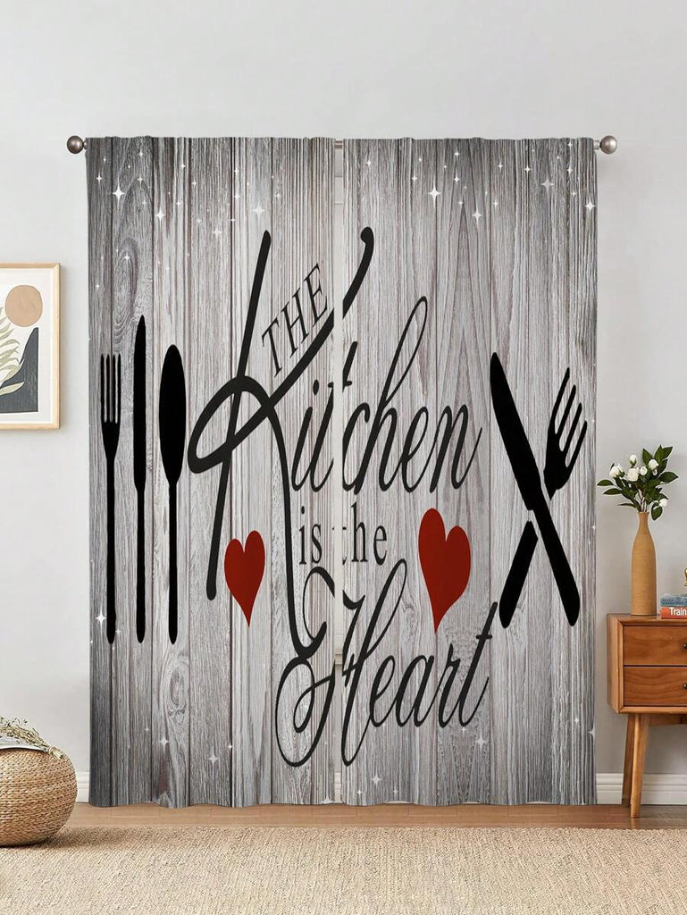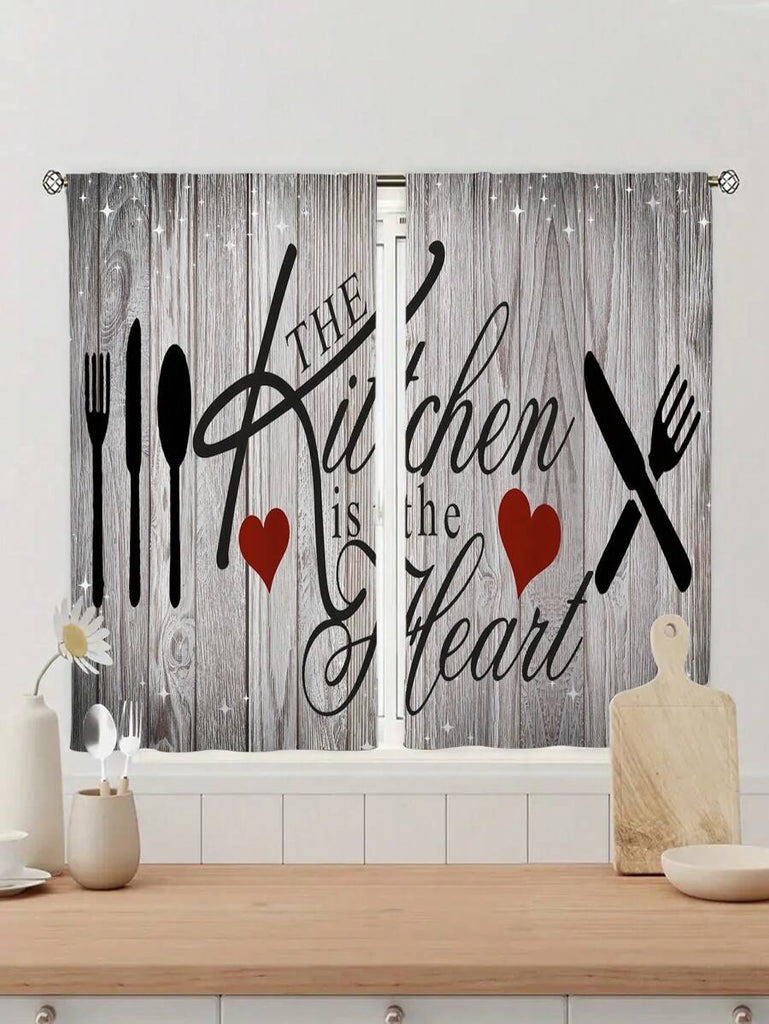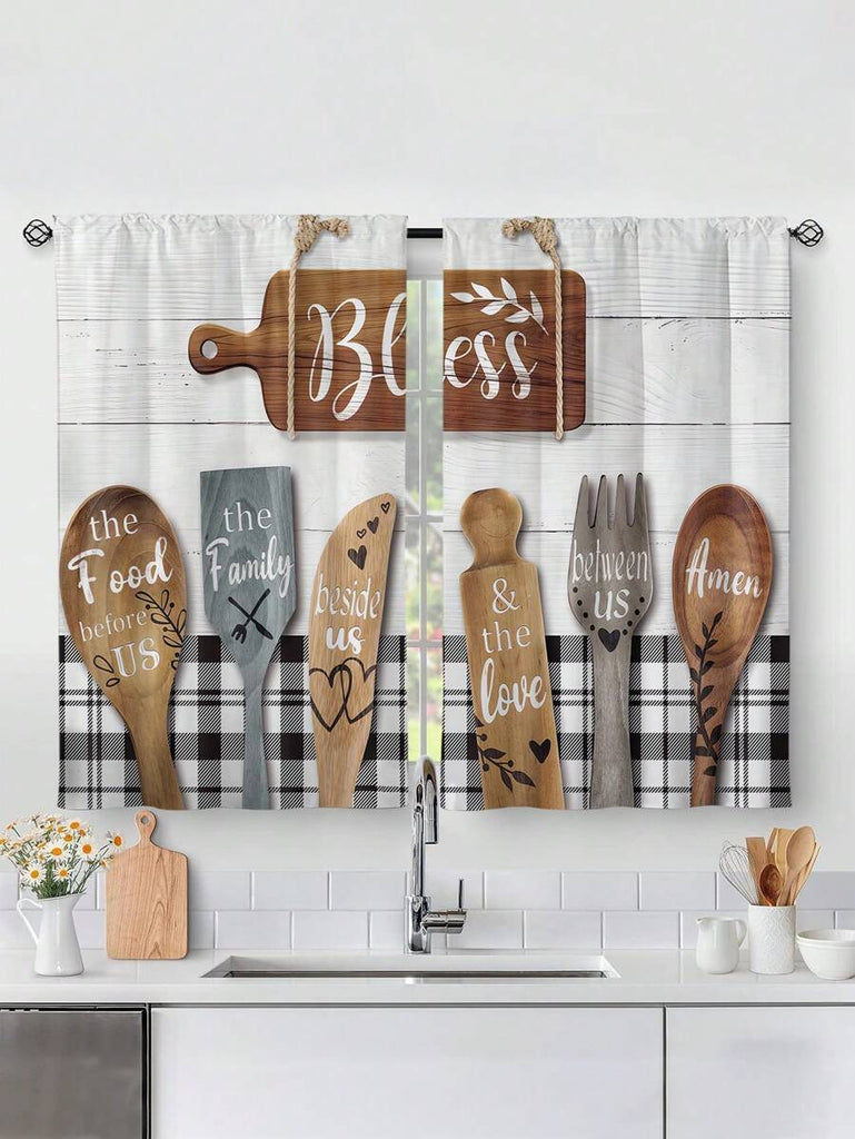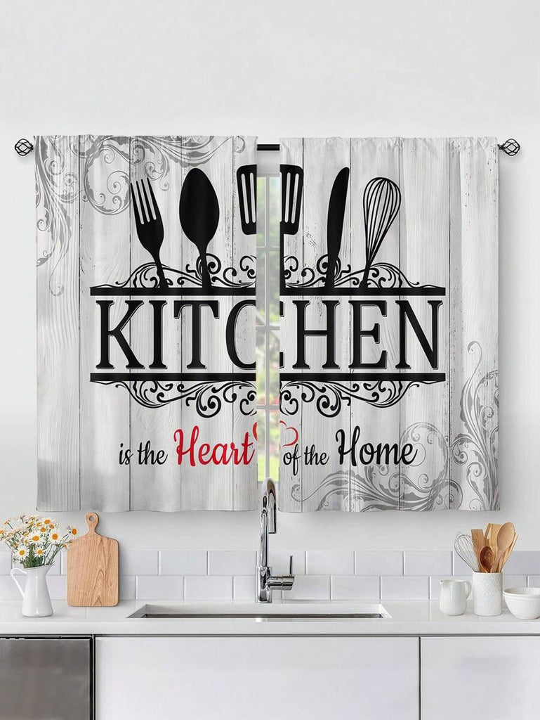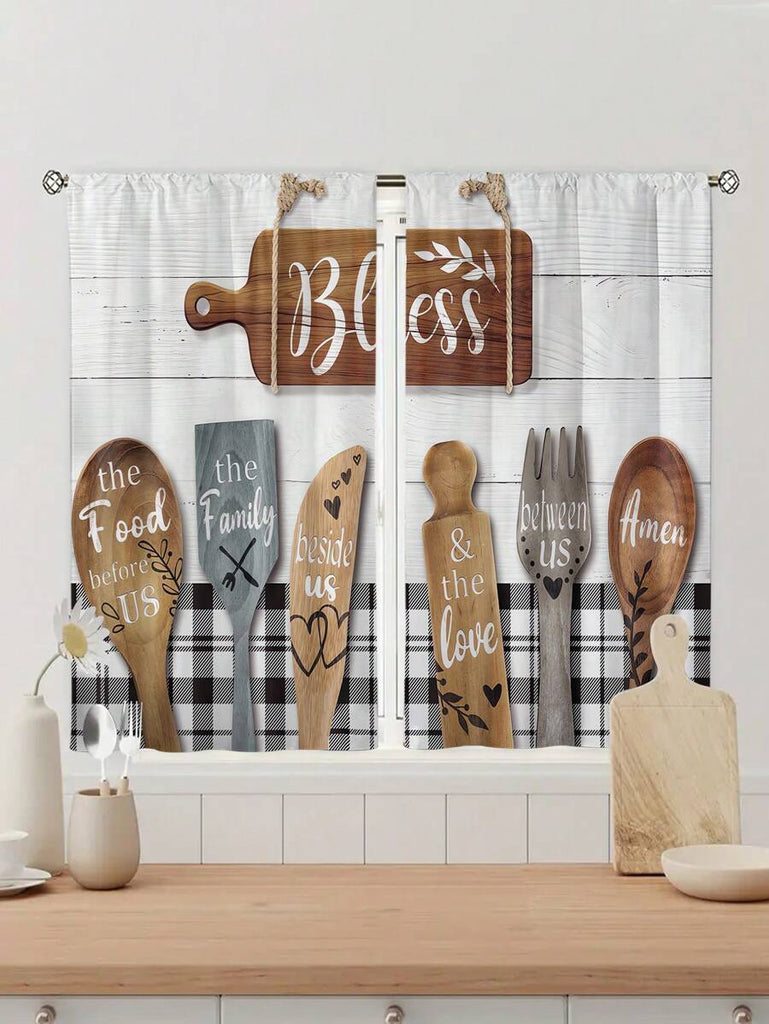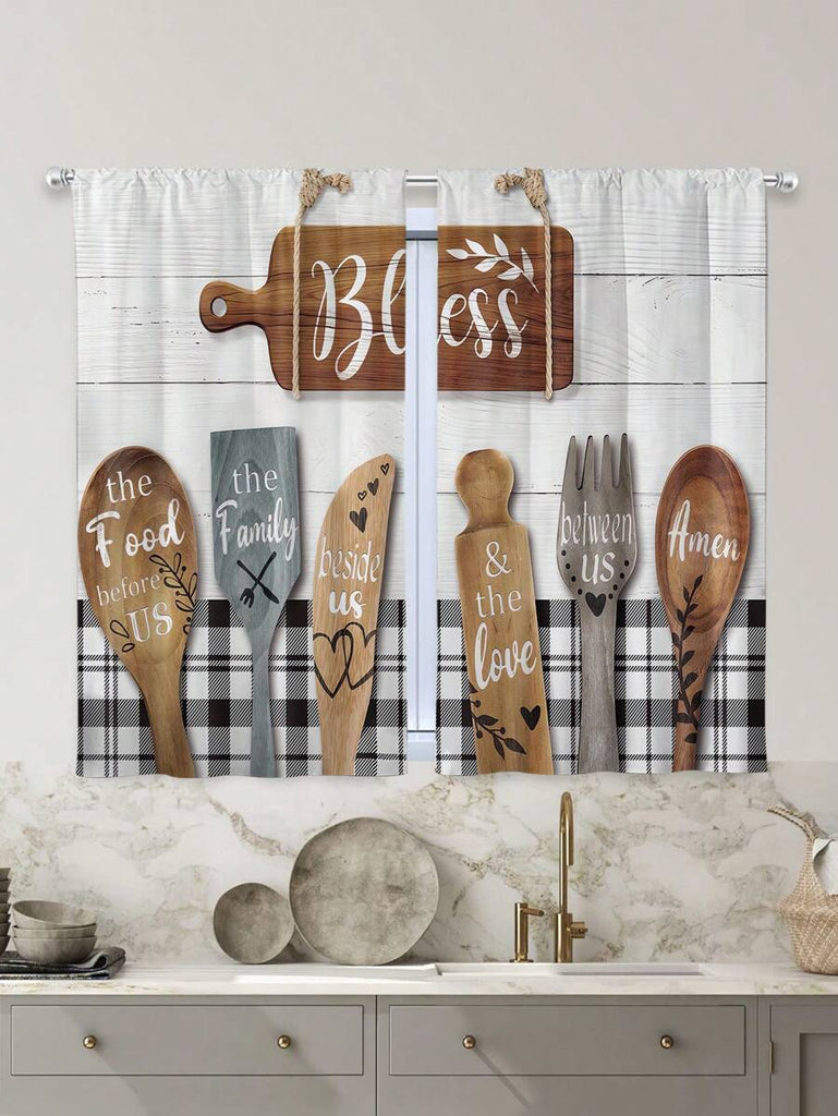 2pcs Retro European Cutlery Printed Kitchen Curtain,Without Holes Curtain, Refer To Bedroom Office Kitchen Living Room Study Home Decor