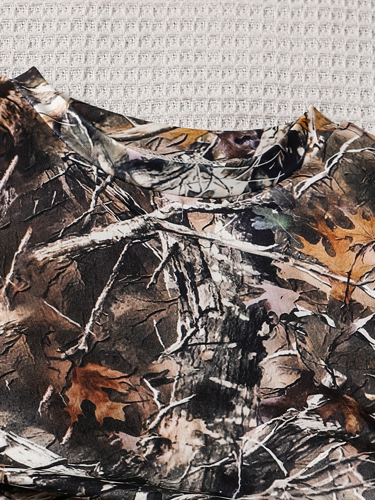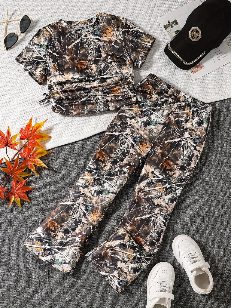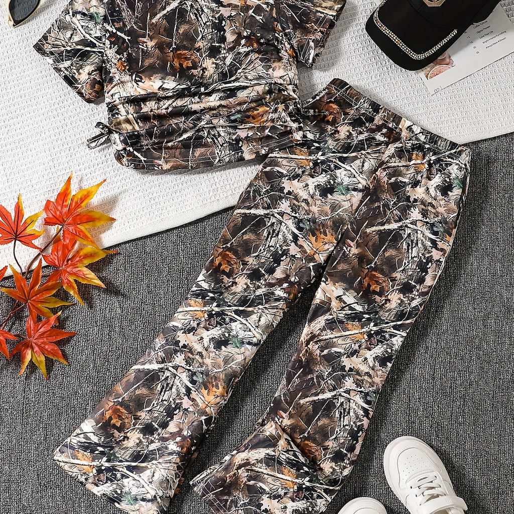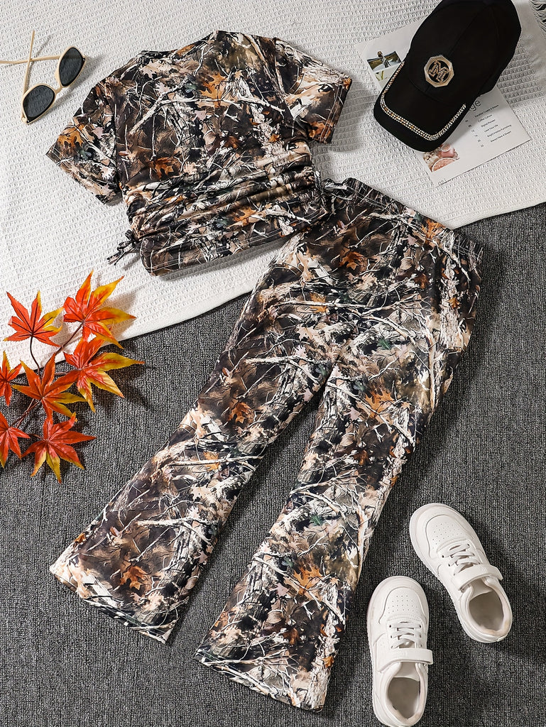 Camouflage Print Comfortable Round Neck Short Sleeve Top and Flare Pants 2pcs Set Suitable for Casual Daily Wear and School, Back-to-School Season, Perfect for Outdoor