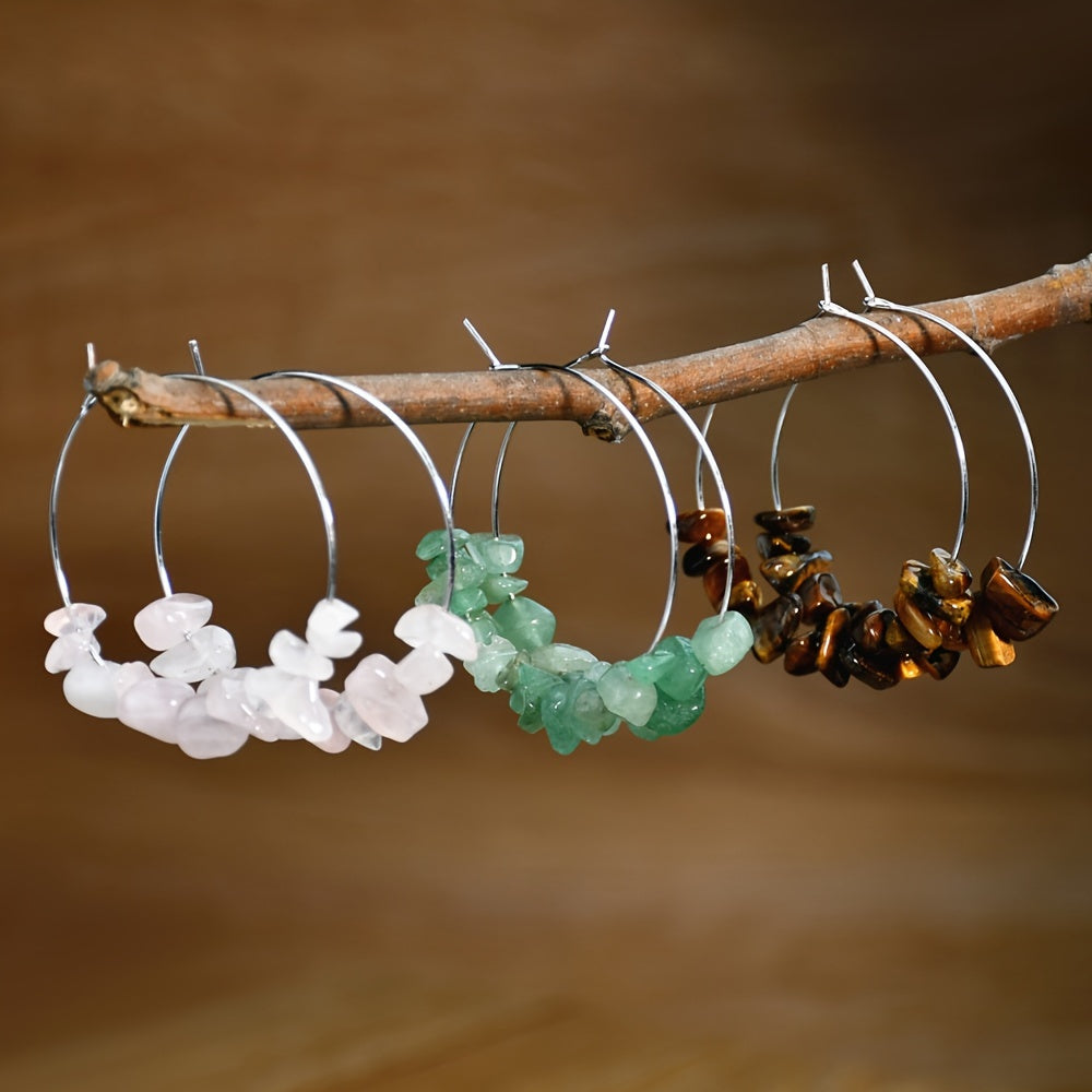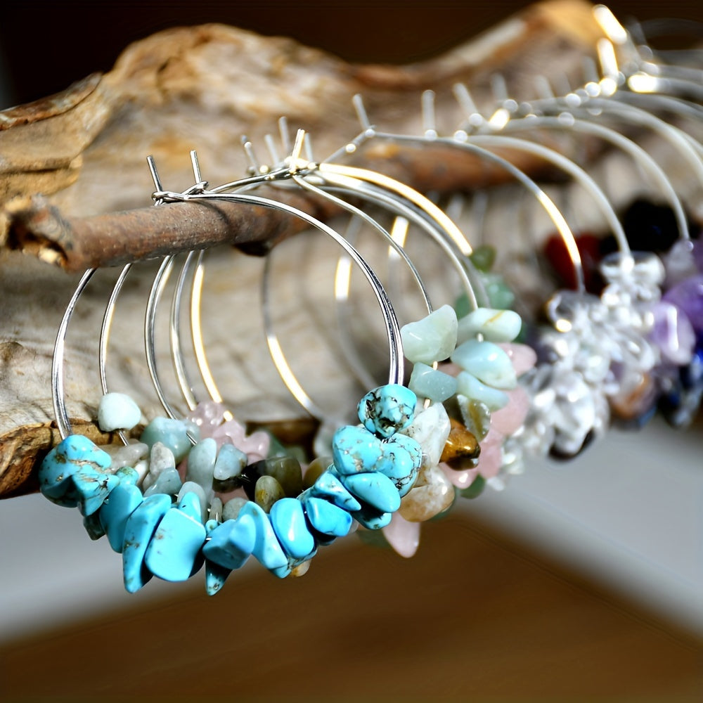 10 Pairs Boho Gemstone Hoop Earrings, Stainless Steel Needle, Natural Stone Gravel, Birthstone December, No Plating, for Daily and Party Wear