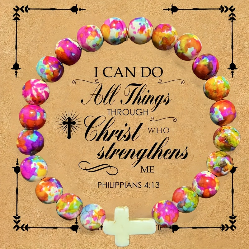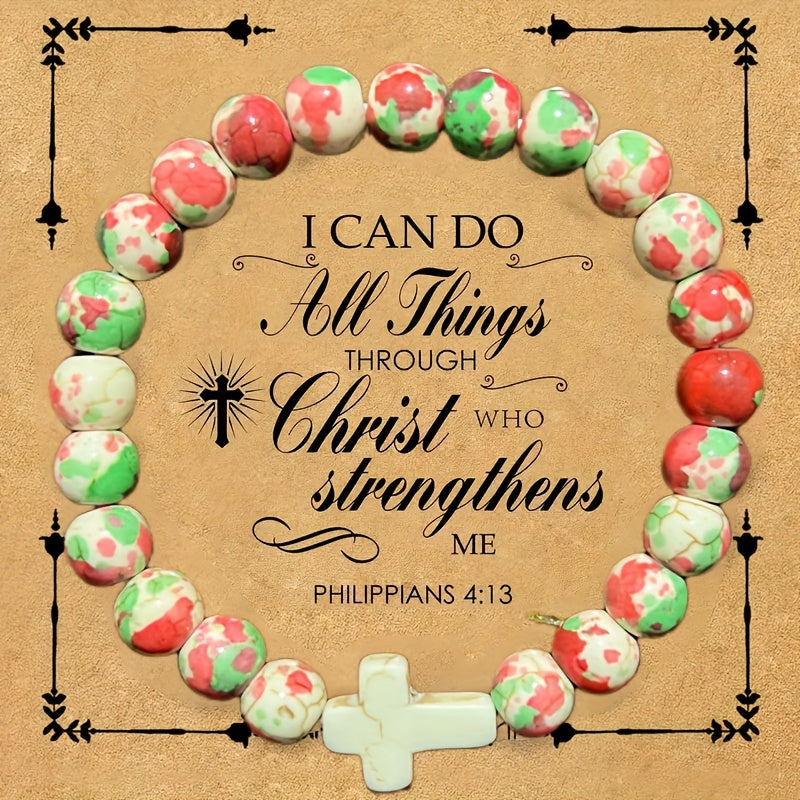1pc Bohemian Style Turquoise Cross Bracelet for Women Christian Religious Jewelry Meaningful Baptism and Holy Communion Gift Elastic Beaded Bracelet Without Card
