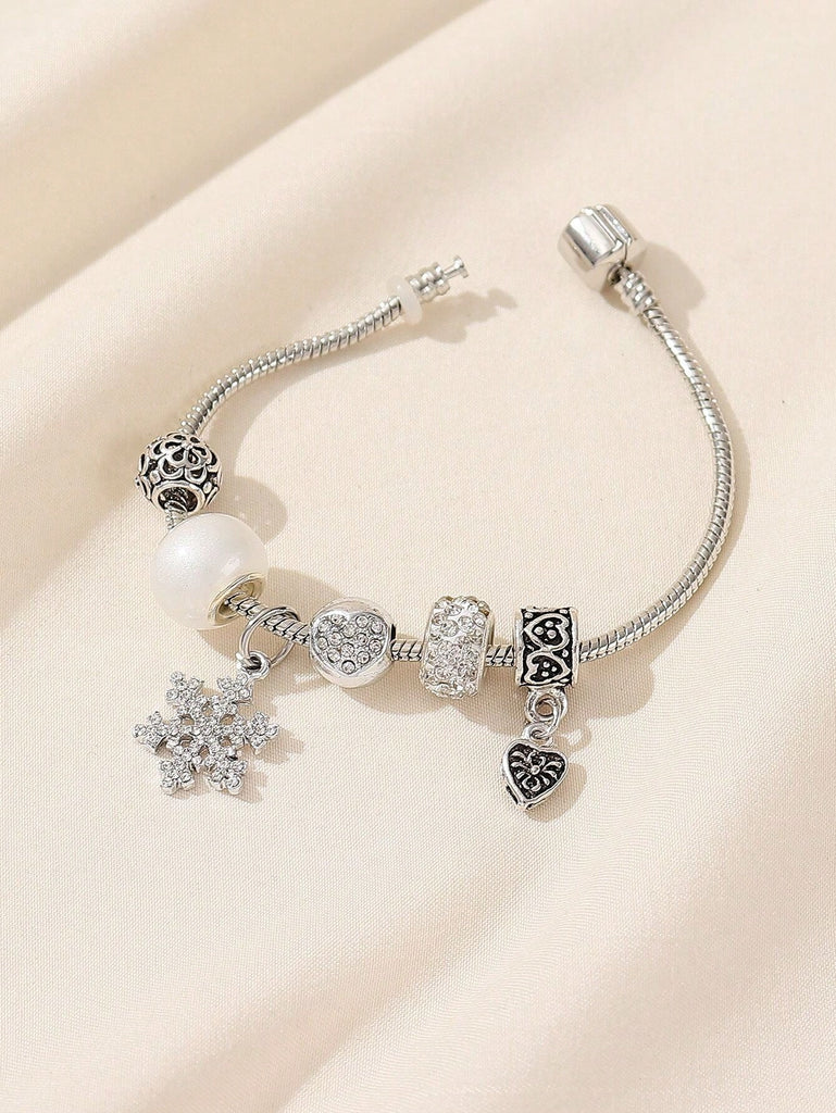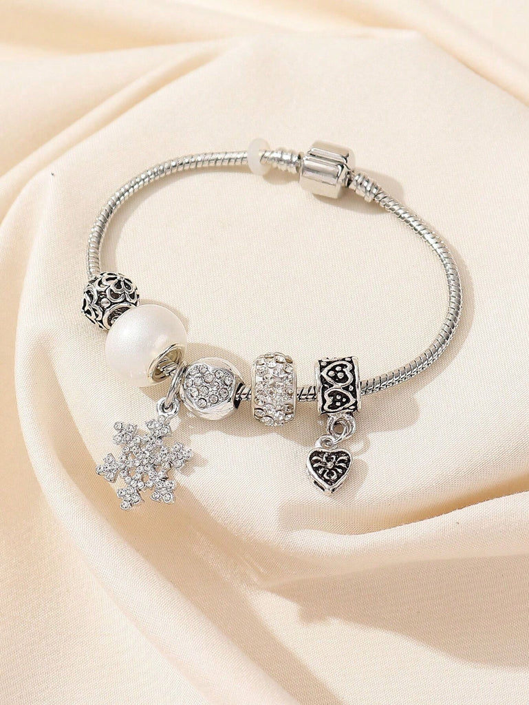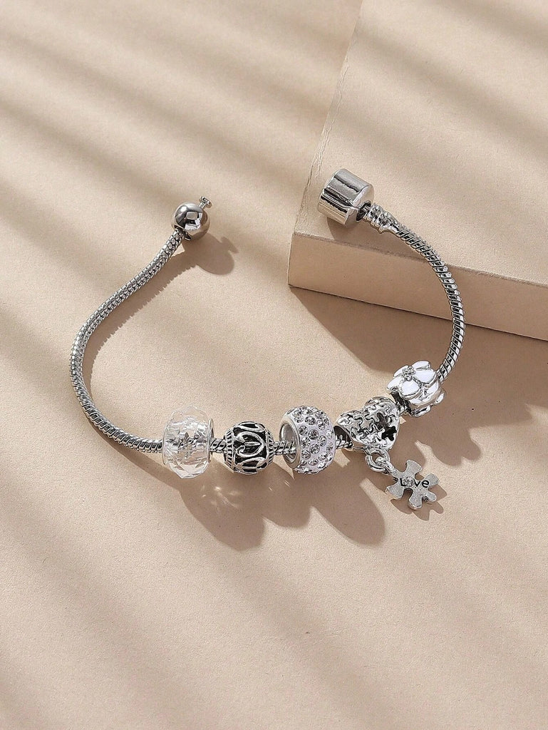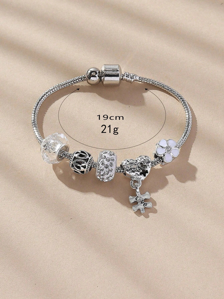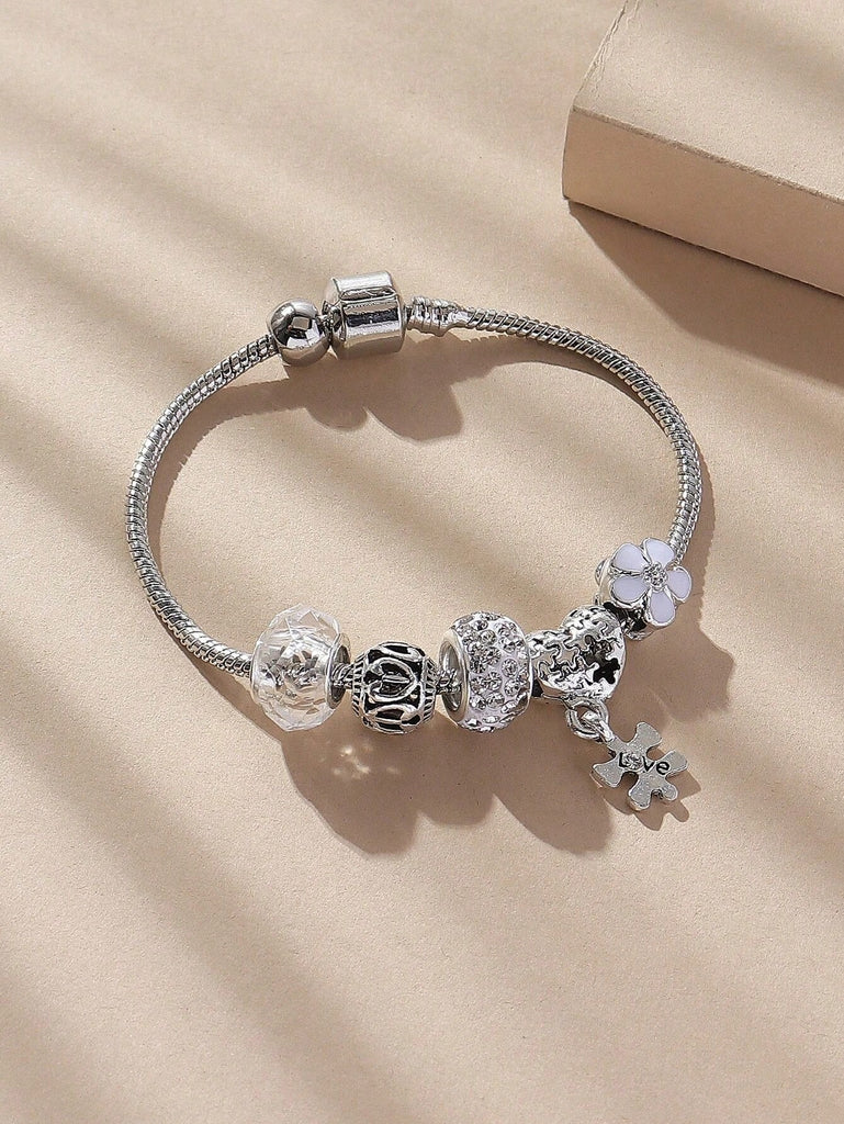 1pc Copper Heart & Flower Shaped Rhinestone Puzzle Charm Bracelet For Women, Cute & Stylish Jewelry, Dating Gift Valentines,Mom,Mother,Mother's Day,Gift