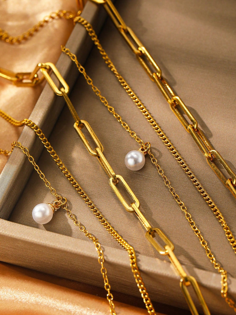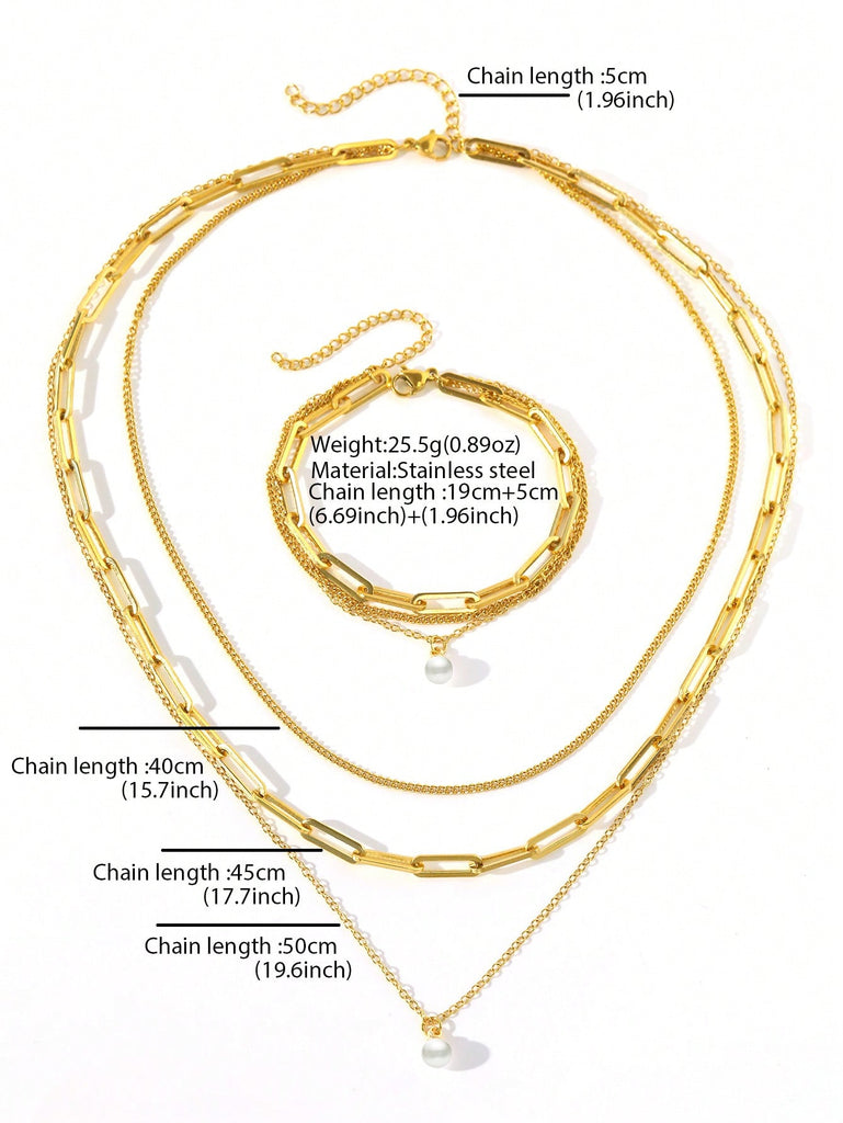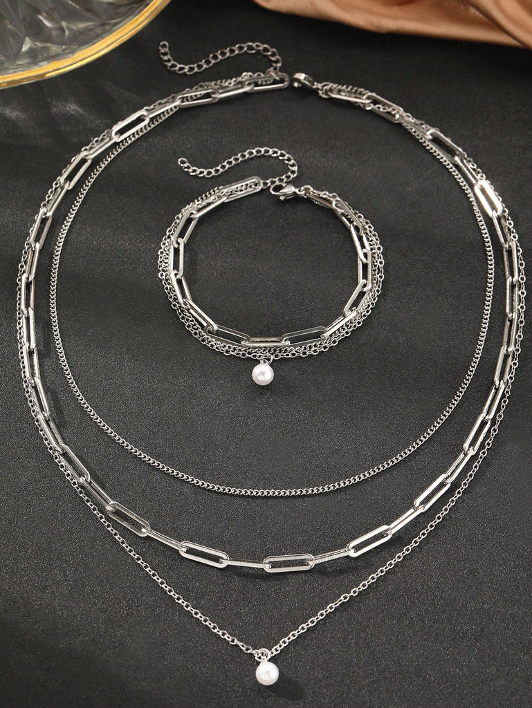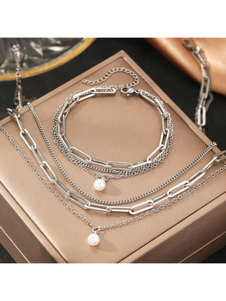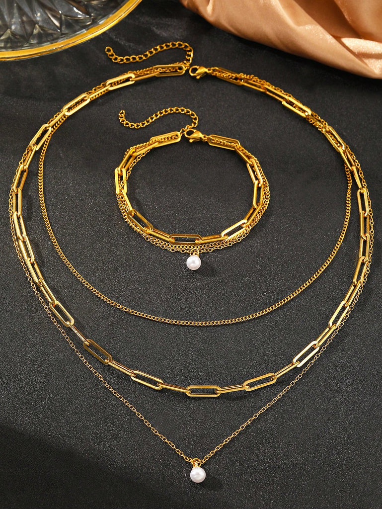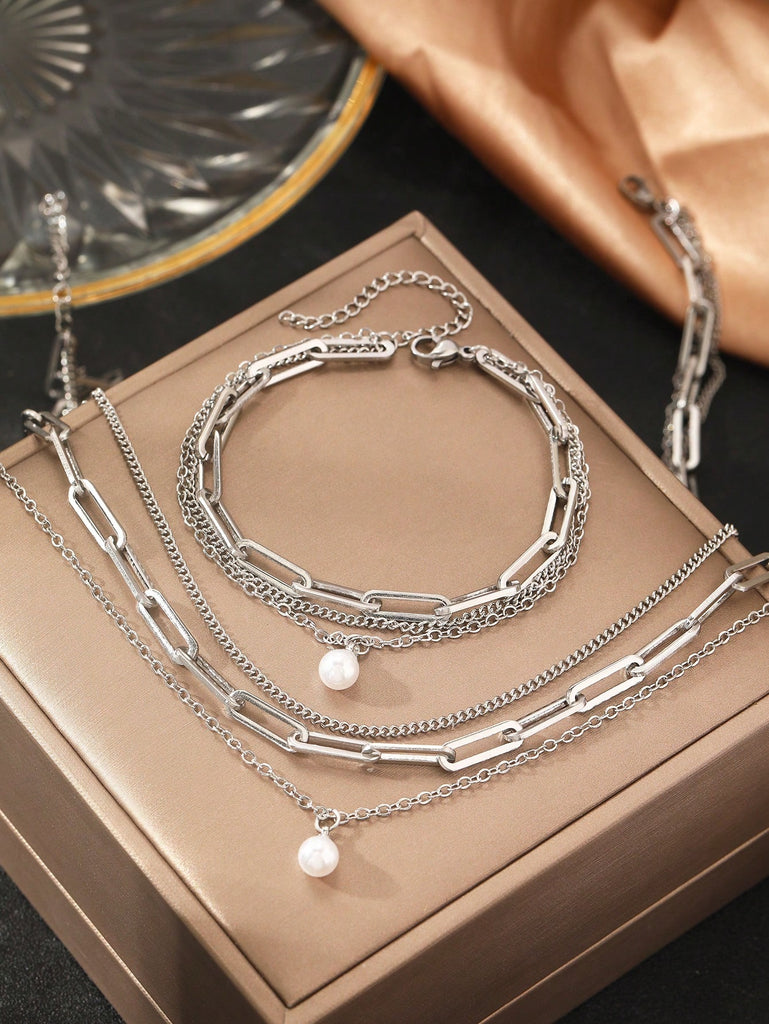 1pc Stainless Steel Multi-Layered Chain Necklace Bracelet Set For Women, Elegant & High-End Accessory Suitable For Everyday Wear