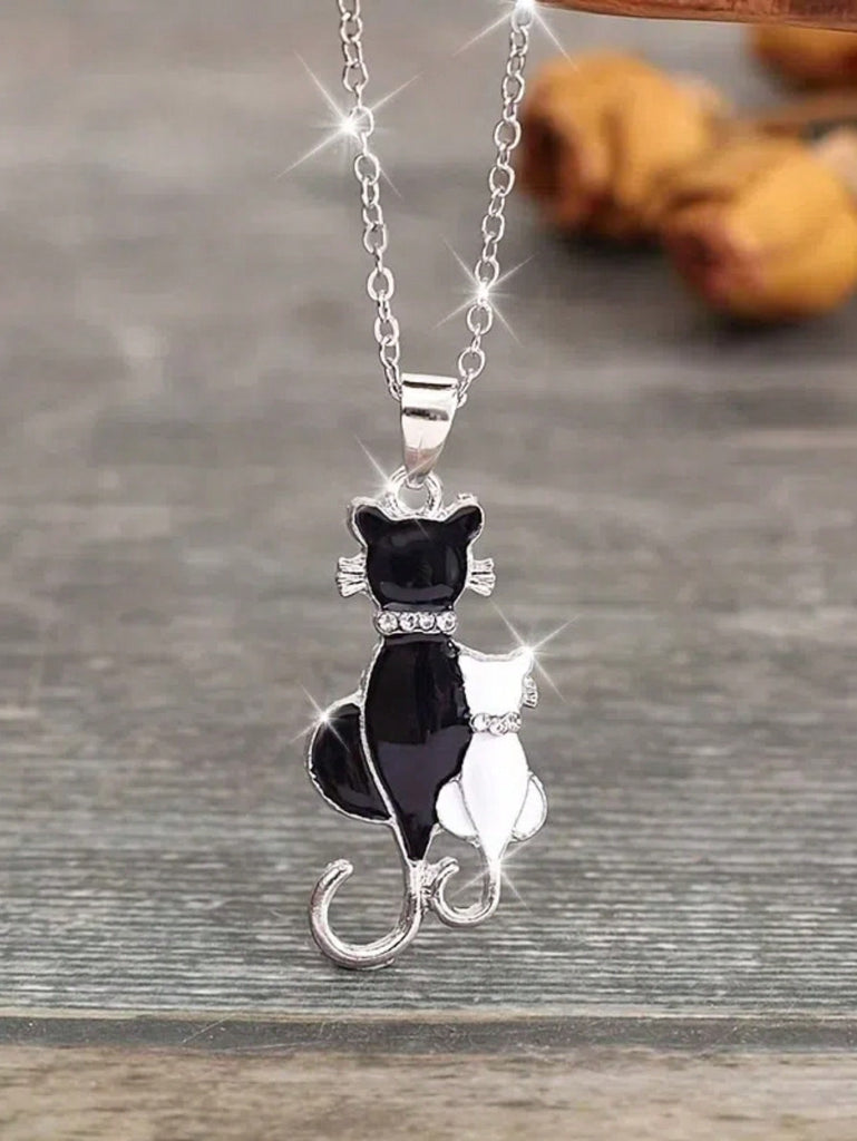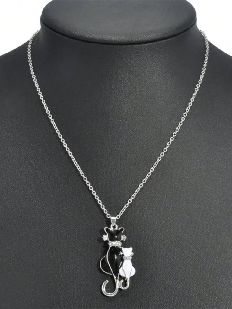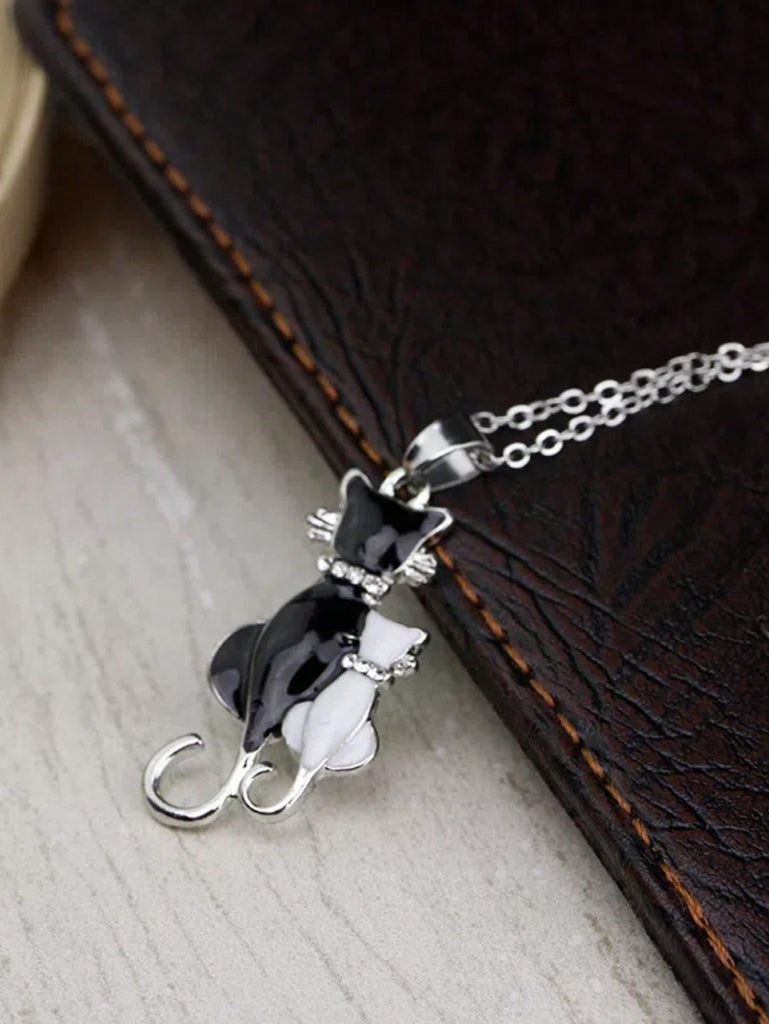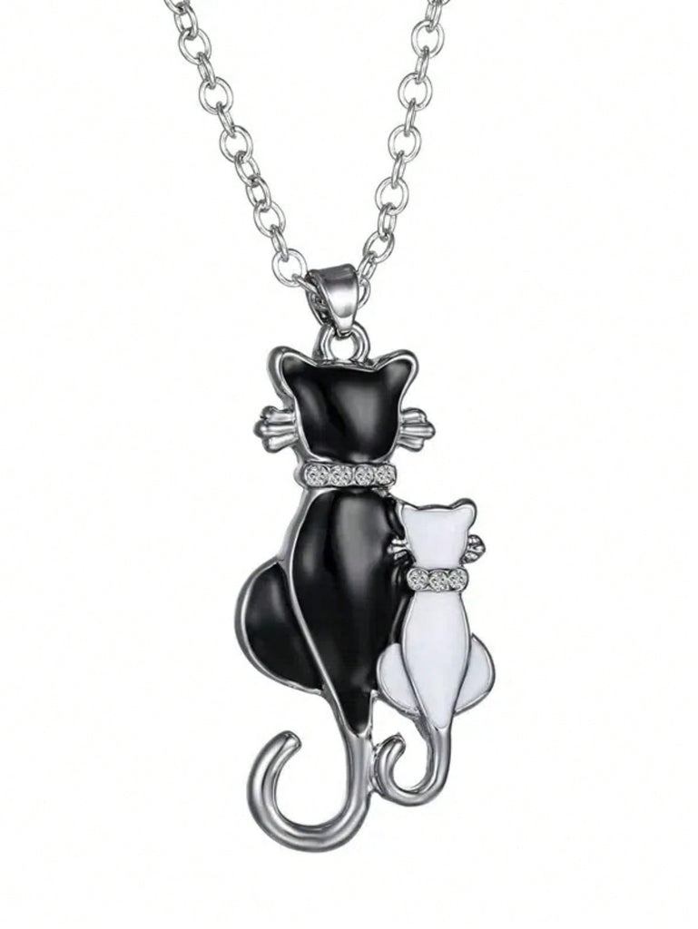 1pc Women's Black & White Kitten Pattern Crystal Decor Pendant Necklace