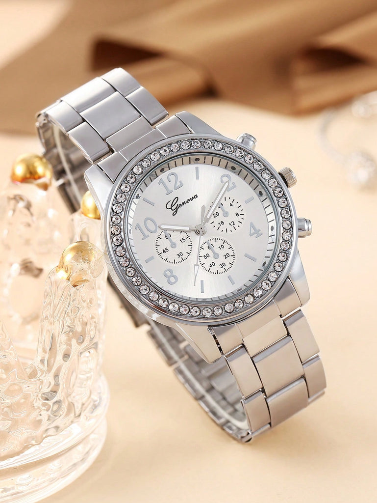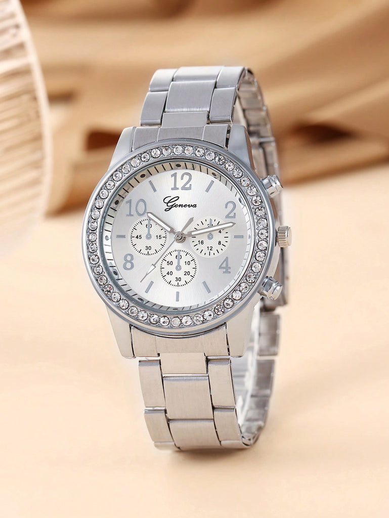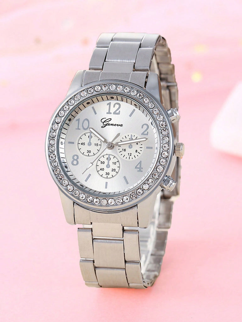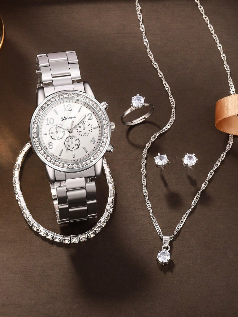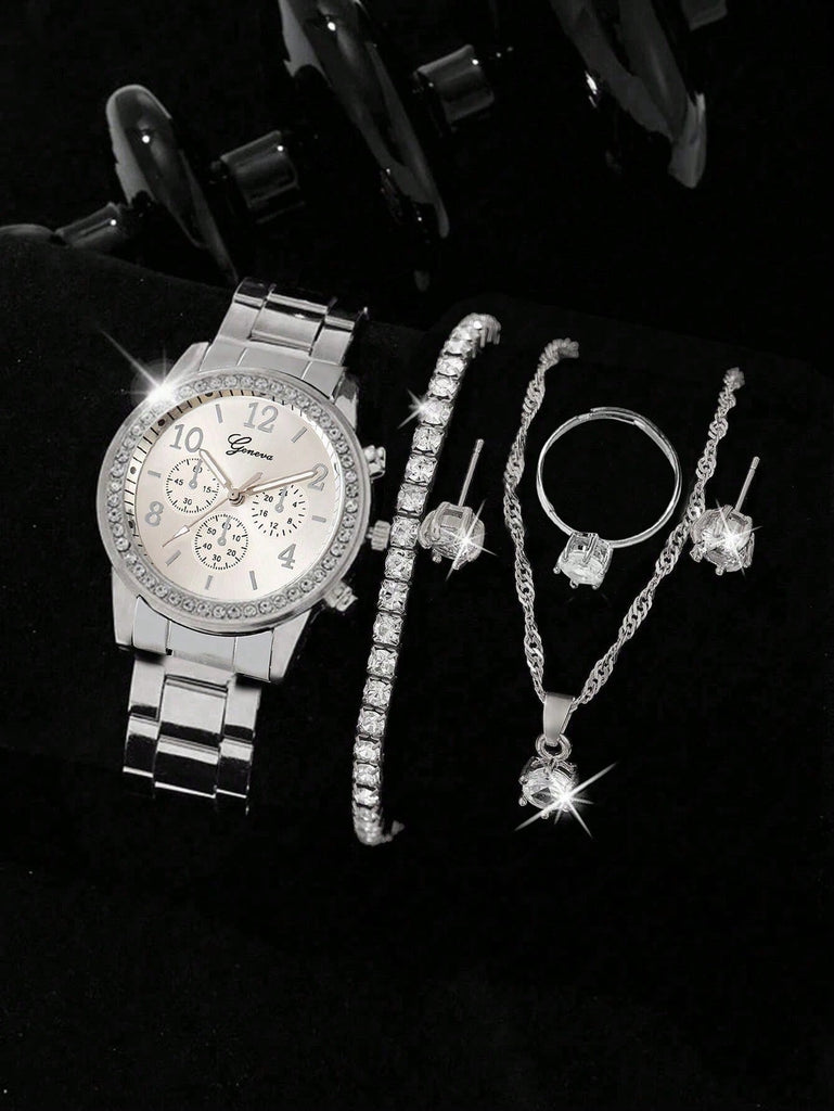 1pc Women's Fashionable Stainless Steel Rhinestone Watch And 5pcs Rhinestone Jewelry Set Gift Holiday As A Gift For Students Returning To School