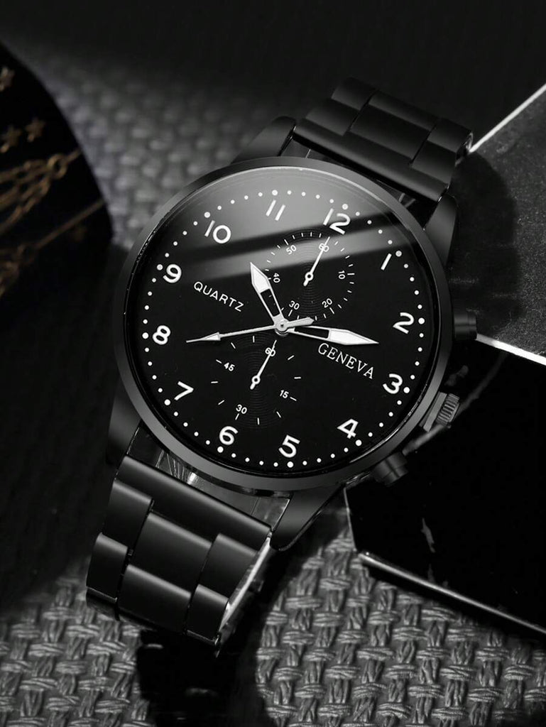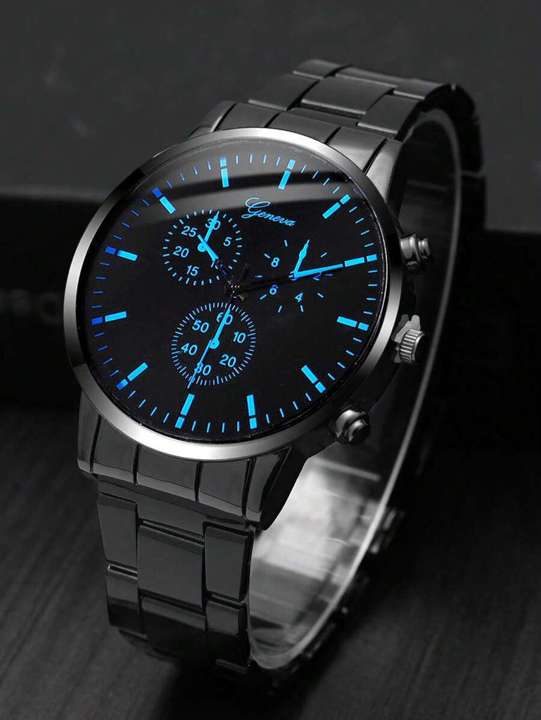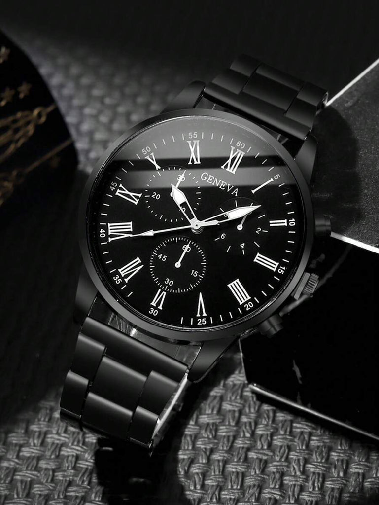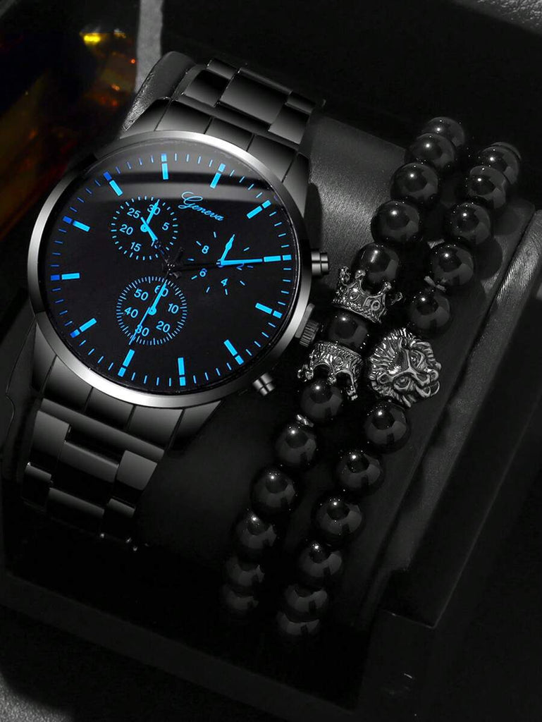 3pcs Fashionable And Versatile Men's Quartz Watch, Round Dial, Alloy Steel Strip, Paired With Crown Bead Bracelet Set, The Best Gift For Men, Suitable For Holiday Gifts And Daily Wear
