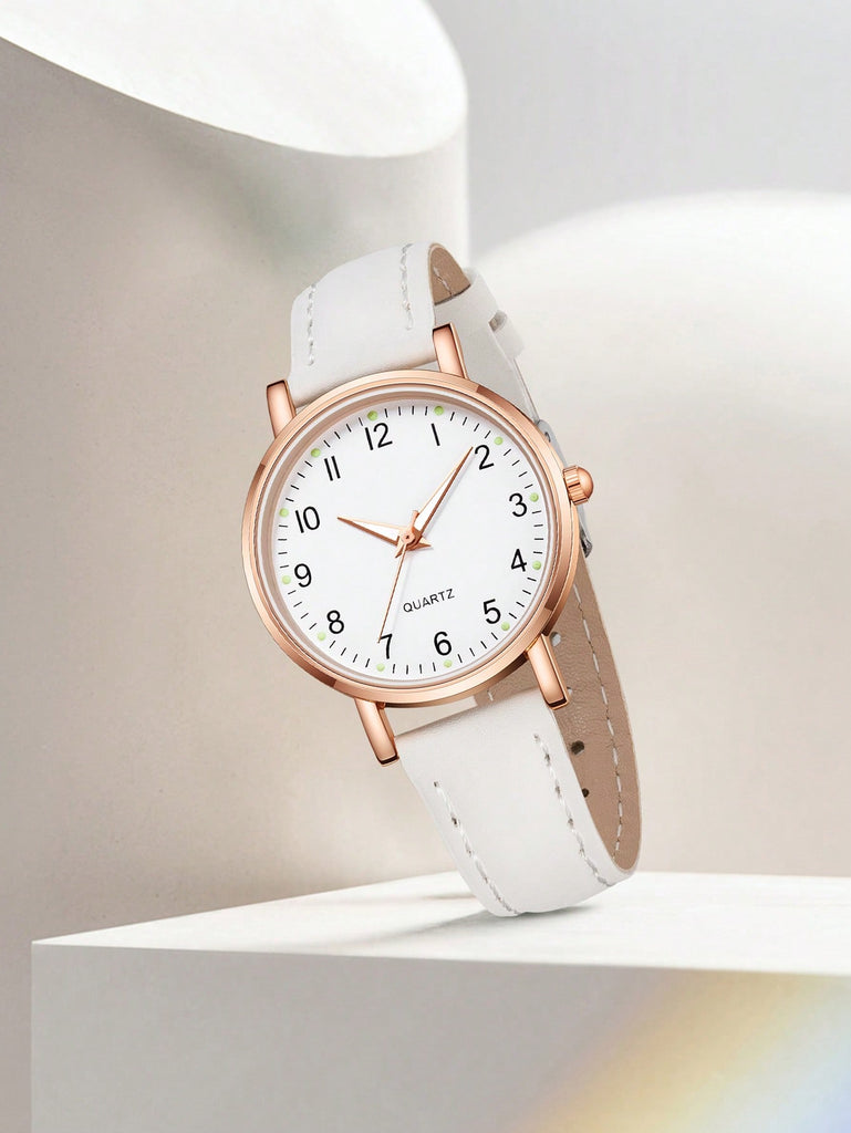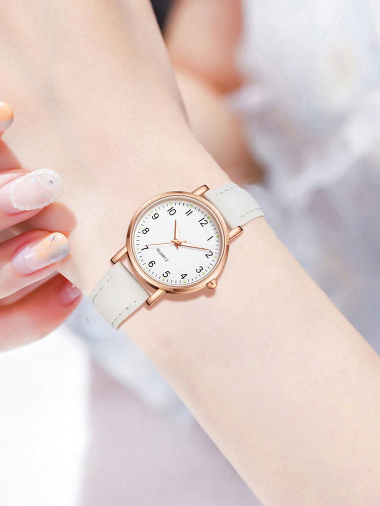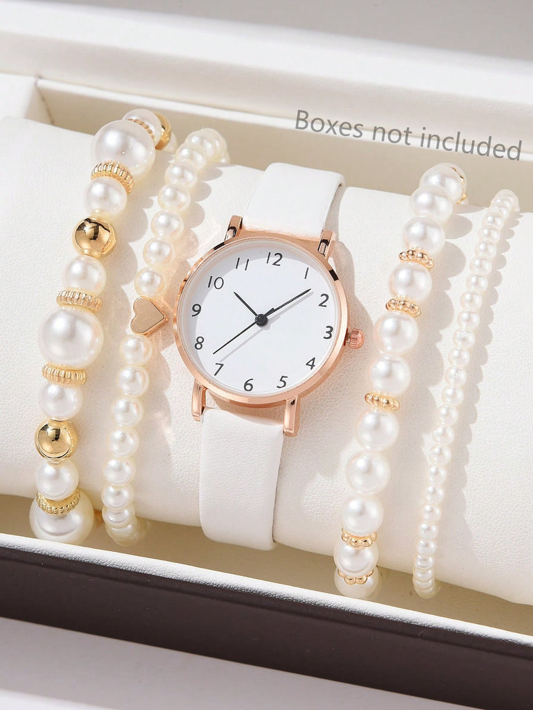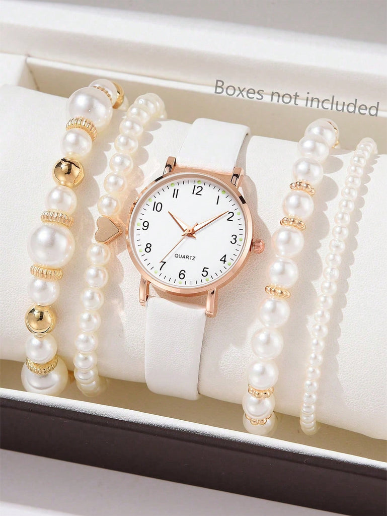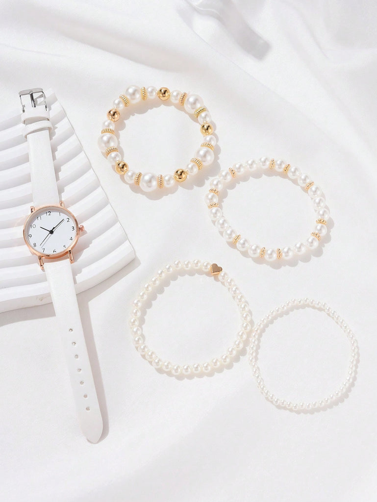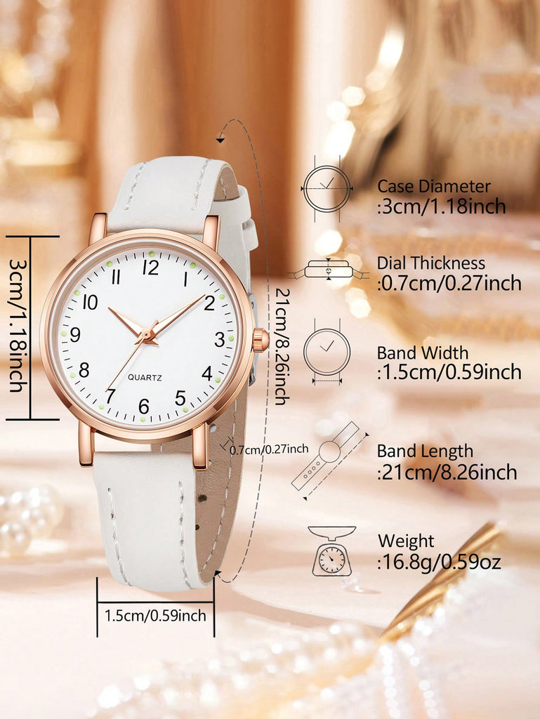 5-Piece Women's White Strap Fashionable And Simple Arabic Numeral Scale Quartz Watch Bracelet Jewelry Set Suitable For Daily Wear Decoration Or Holiday Gifts