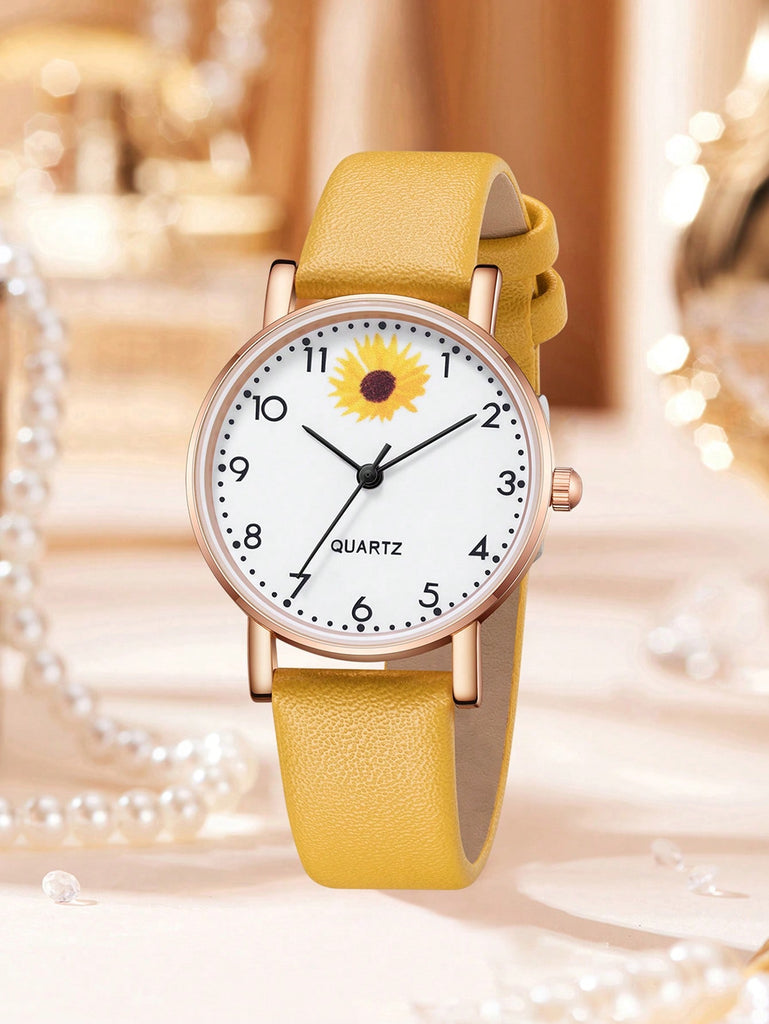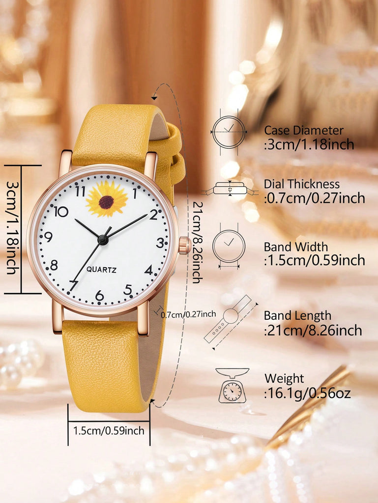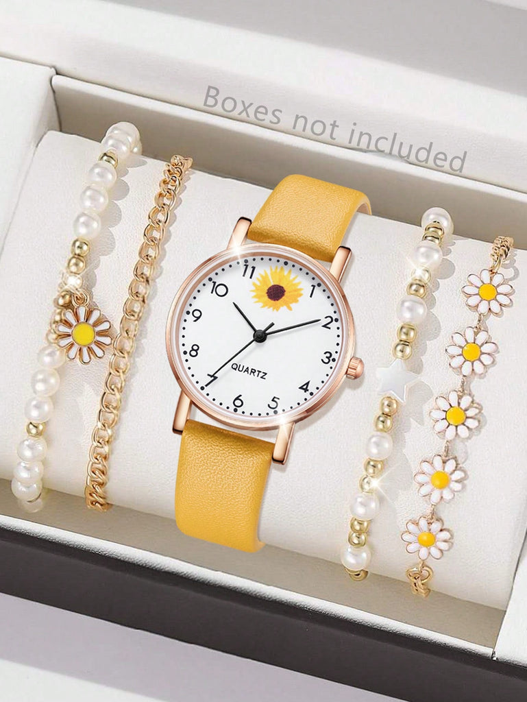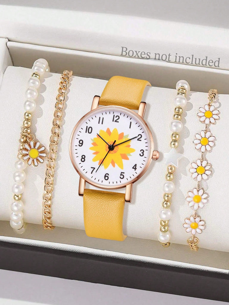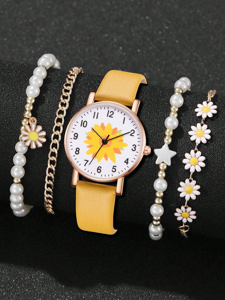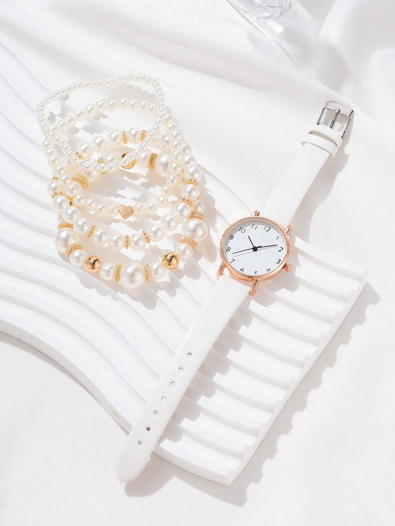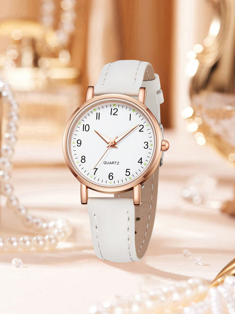 5-Piece Women's White Strap Fashionable And Simple Arabic Numeral Scale Quartz Watch Bracelet Jewelry Set Suitable For Daily Wear Decoration Or Holiday Gifts