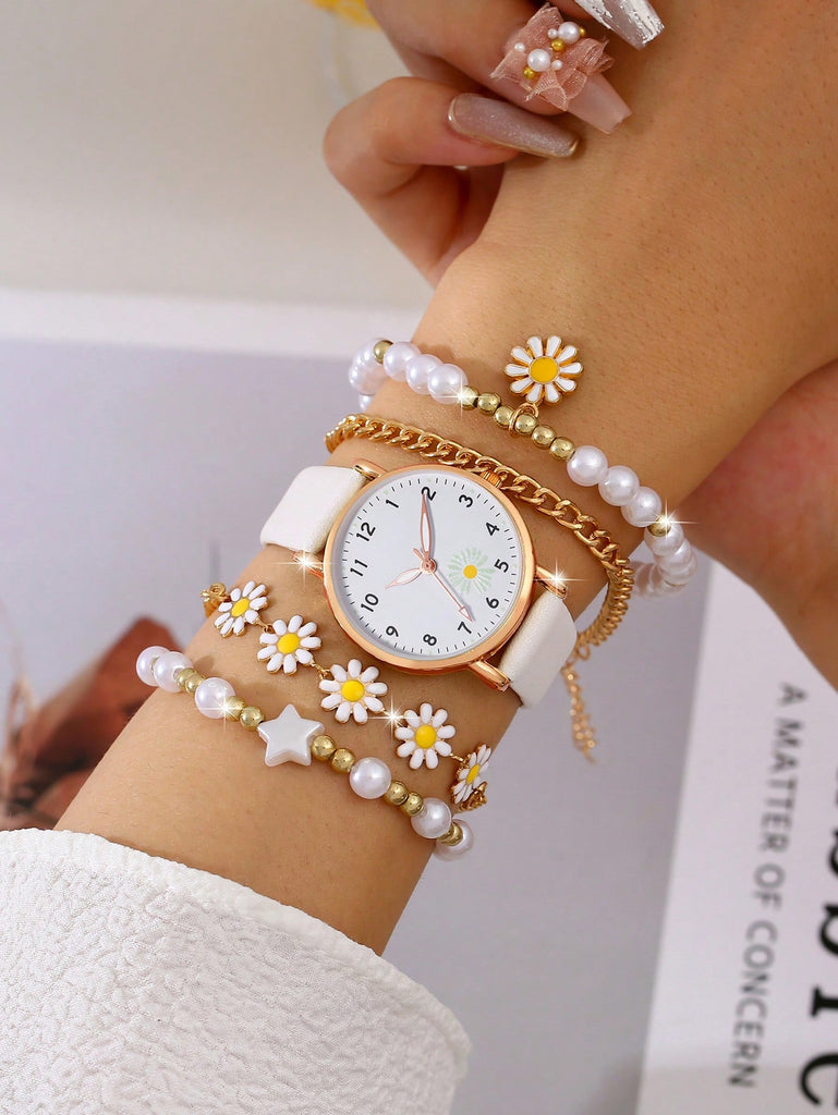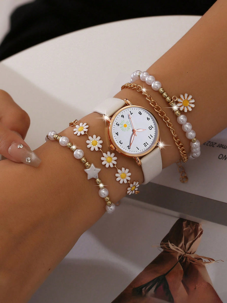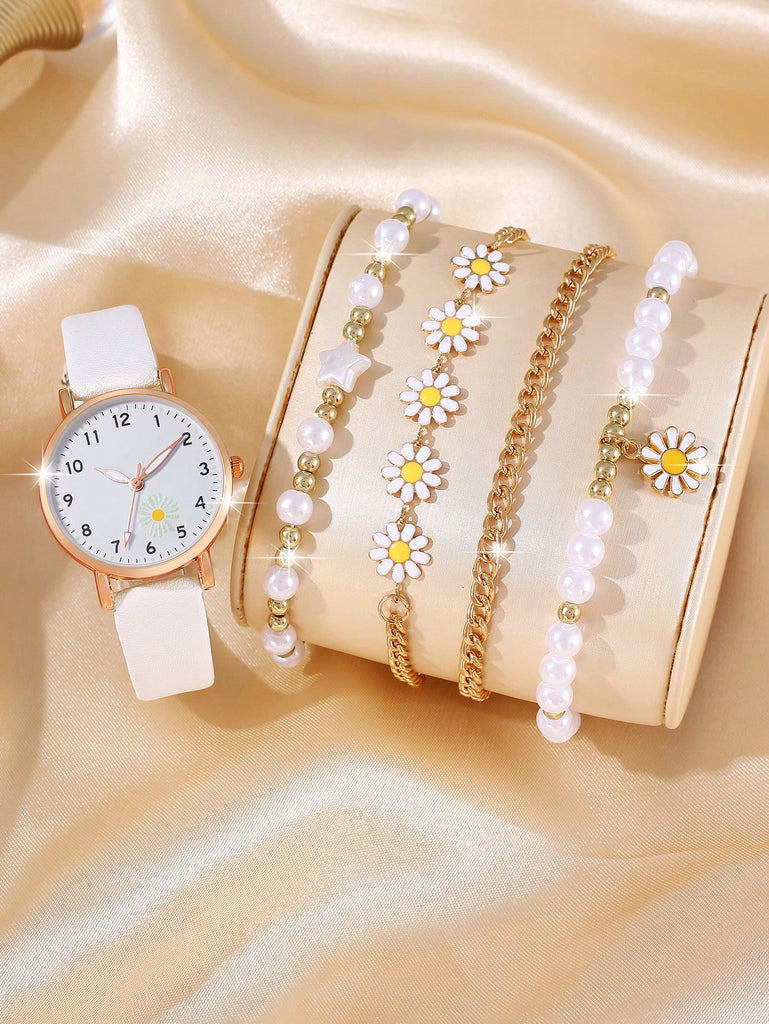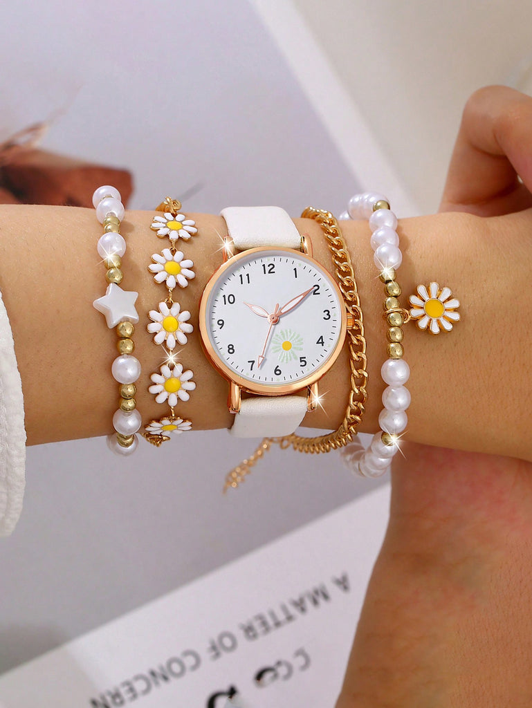 5pcs Ladies Watch Women Watch PU Leather Strap With Flower Details Round Pointer Quartz Watch And Holiday Daisy Bracelet Watch Set Suitable For Daily Wear, Back-To-School Season, Graduation Season, Thanksgiving, Couples, The Best Gifts