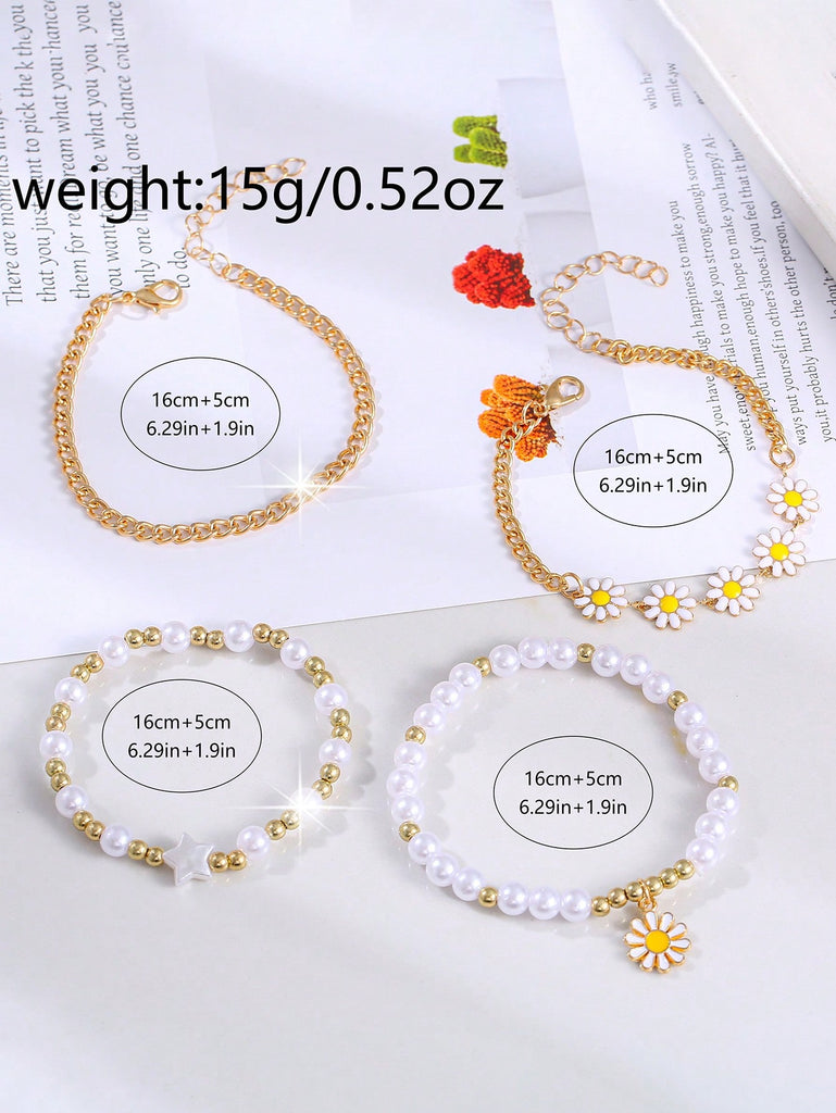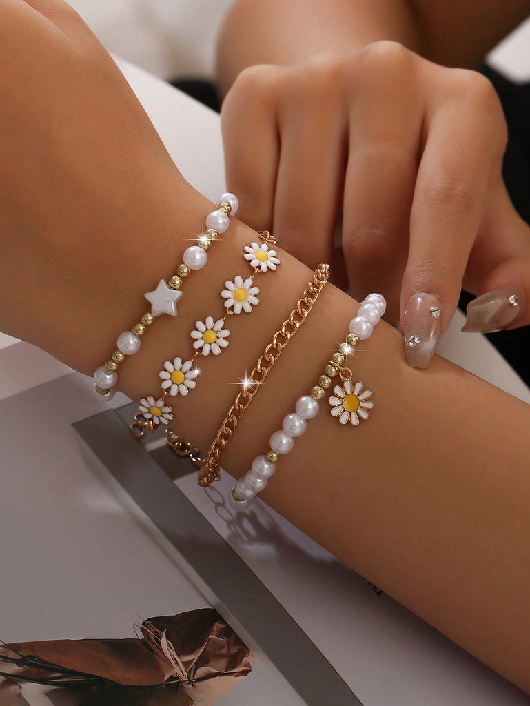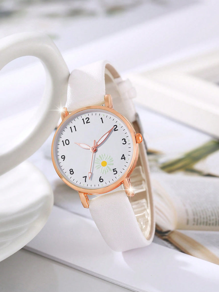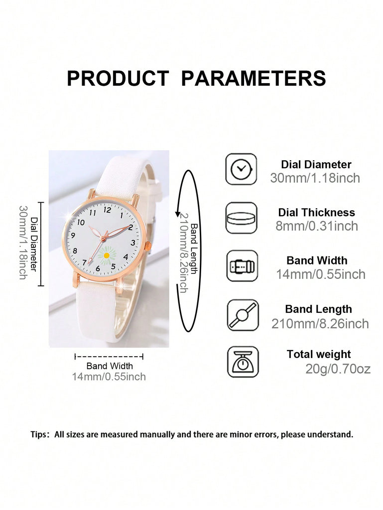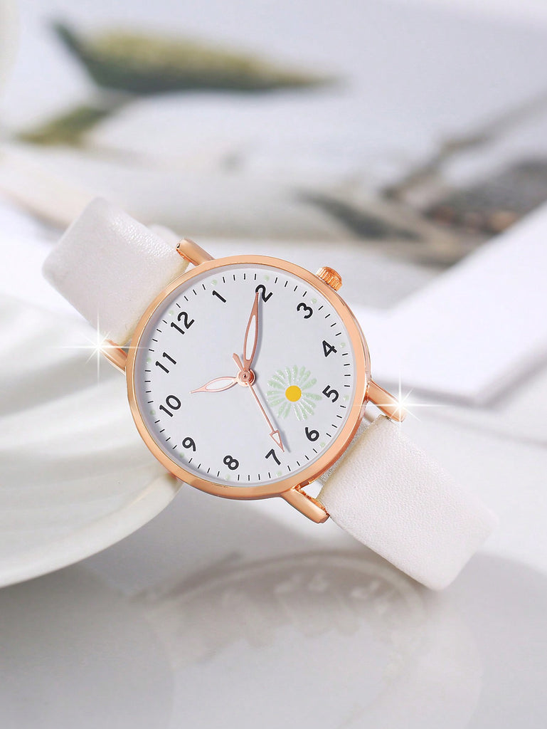 5pcs Ladies Watch Women Watch PU Leather Strap With Flower Details Round Pointer Quartz Watch And Holiday Daisy Bracelet Watch Set Suitable For Daily Wear, Back-To-School Season, Graduation Season, Thanksgiving, Couples, The Best Gifts