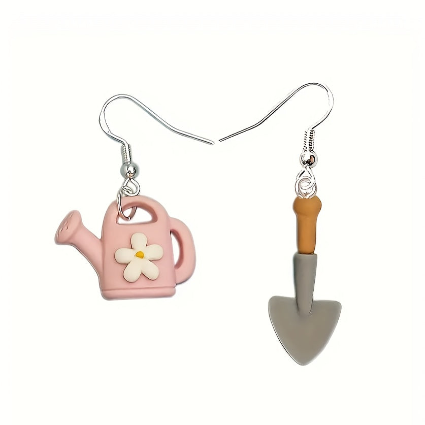 A Pair of Gardening Tool Earrings, Asymmetrical Earrings. Cute Watering Can And Shovel Design, Novel Resin Pendant Earrings, Unique Women'S Fashion Accessory