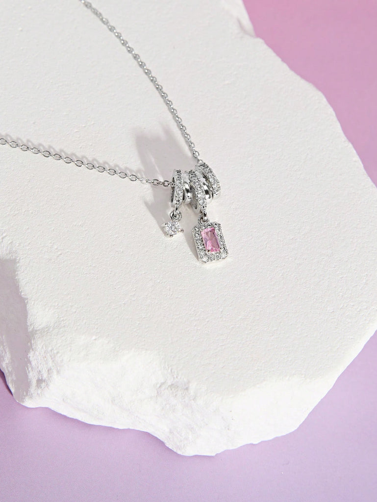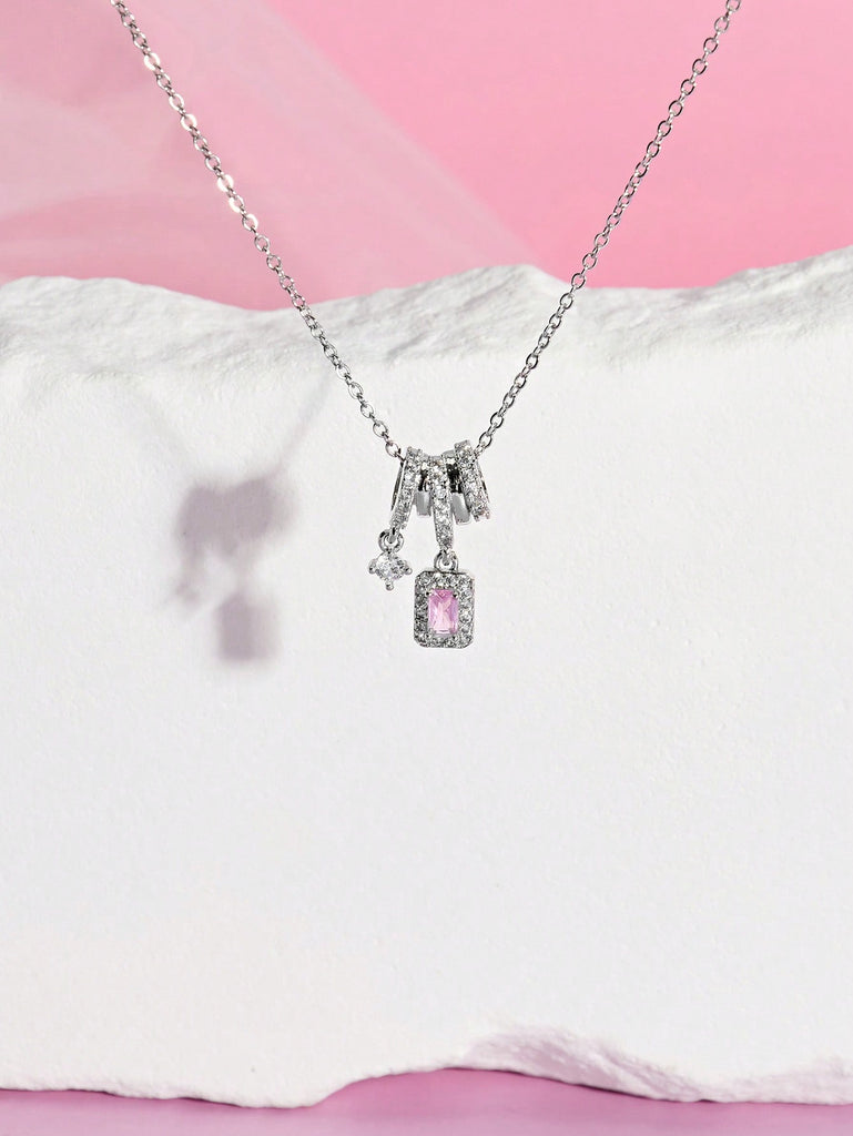 DareSee 1pc Stainless Steel Pink Square Zirconia Star Decor Necklace, Silver Curved Shape Frame With Purple Square Zirconia Titanium Steel Pendant, Suitable For Mother's Day Gift And Women's Daily Wear MusicFest Y2KFest