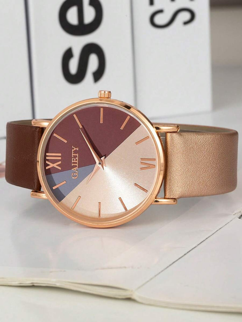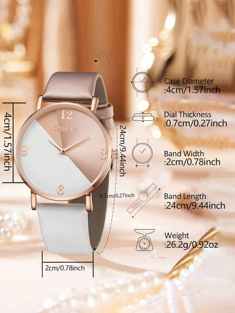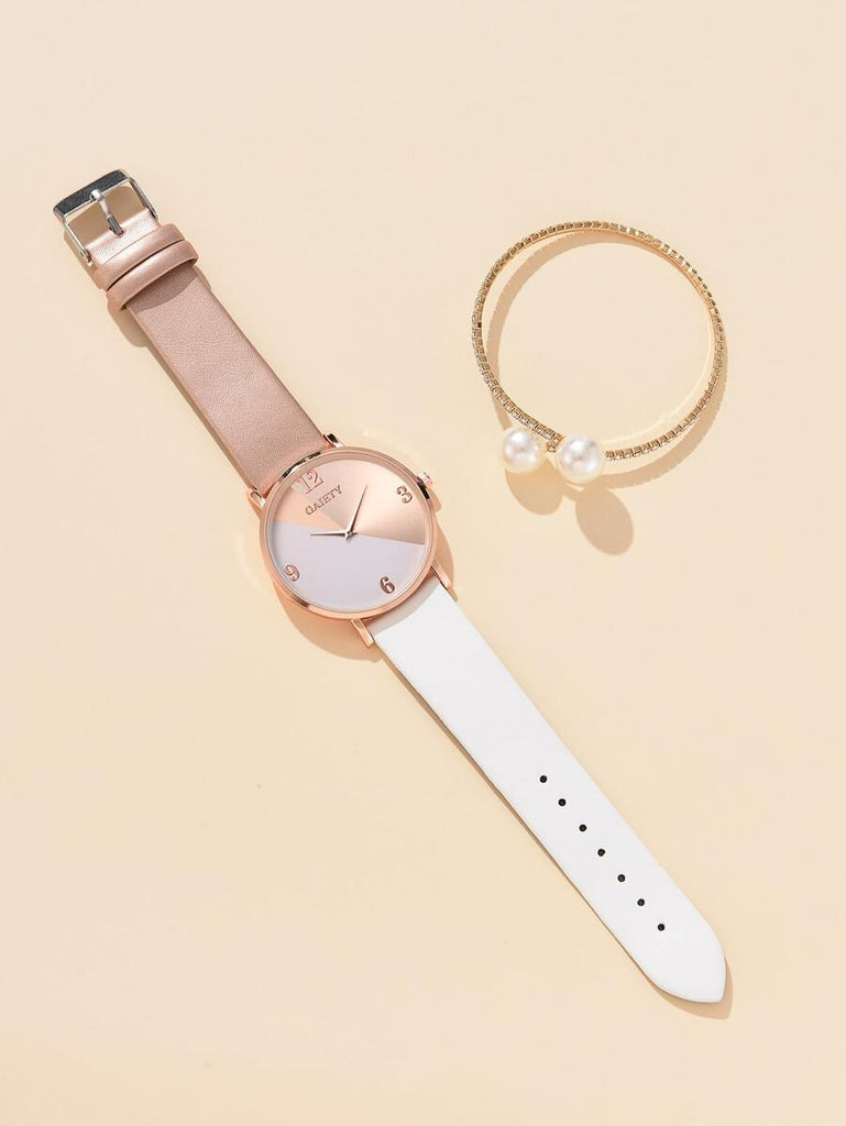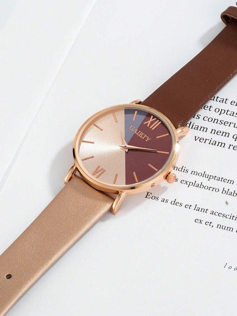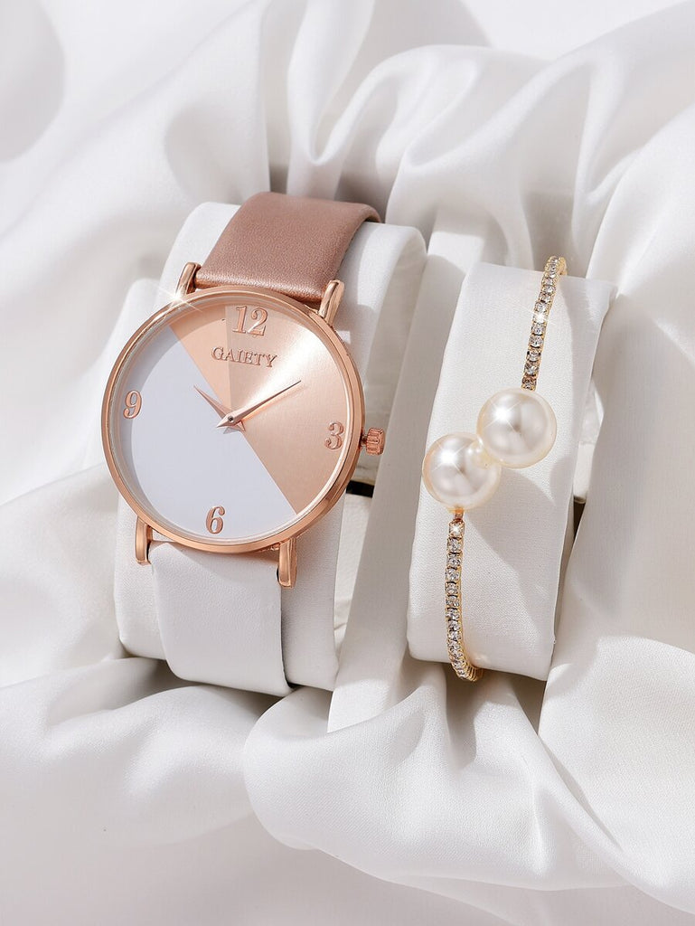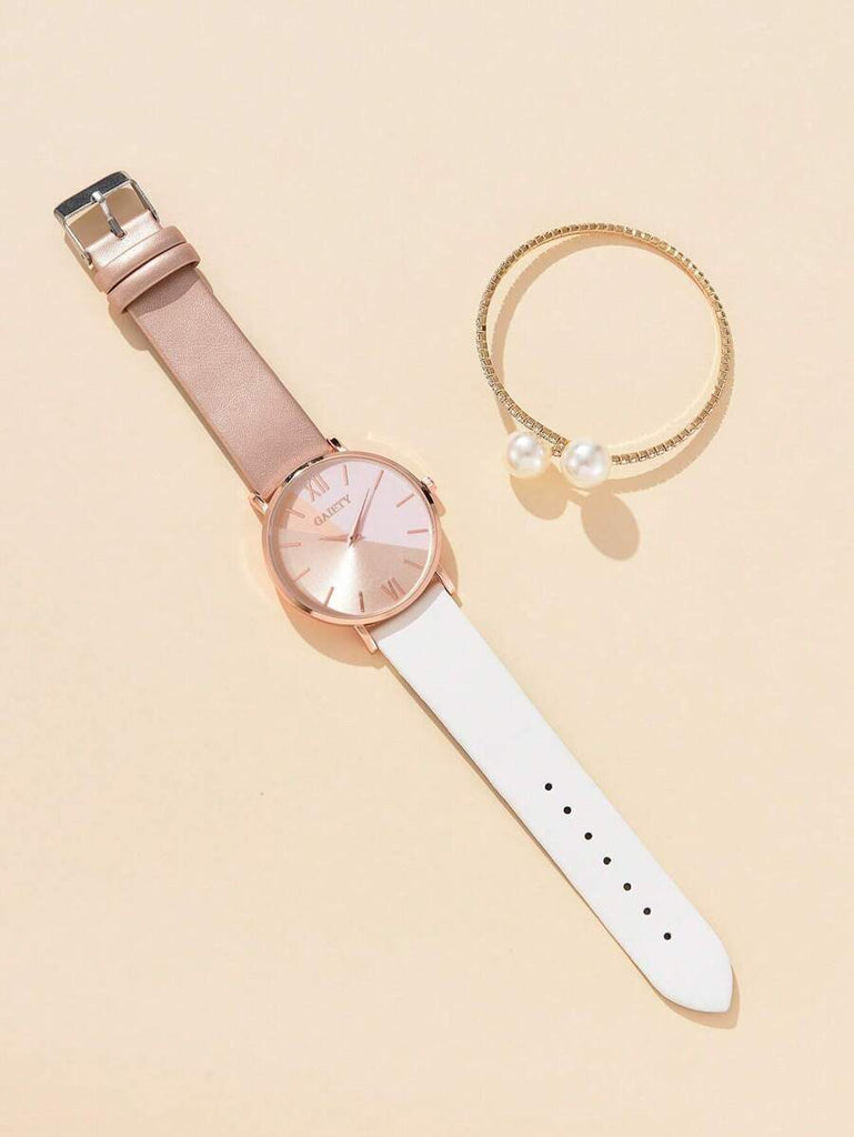 GAIETY 1pc Ladies Watch Women Khaki & Coffee Brown PU Polyurethane Strap Fashion Round Dial Quartz Watch & 1pc Zinc Alloy Rhinestone Faux Pearl Decor Bangle Bracelet, For Daily Life Holiday