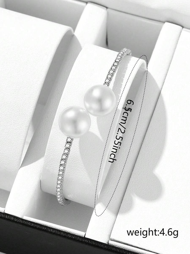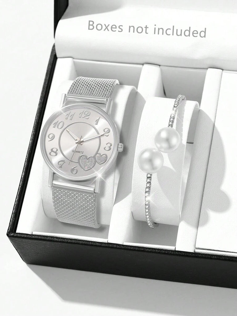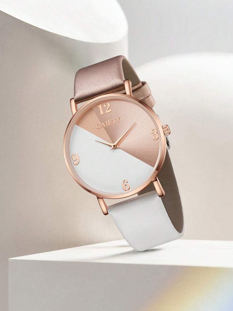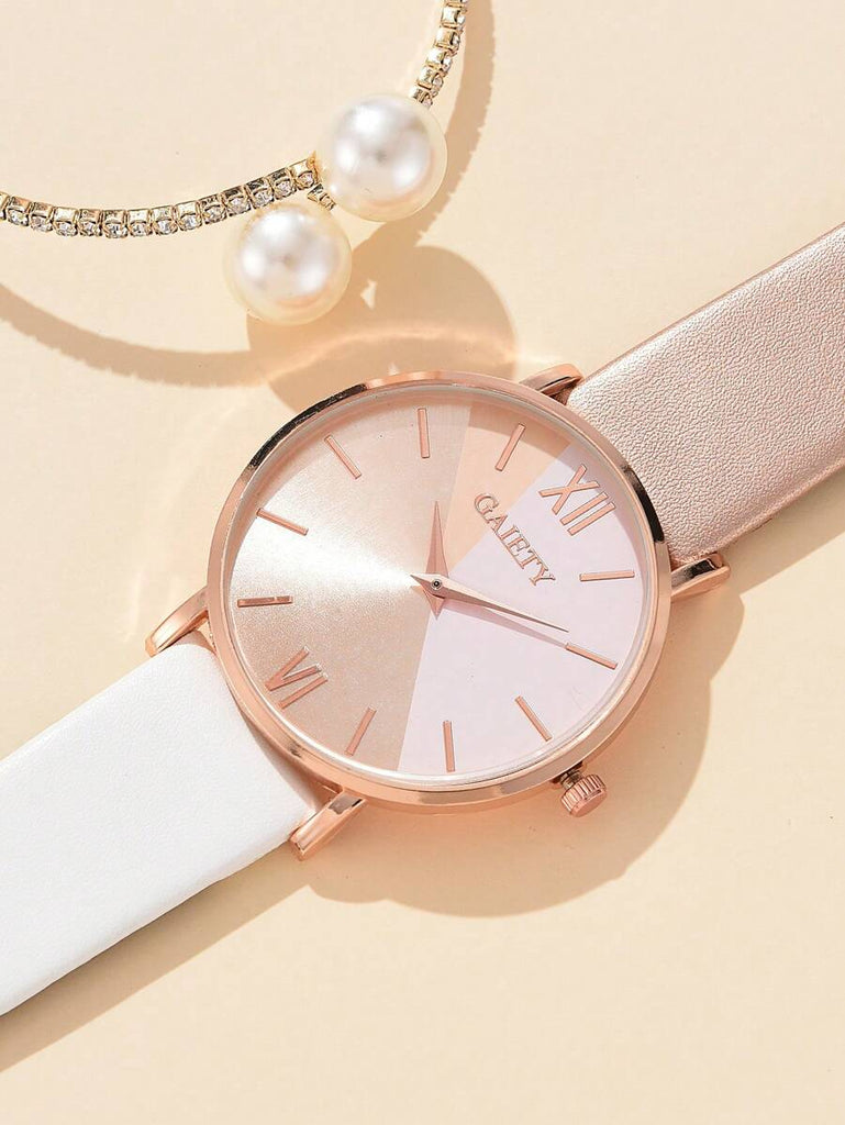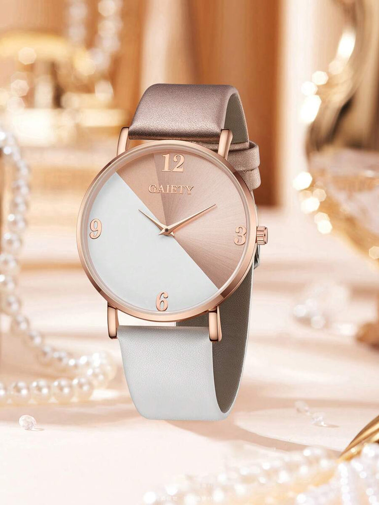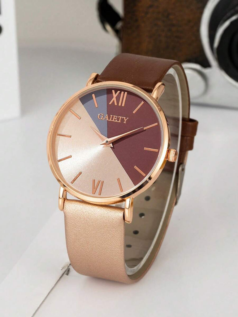 GAIETY 1pc Ladies Watch Women Khaki & Coffee Brown PU Polyurethane Strap Fashion Round Dial Quartz Watch & 1pc Zinc Alloy Rhinestone Faux Pearl Decor Bangle Bracelet, For Daily Life Holiday