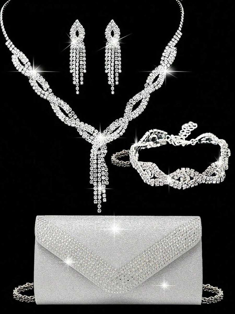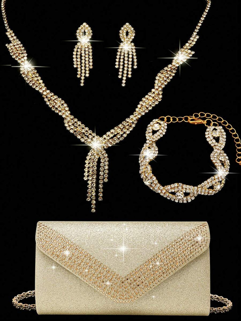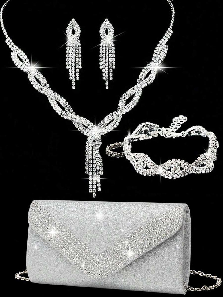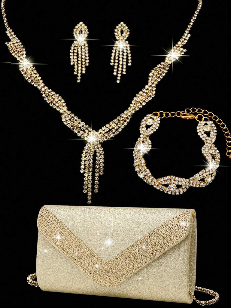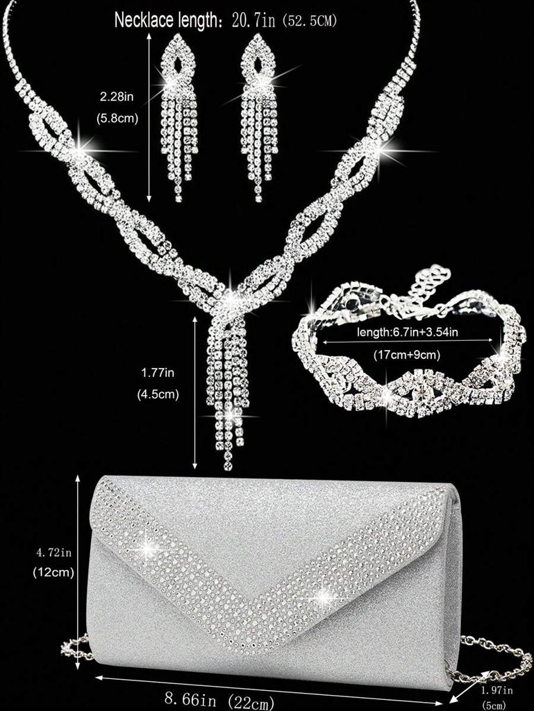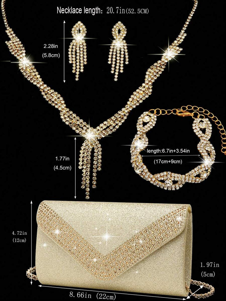 GZCS BAG 4 Pieces Rhinestone Jewelry Set Bling Necklace Earrings Bracelets Set For Sparkling Glitter Hot Diamond Elegant V-Shaped Flap Envelope Purse For Women Prom With Detachable Metal Chain For Wedding And Party Shoulder Bag For Women Clutch For Ladies