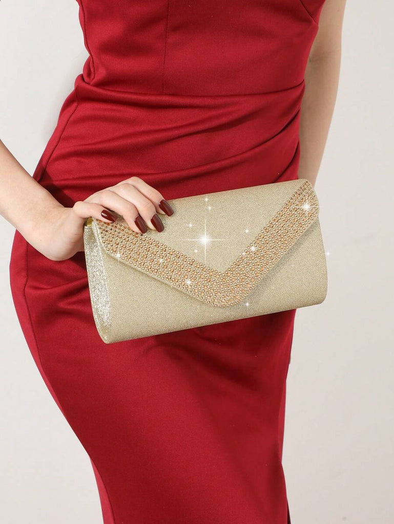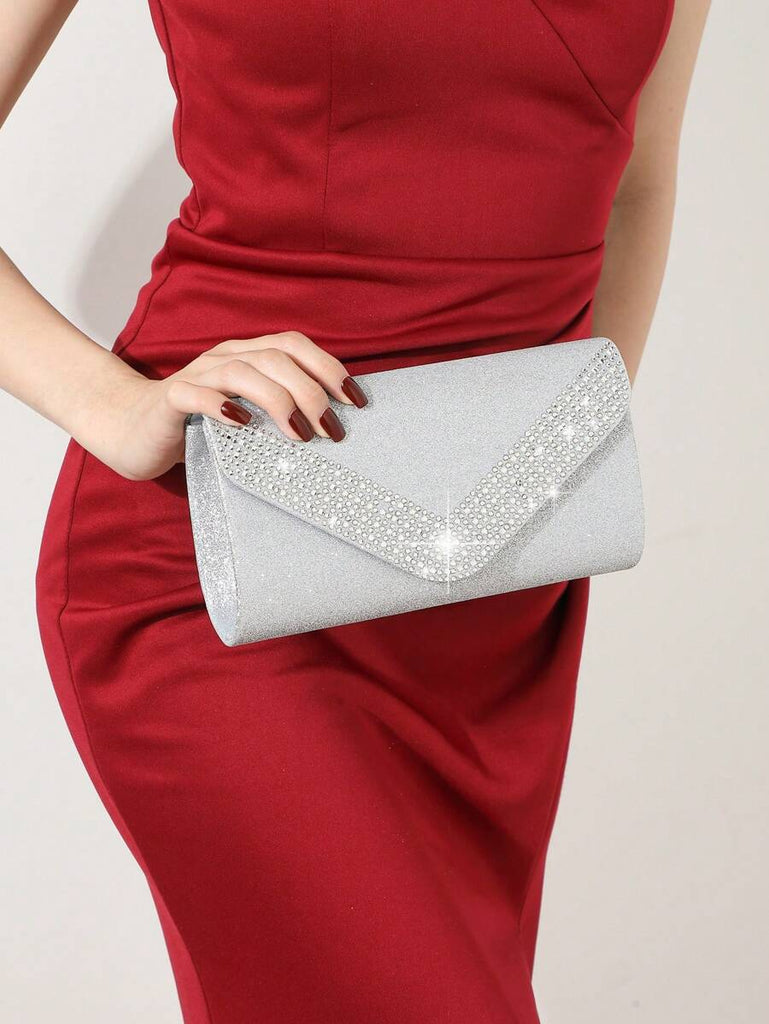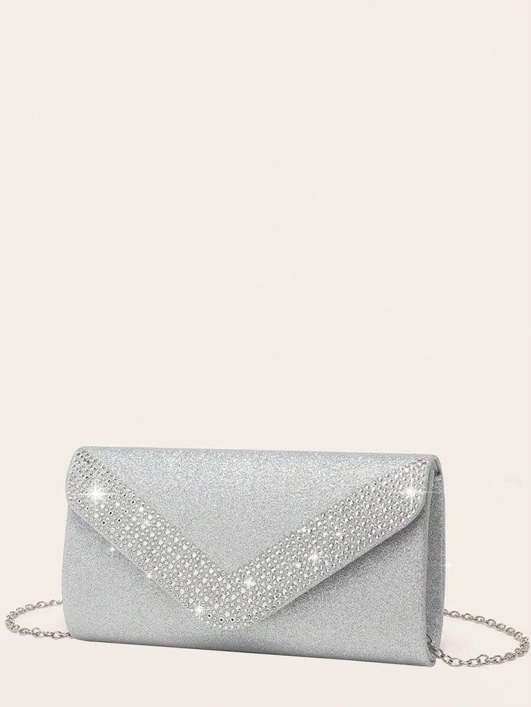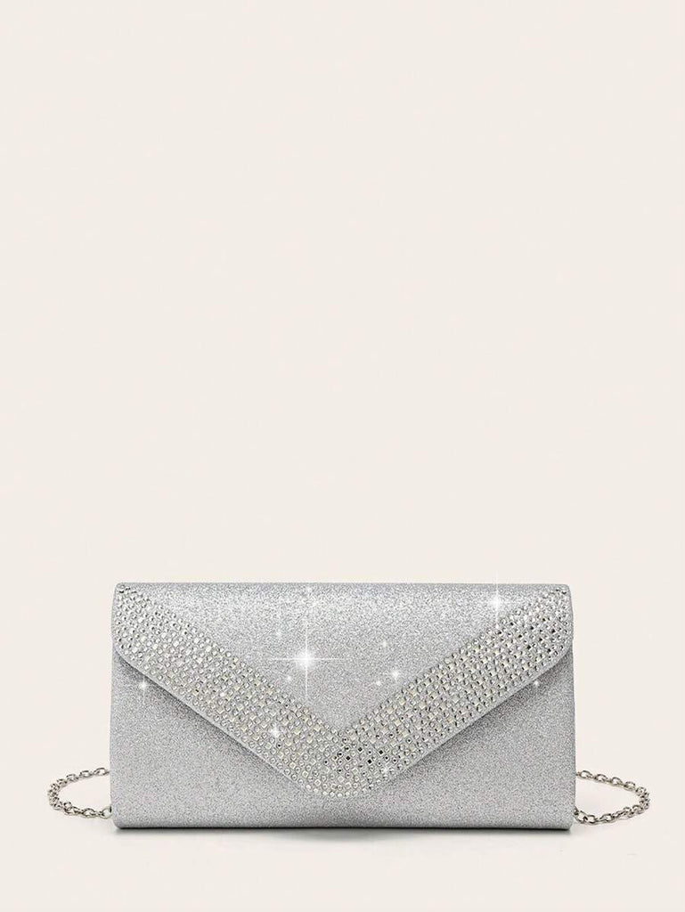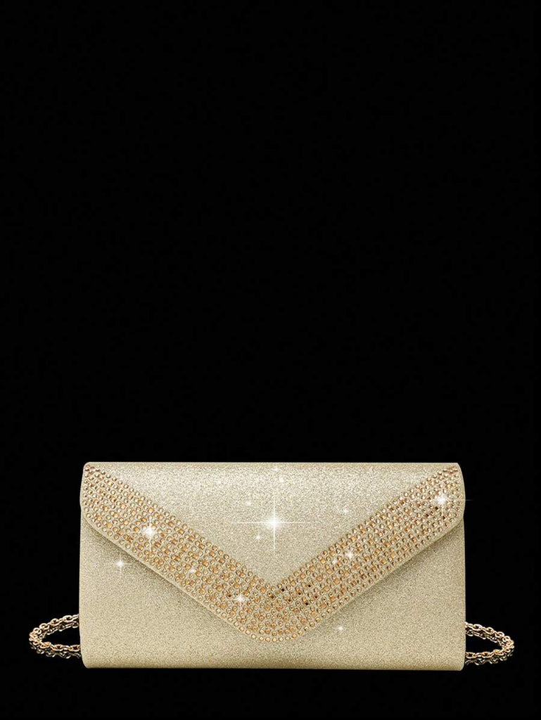 GZCS BAG 4 Pieces Rhinestone Jewelry Set Bling Necklace Earrings Bracelets Set For Sparkling Glitter Hot Diamond Elegant V-Shaped Flap Envelope Purse For Women Prom With Detachable Metal Chain For Wedding And Party Shoulder Bag For Women Clutch For Ladies