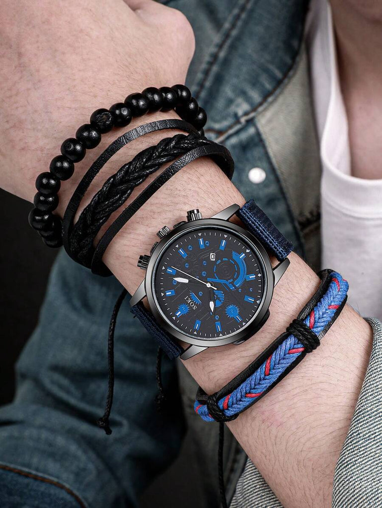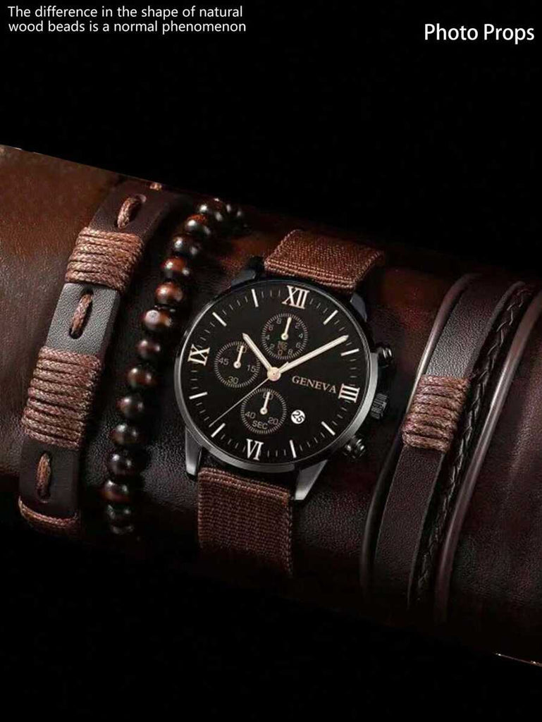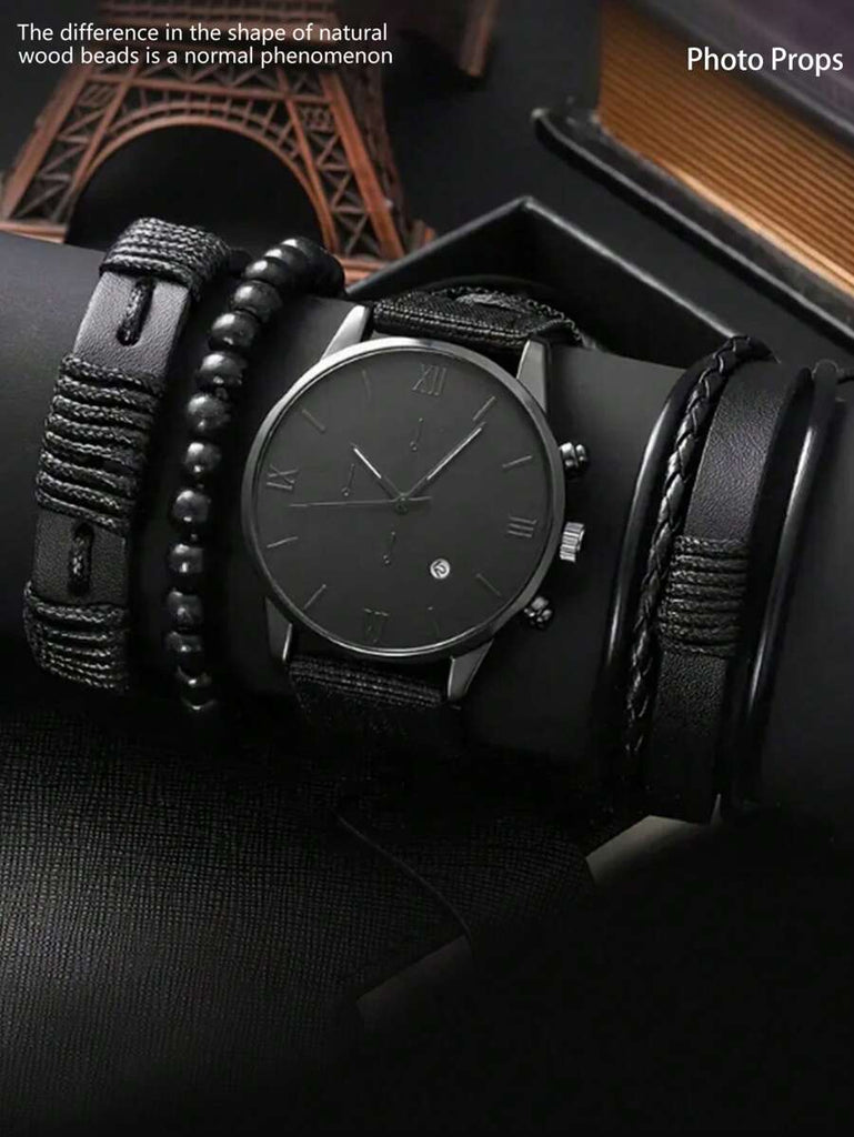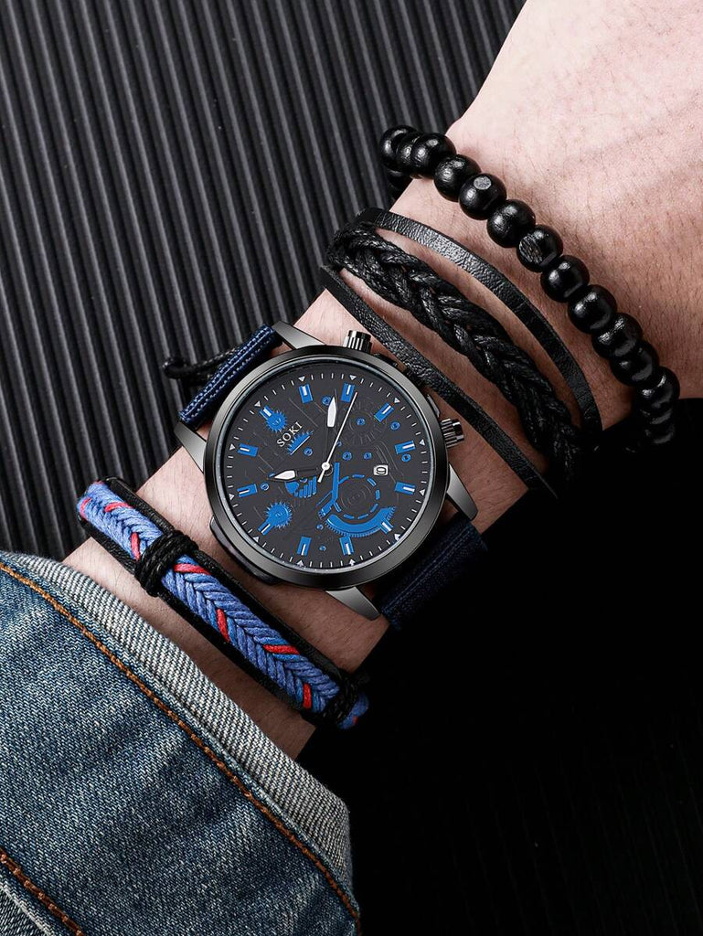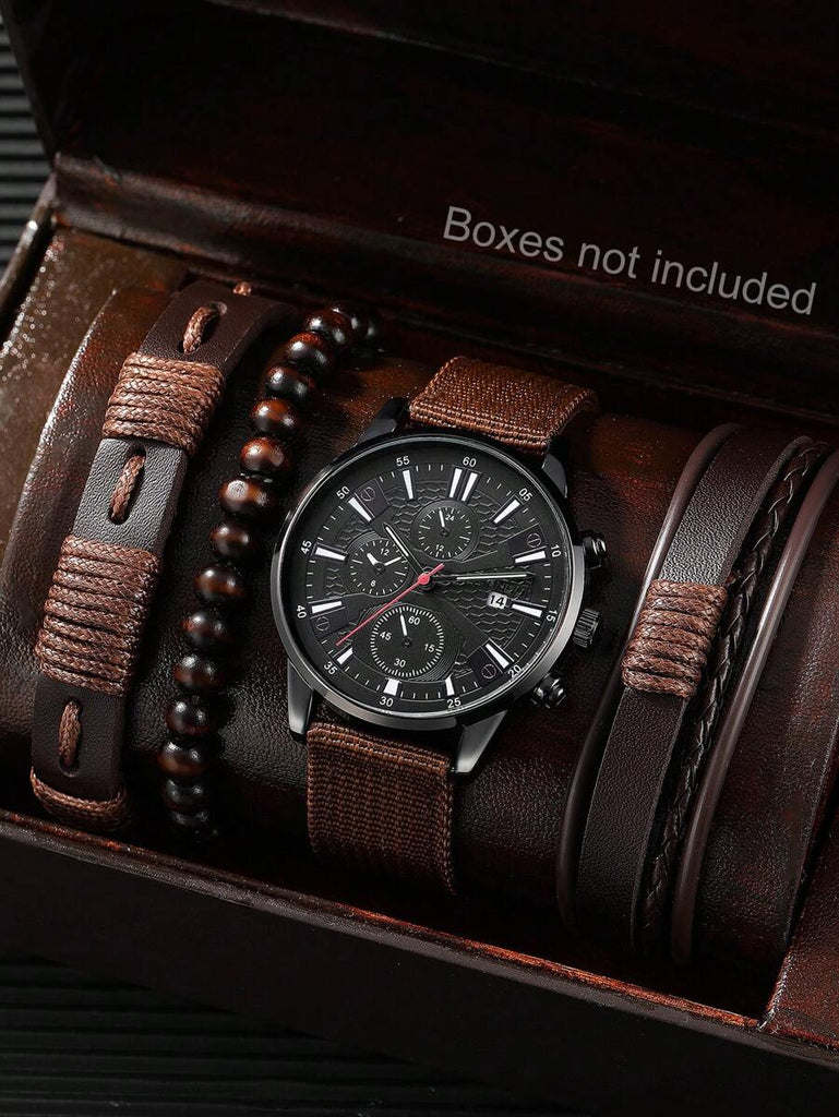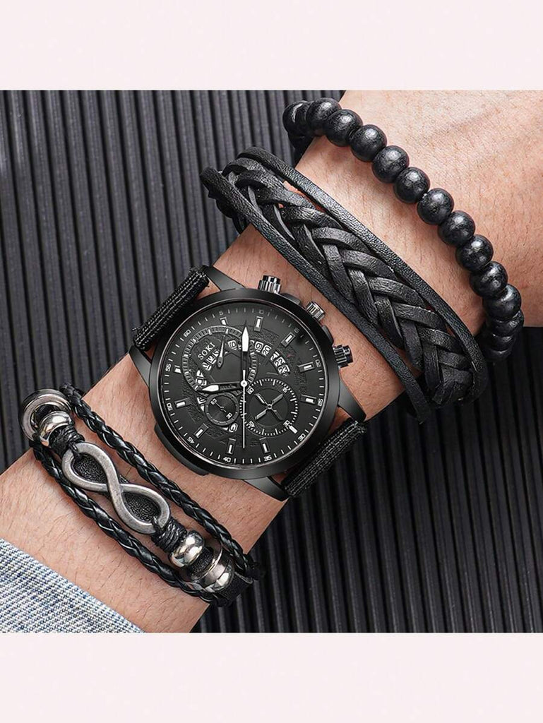 LIANDU LIANDU 4Pcs/Set Men's Watch Calendar Casual Sports Fashion Industrial Style Round Dial Quartz Watch And Leather Bracelet For Men, Punk Bracelet Set, PU Woven Wrap Wristband Suitable For Daily Wear, Back-To-School Season, Graduation Season, Thanksgi