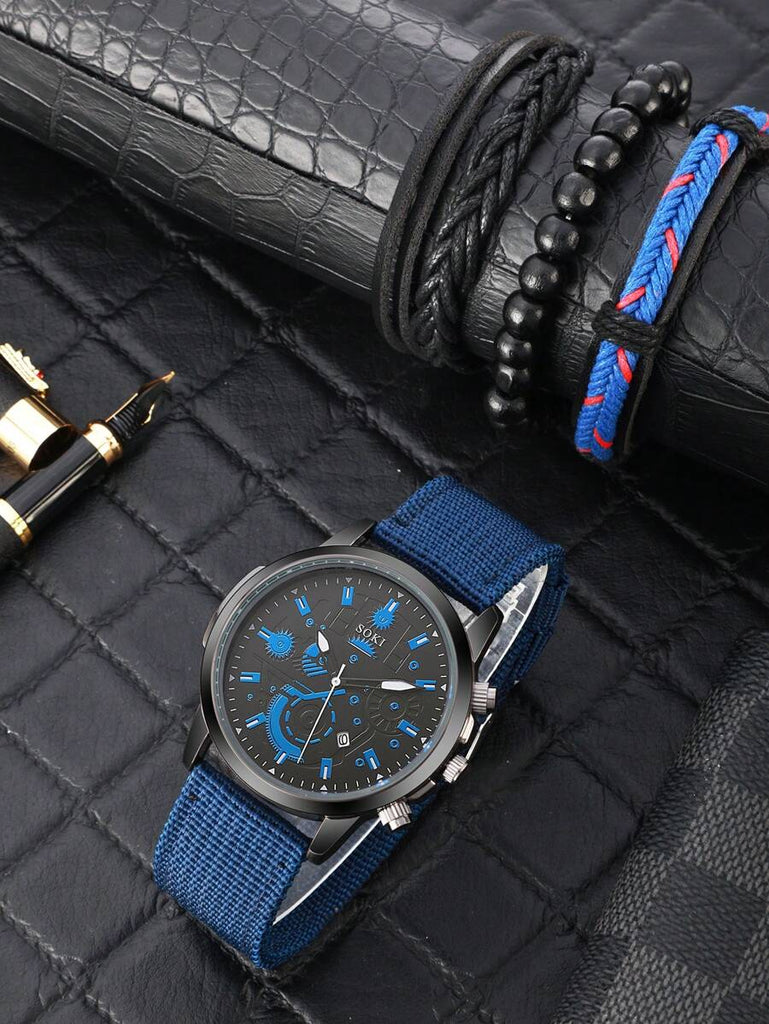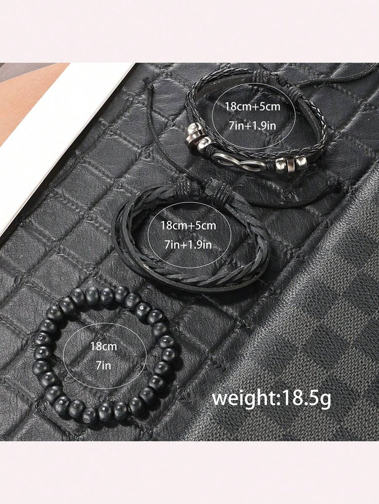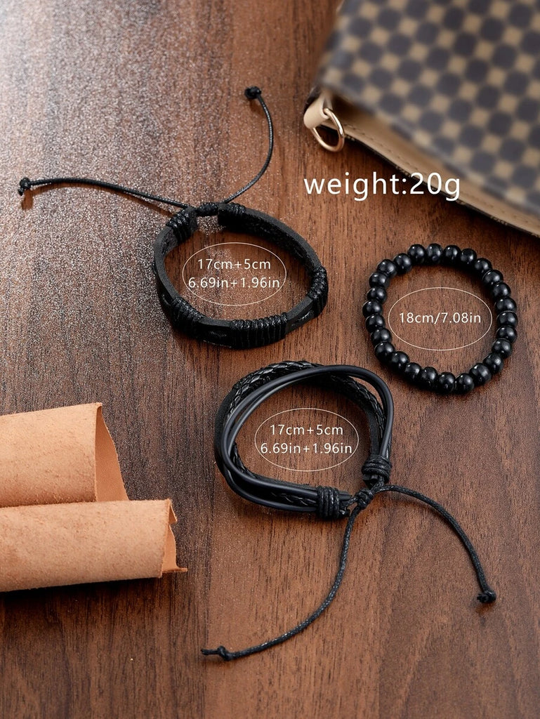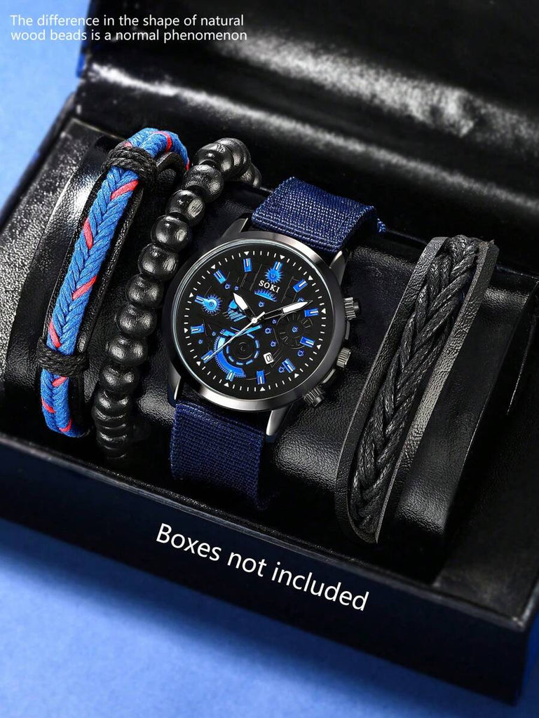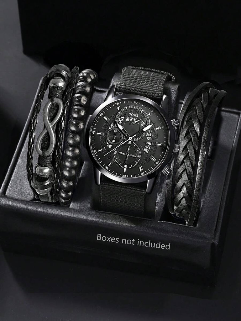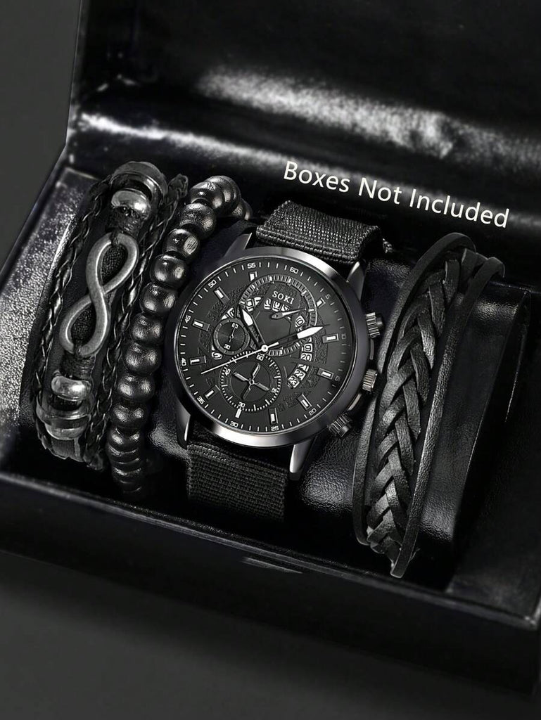 LIANDU LIANDU 4Pcs/Set Men's Watch Calendar Casual Sports Fashion Industrial Style Round Dial Quartz Watch And Leather Bracelet For Men, Punk Bracelet Set, PU Woven Wrap Wristband Suitable For Daily Wear, Back-To-School Season, Graduation Season, Thanksgi