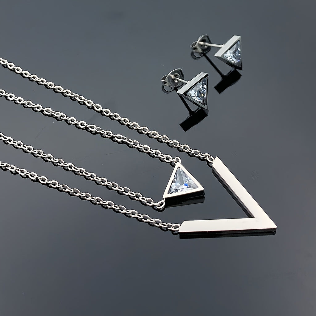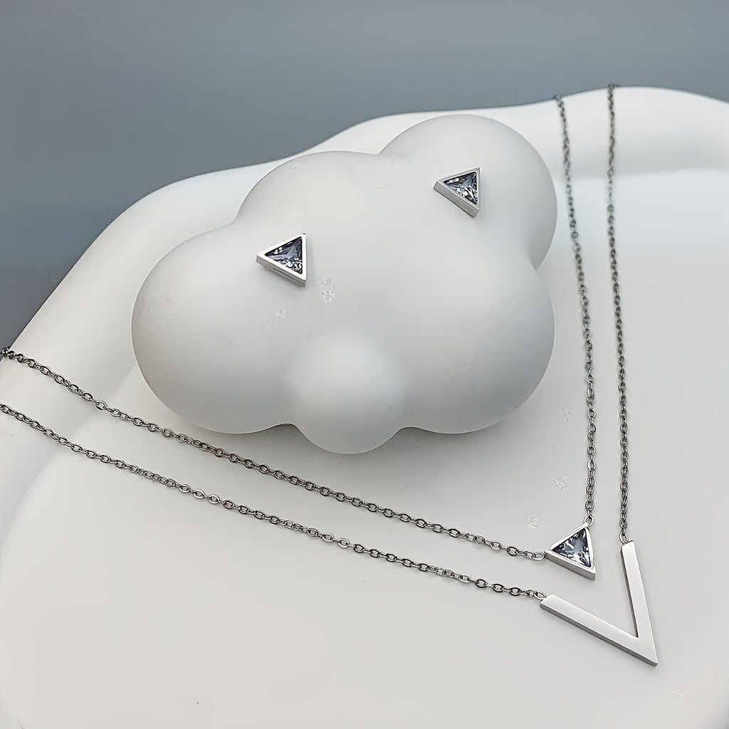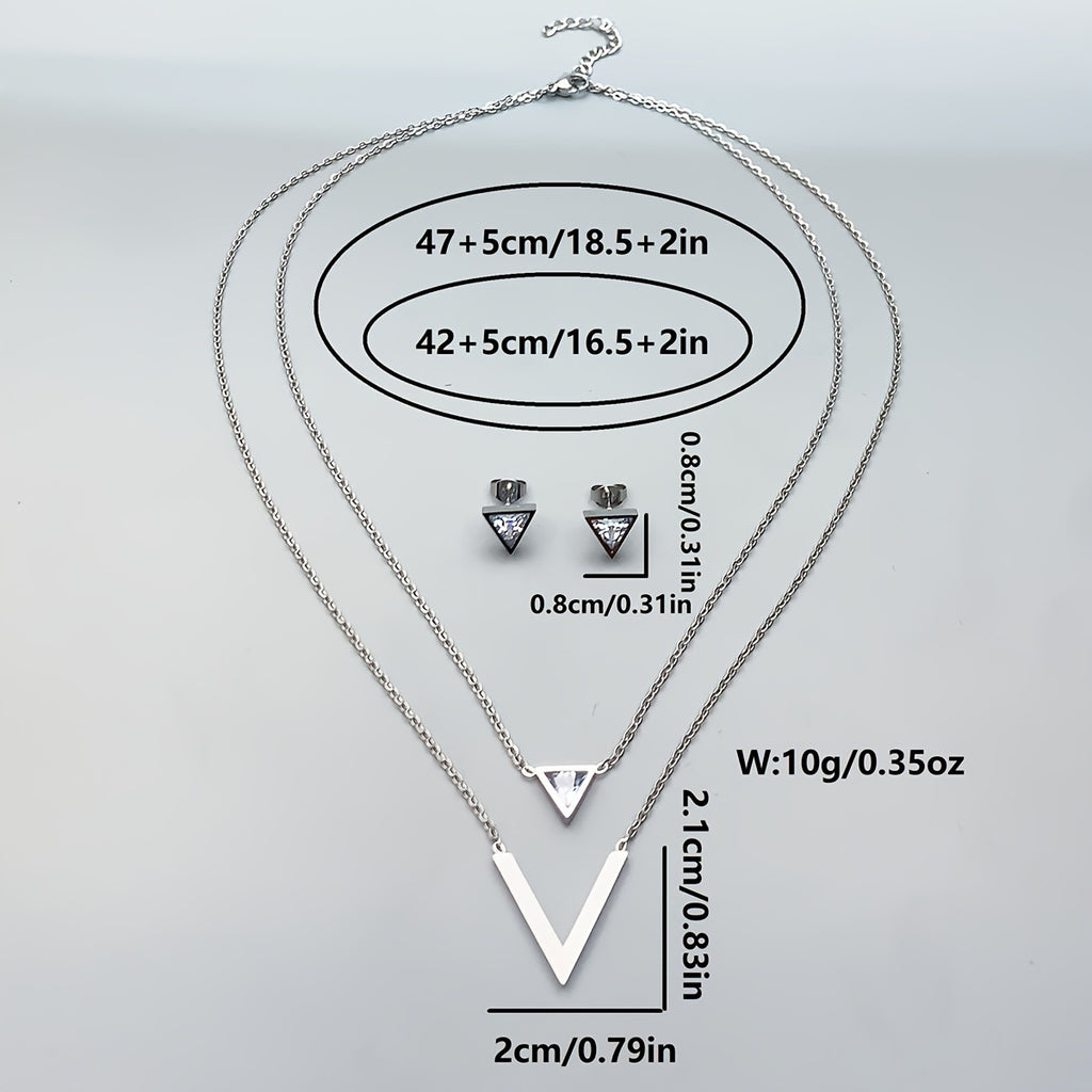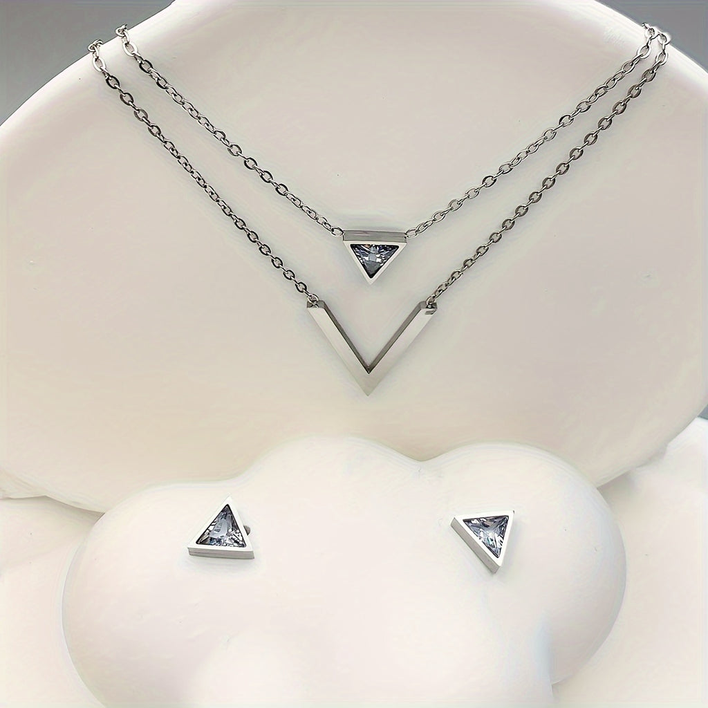 Set Of 3 Fashionable Women's Triangle Zirconia V-shaped Stainless Steel Silvery Double-layer Necklace Pendant Earrings, Birthday Christmas Holiday Date Gift, Dance Gymnastics Accessory Set