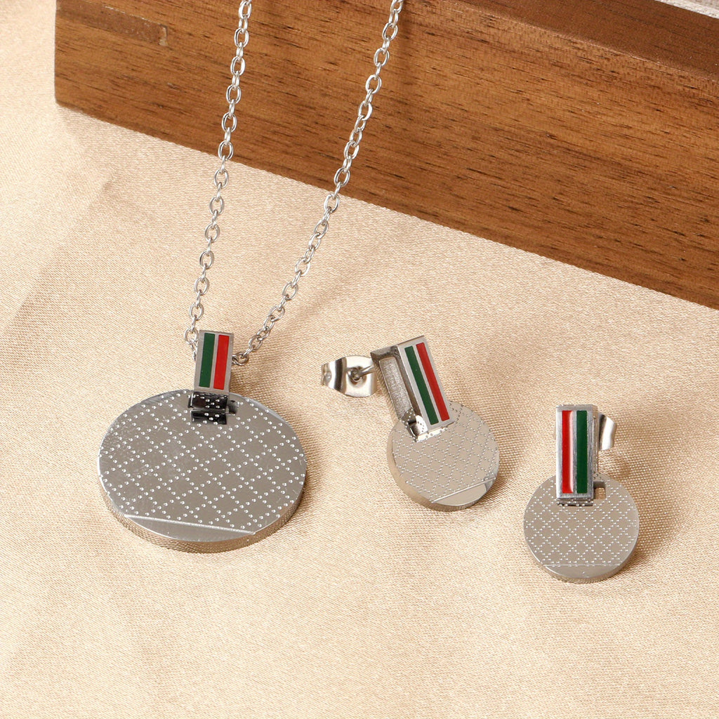 Stylish Hip-Hop Inspired Stainless Steel Necklace And Earrings Set with a Creative Red And Green Enamel Design, Perfect for Everyday Wear, Featuring a Bohemian And Neutral Appeal.
