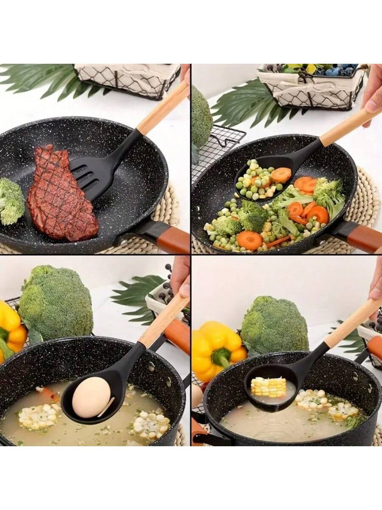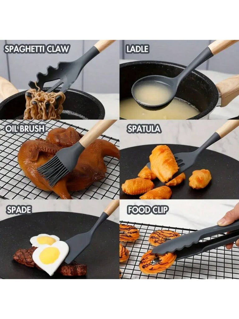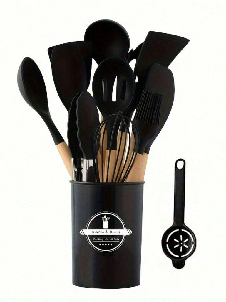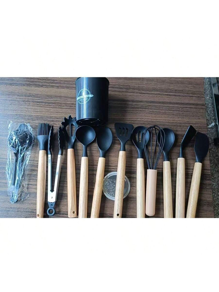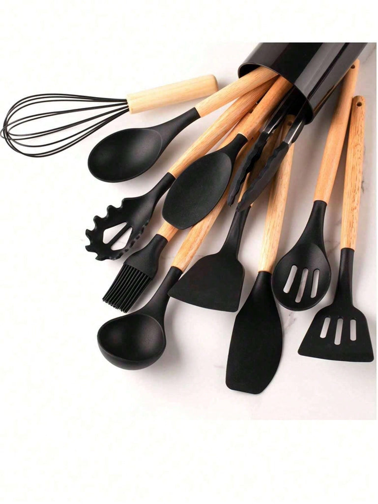 12pcs Wooden Handle Silicone Kitchen Utensil Set With Storage Bucket