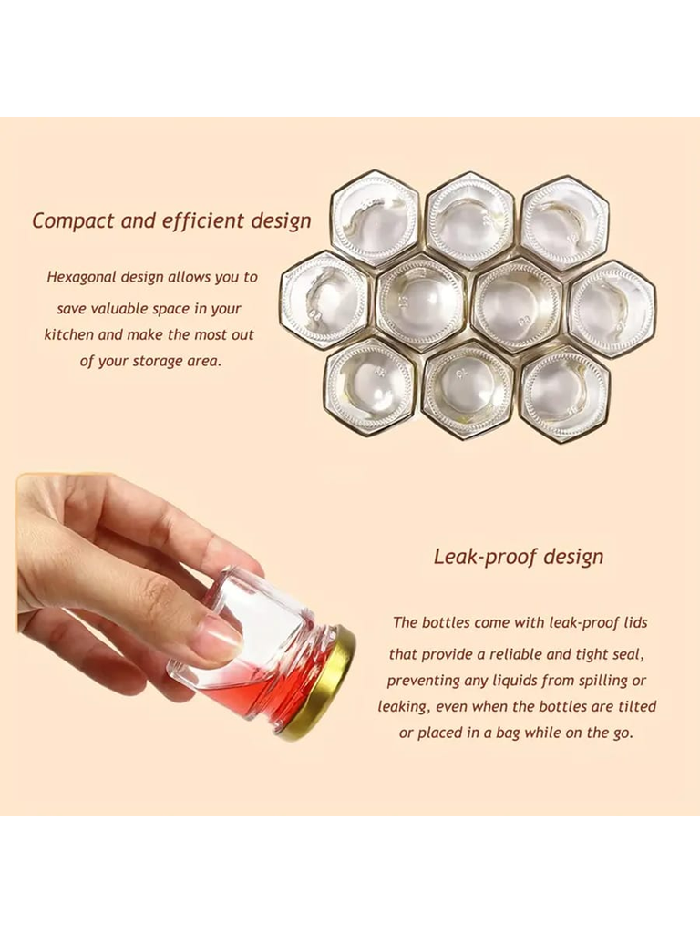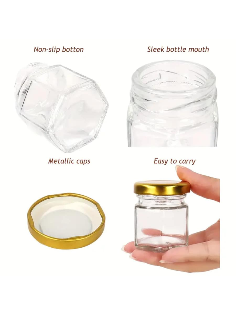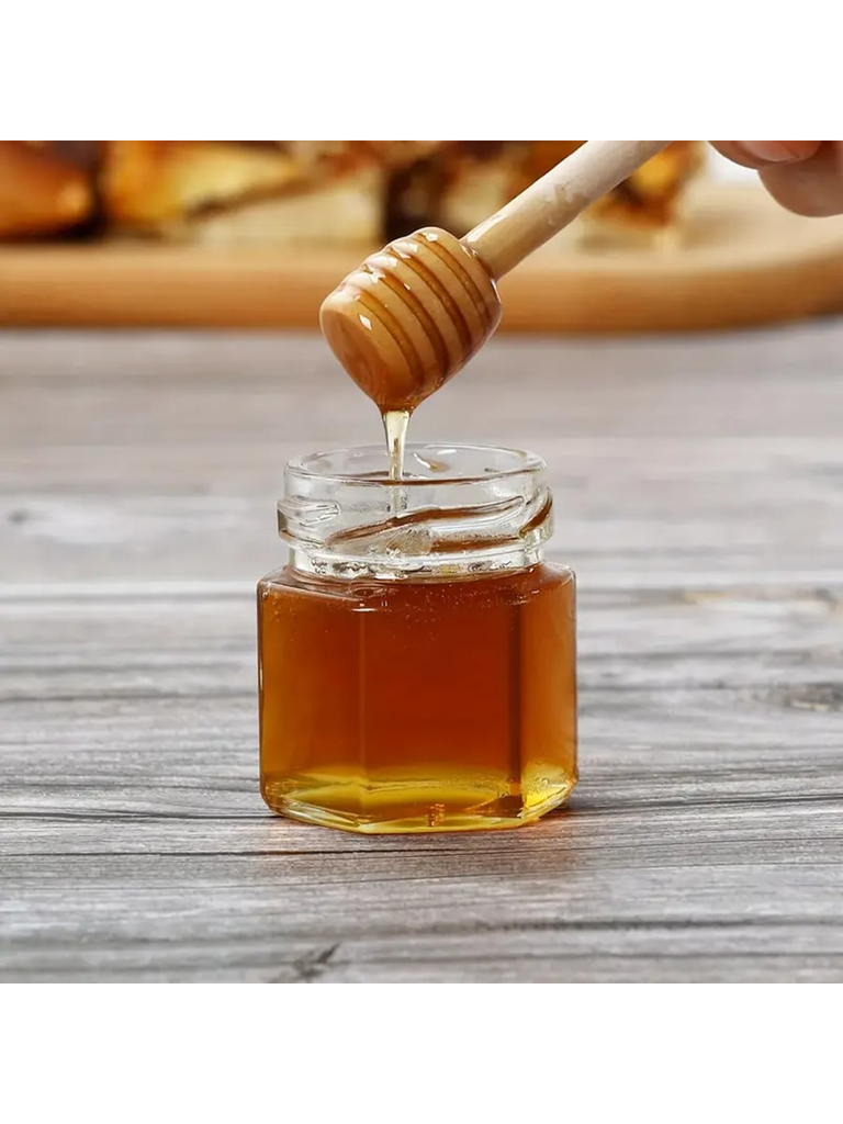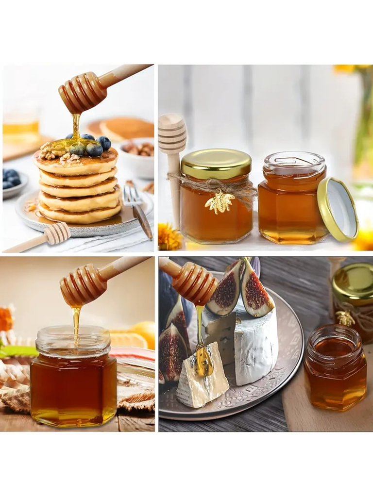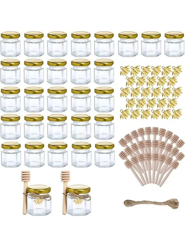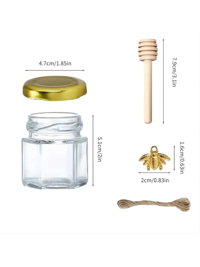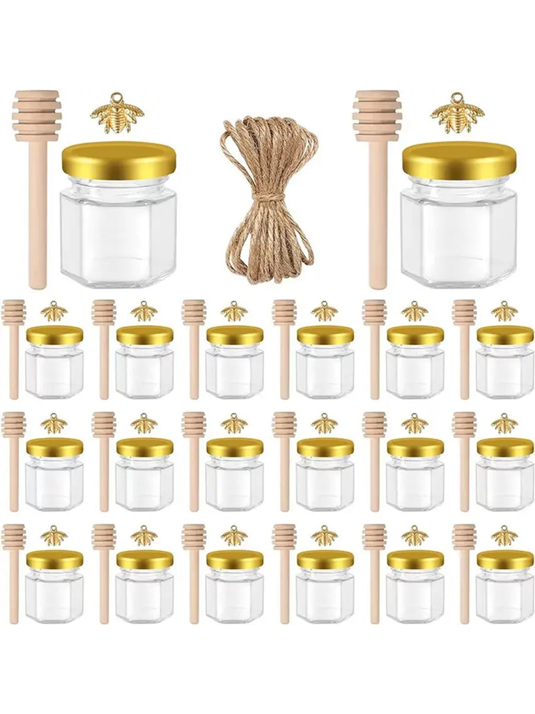 2/10/20/30/50/60 Sets, 1.5 Oz Hexagon Mini Glass Honey Jars, Honey Jars With Wood Dipper, Golden Lids, Bee Pendants And Jutes, Perfect For Baby Shower, Wedding Favors, Party Favors