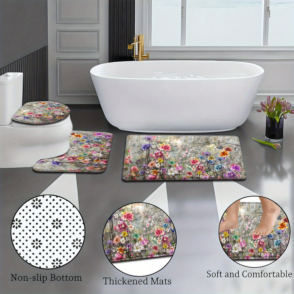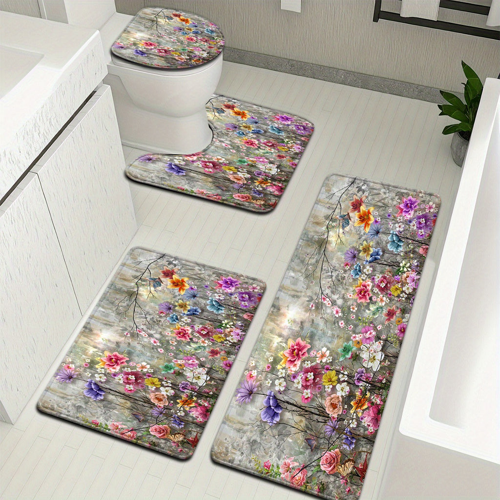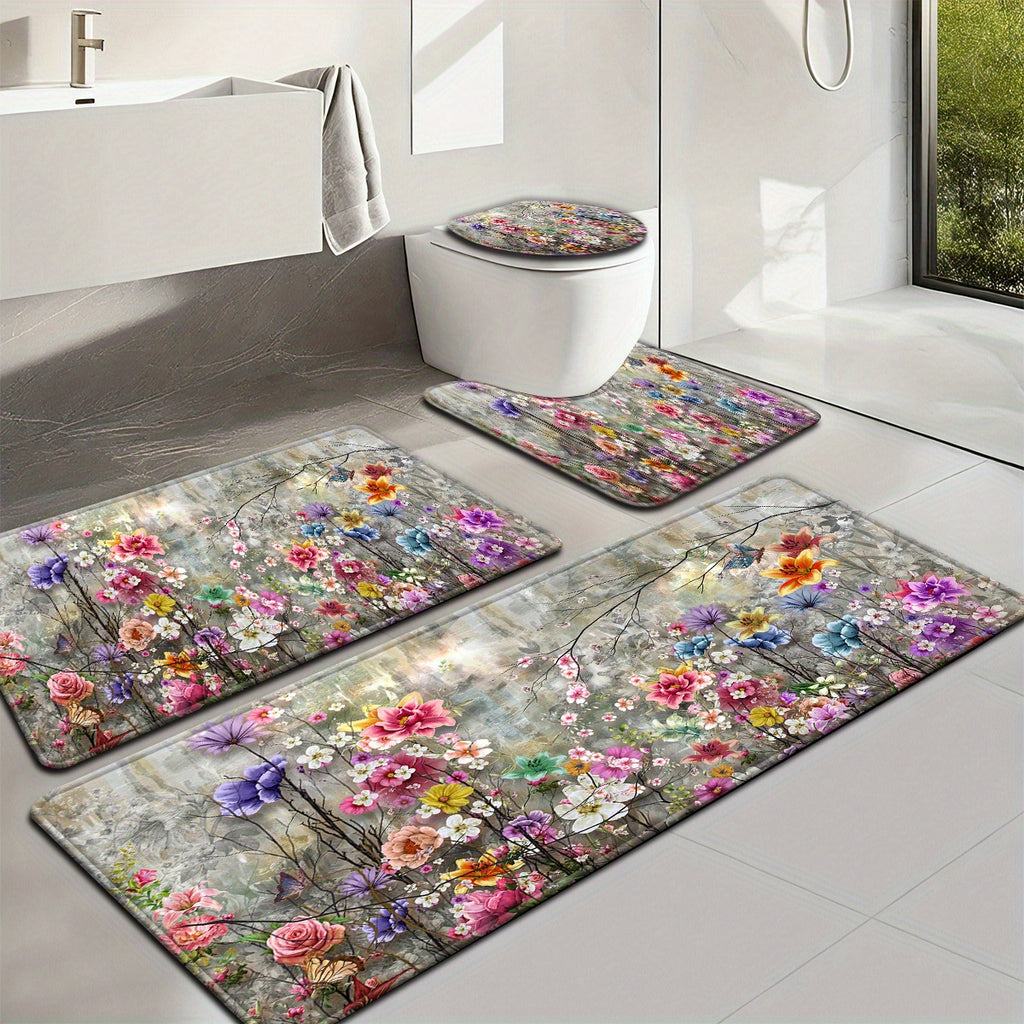 3pcs/4pcs Cute Floral Pattern Bathroom Mat Set with Toilet Lid Cover and U-Shaped Rug, Stylish Bath Decor
