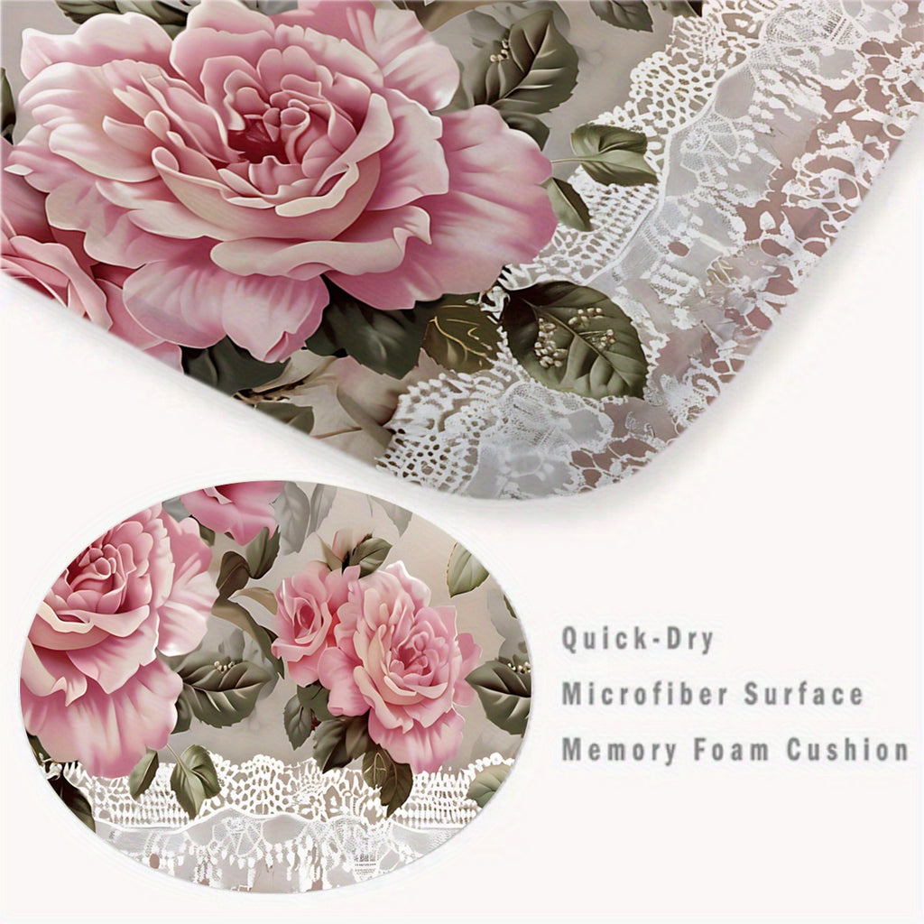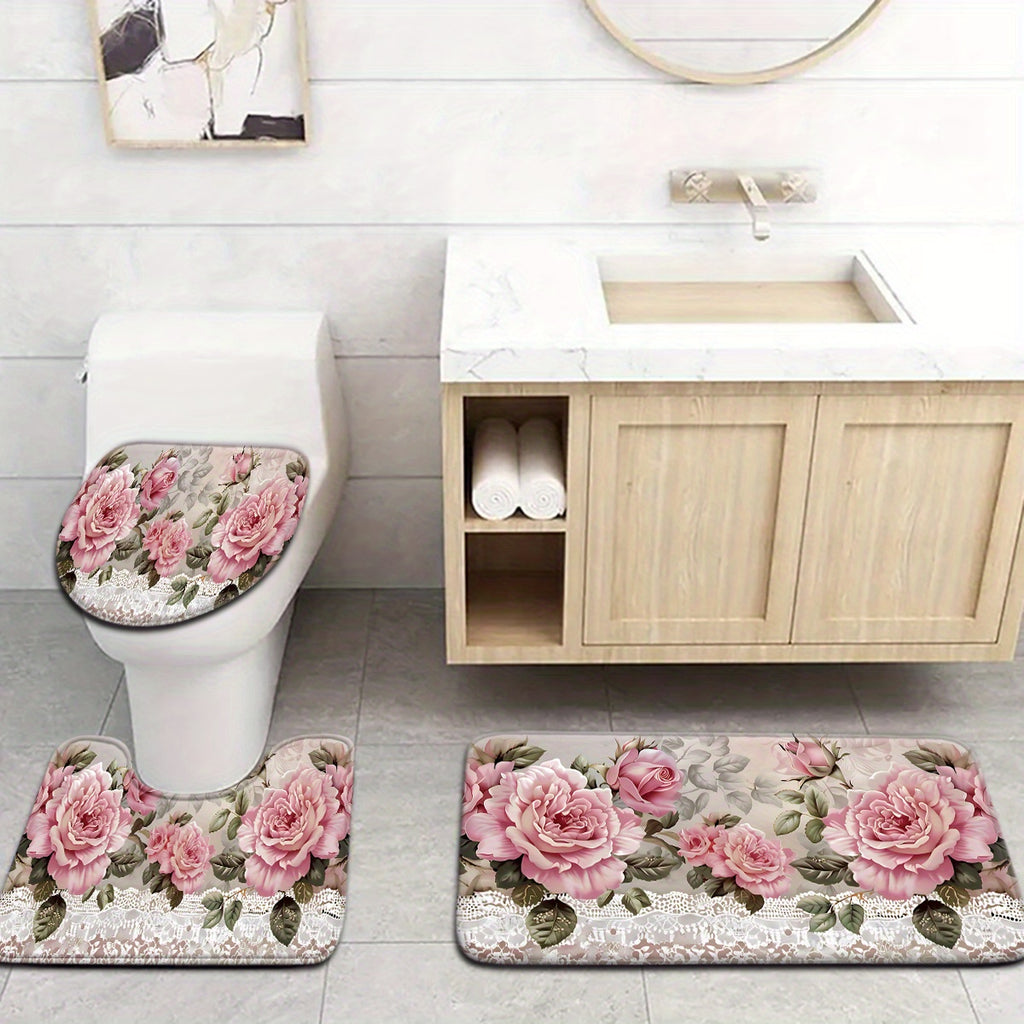 3pcs/4pcs Lace Border Pink Flower Green Leaf Pattern Bathroom Mat Set Toilet Seat U-shaped Foot Mat