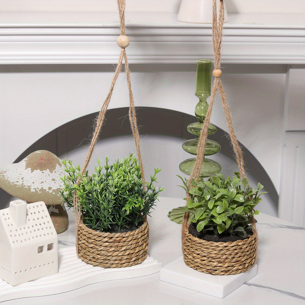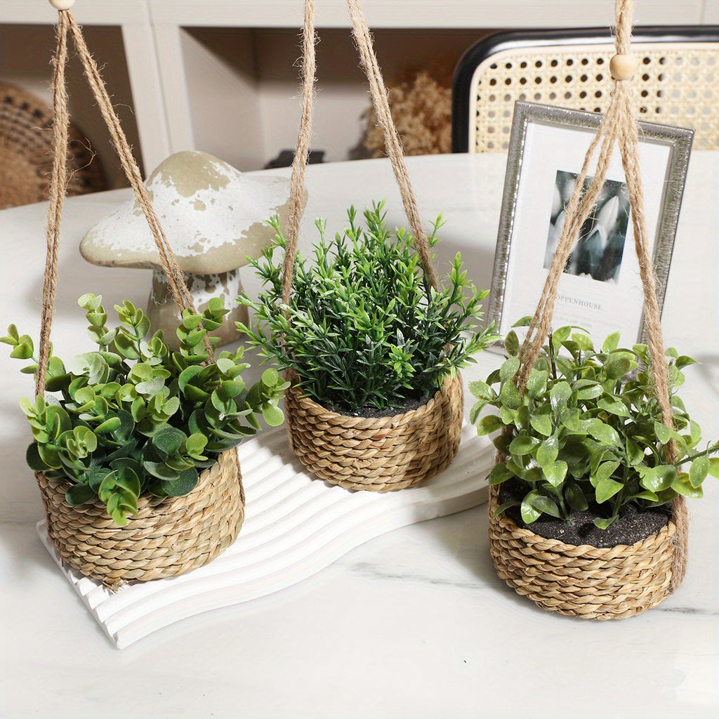 3pcs Artificial Eucalyptus Leaf Hanging Grass Pile, Artificial Rosemary Hanging Small Pot Plant, Boxwood Rope Grass Pile, Base Diameter 10cm/3.94inch, Includes Hanging Rope, Wholesale, Can Be Suspended, Green, PE Material, Artificial Small Pot Plant, Sim