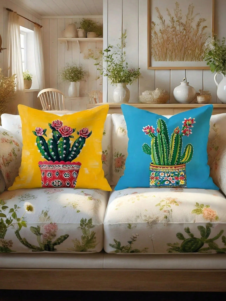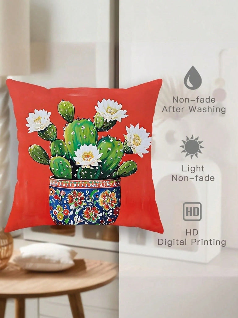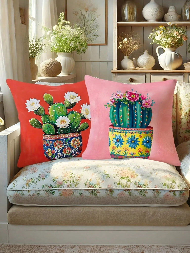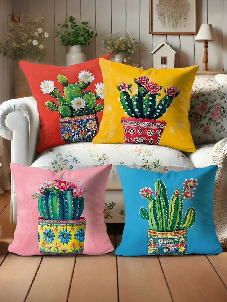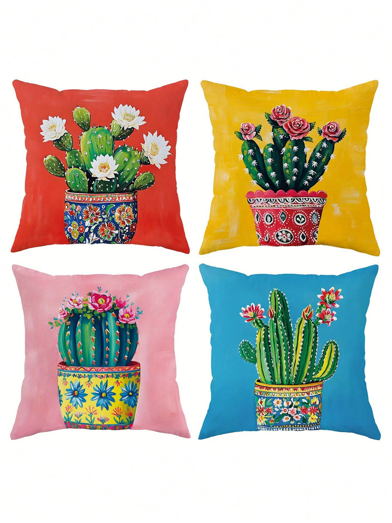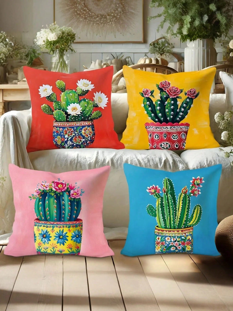 4pcs/1pc Summer Cactus Pattern Pillow Cover With Red, Green, Yellow, And Pink Background, Used For Party Decoration In Living Rooms, Sofas, And Bedrooms | 18x18 Inches | Zipper Closure | Soft And Comfortable Fabric - Durable, Fade Resistant, Machine Wash