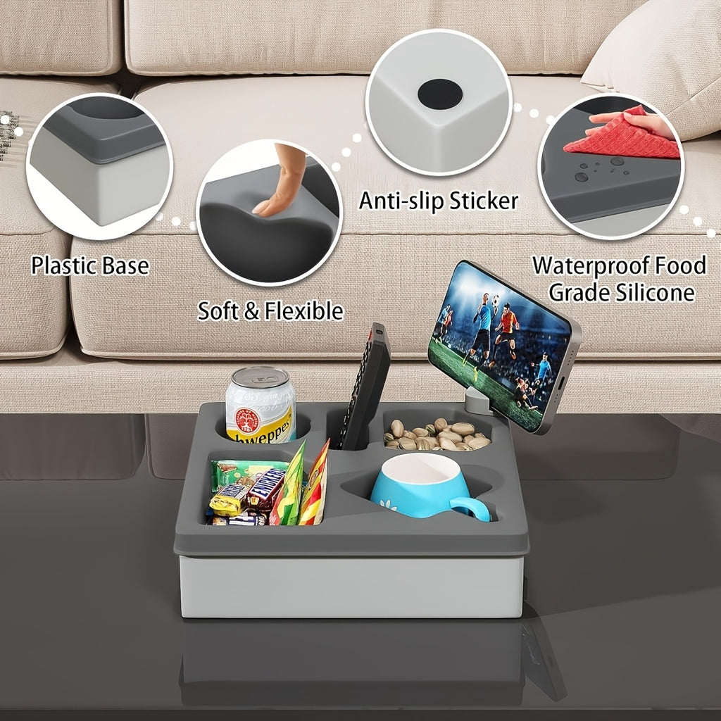 A Sofa Cup Holder Tray with a Rotatable Phone Stand, Suitable for Bed And Sofa Storage, Waterproof for Drinks, Perfect for Snacks, Beverages, Remote Controls, And Phones (Gray), Ideal for Gifting.