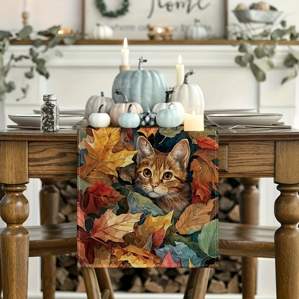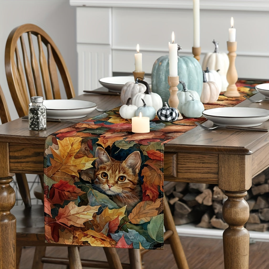 Autumn Cat & Maple Leaf Tablecloth with Cute Peeking Cat Design - Durable Polyester Seasonal Fall Kitchen Decor for Family Gatherings, Thanksgiving, Halloween - 13x48/72/108 Inch Rectangular Table Cover, Cats Decor, Thanksgiving Table Setting, Playful Ta