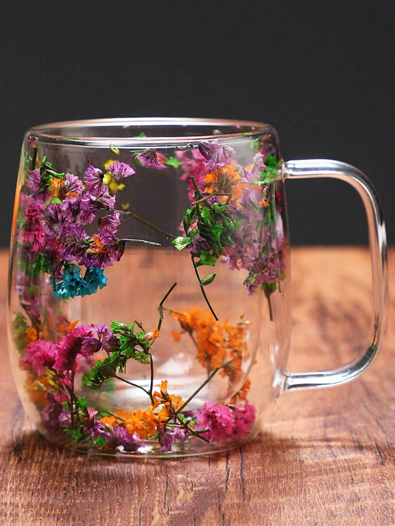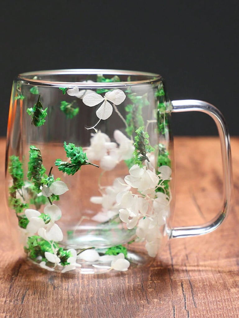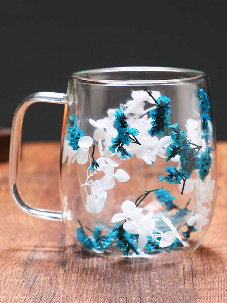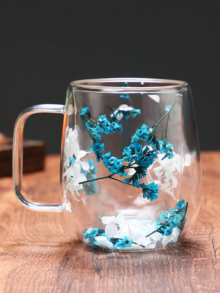 Double-Layer Glass Cup With Real Flowers, Highly Attractive And Creative Coffee Mug With Handle For Home, Internet Celebrity Flowing Sand Glass Cup With Dried Flowers