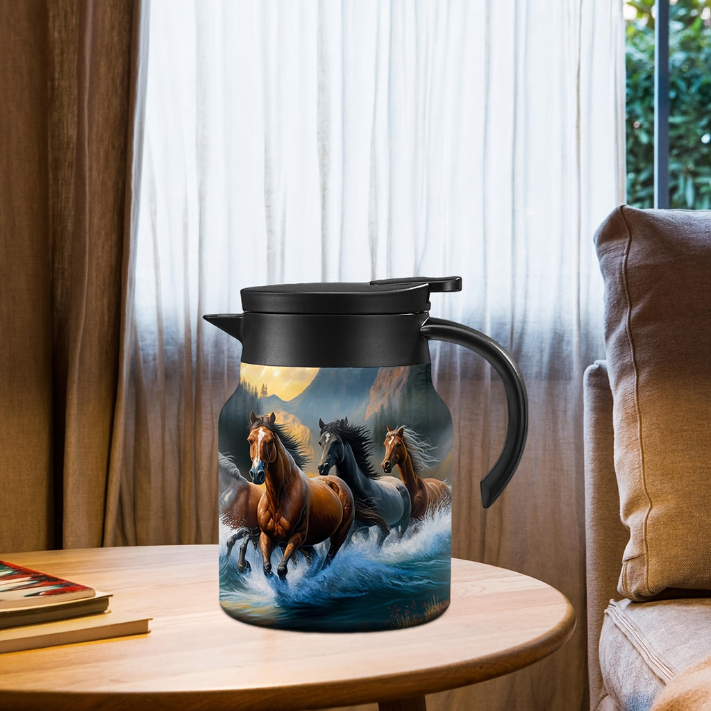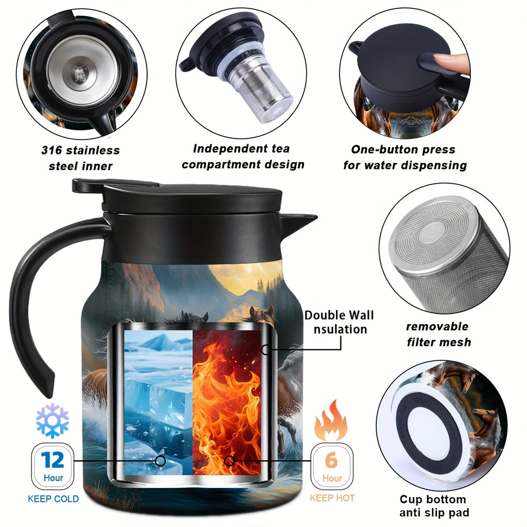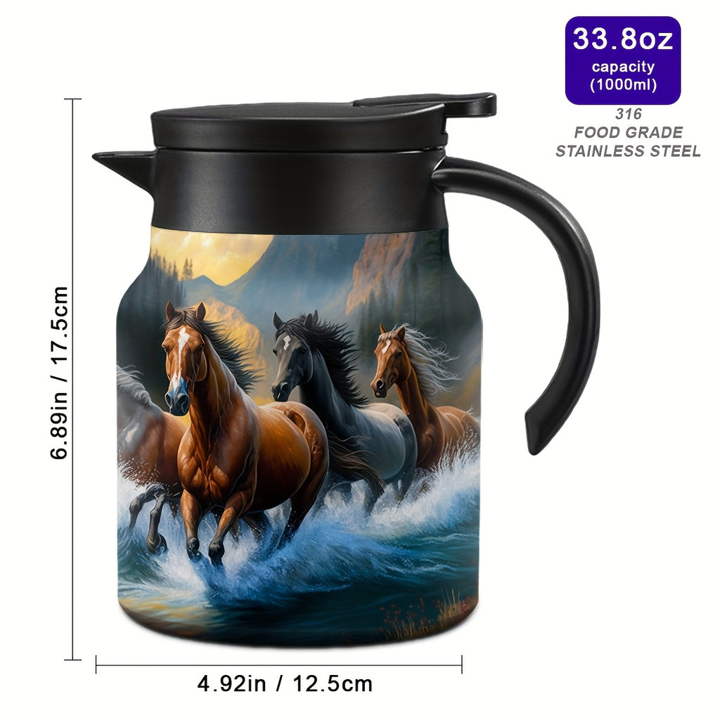 One, 33oz Horse Print Design Insulated Bottle/water Bottle with Double-wall Insulated Coffee Mug - Stainless Steel Vacuum Insulated Bottle, 316 Stainless Steel Liner, Sealed Silicone Gasket, V-shaped Spout, Food-grade PP Lid, Stainless Steel Mesh