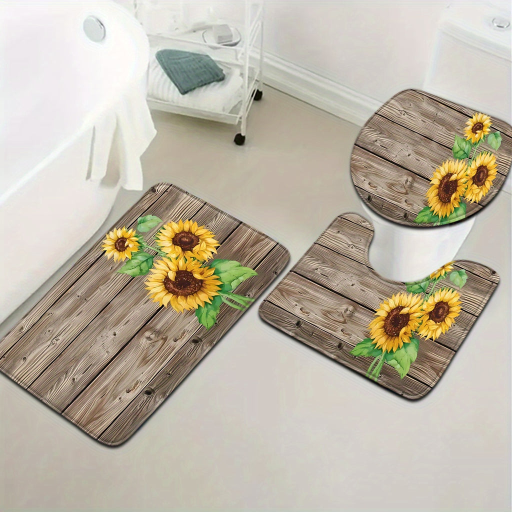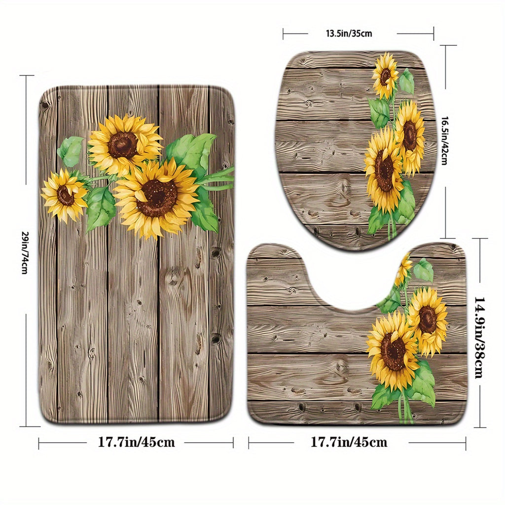 Open 3pcs Plant Series Wooden Board Sunflower Pattern Bathroom Mat Set Toilet Seat Ring U-shaped Foot Pad