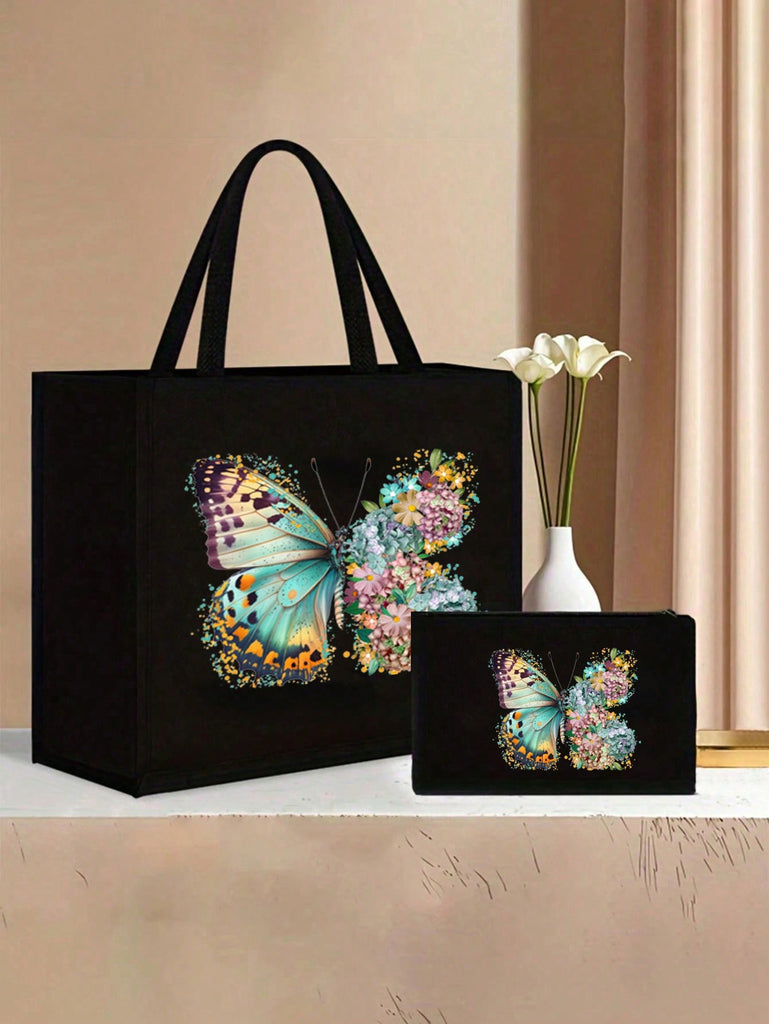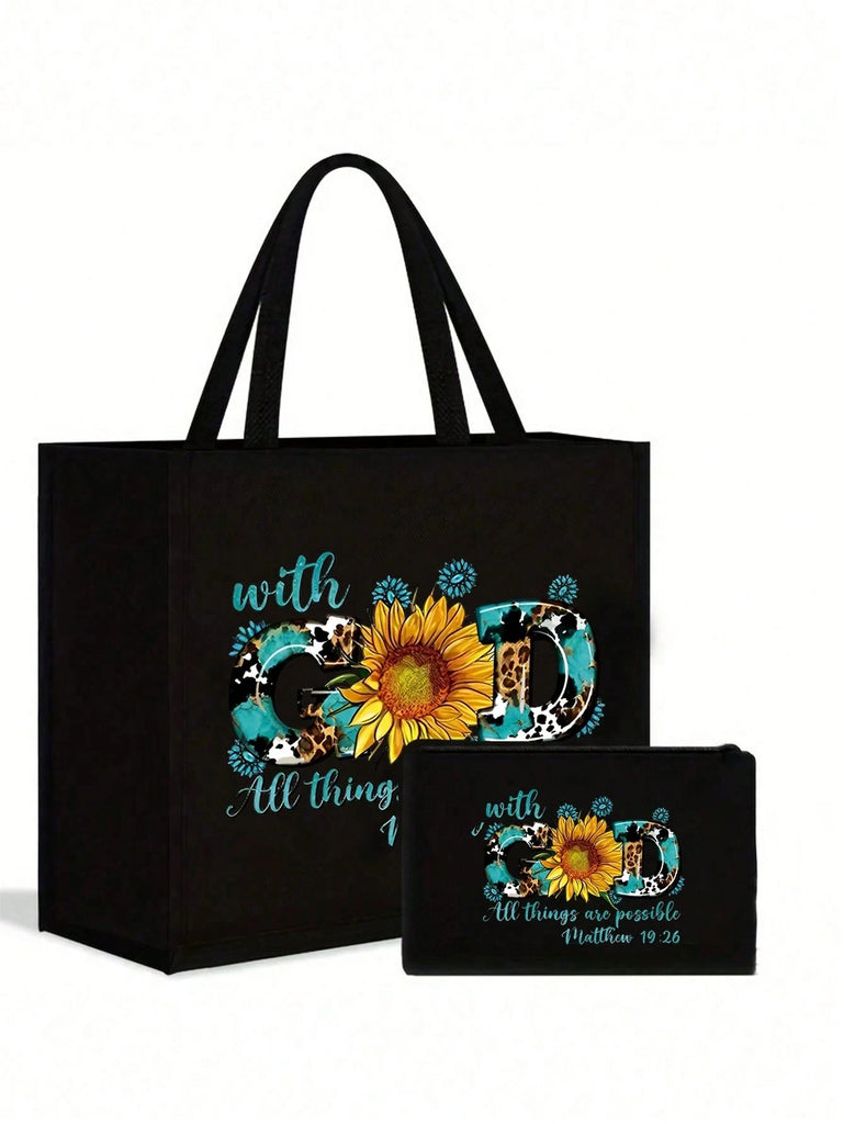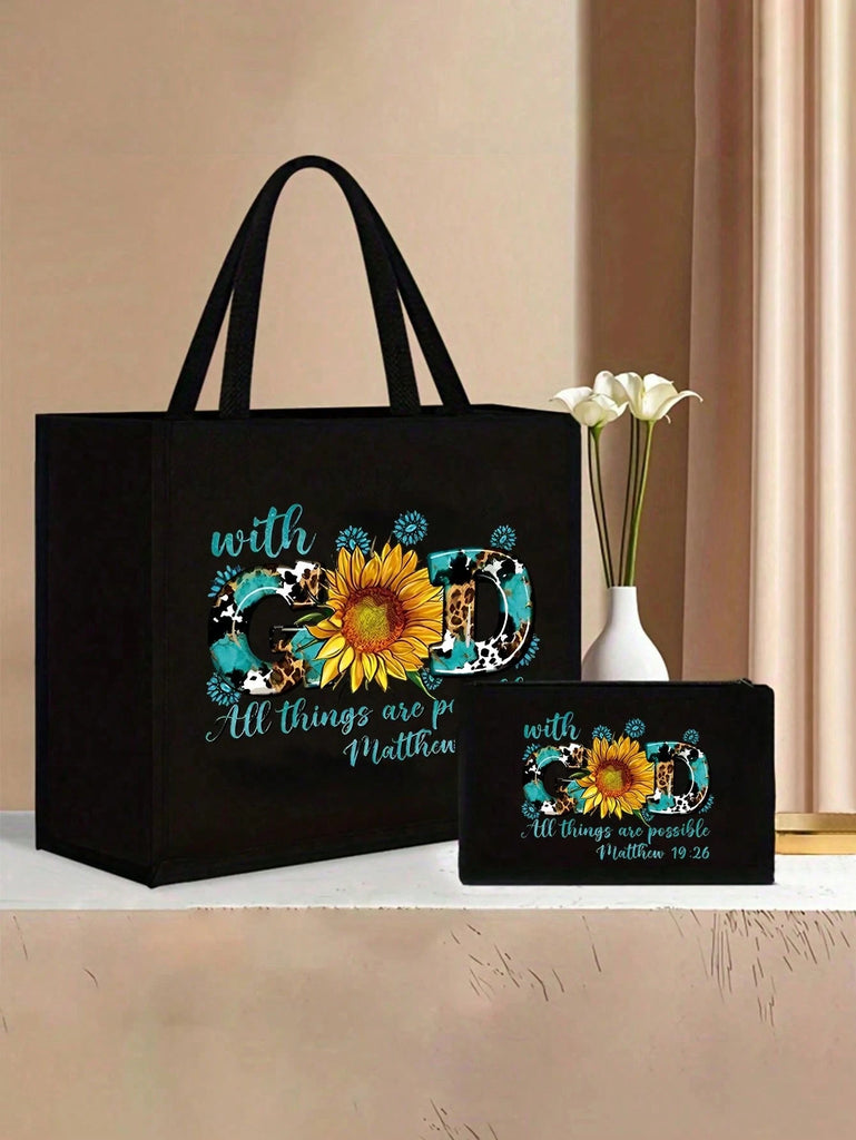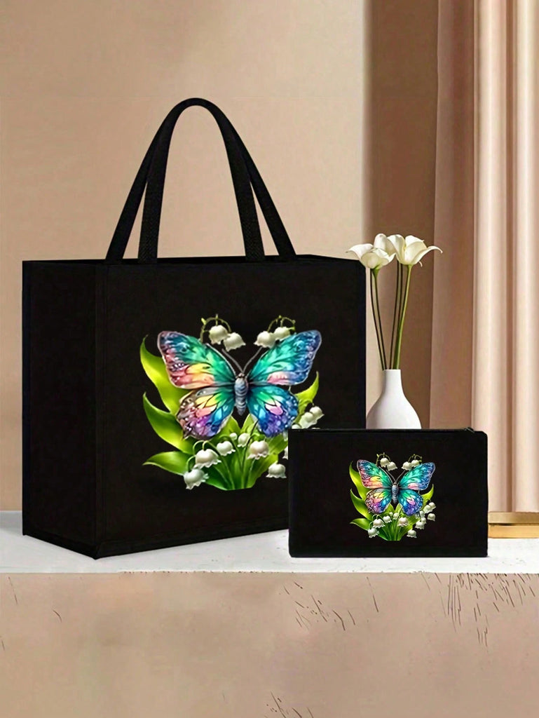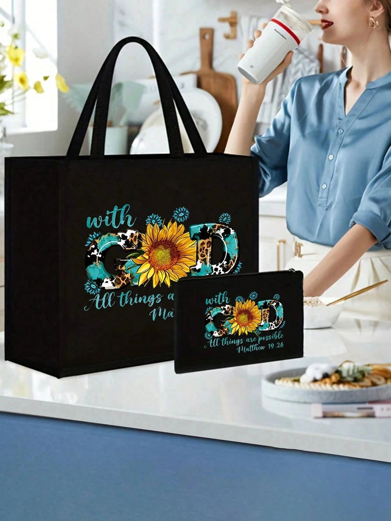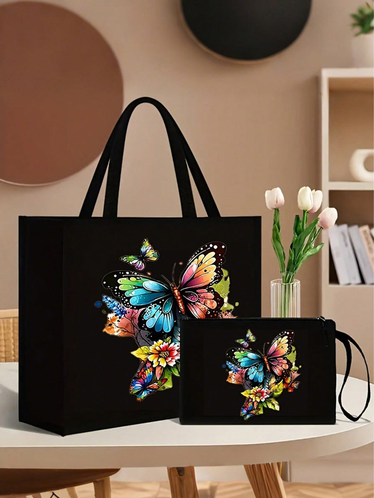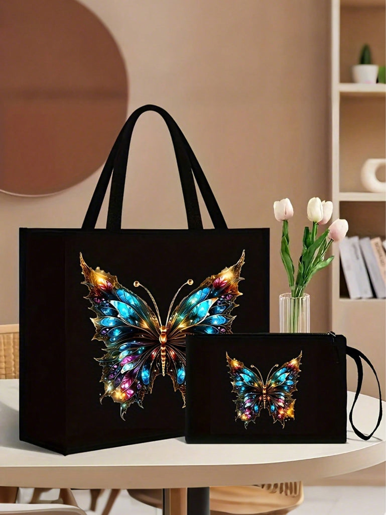 2pcs Fashionable Geometric Print Tote Bag Set, Large Capacity Casual Handbag With Fixed Straps, Foldable Design, Magnetic Closure, Polyester Lined, Non-Washable - Black