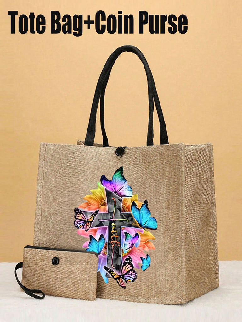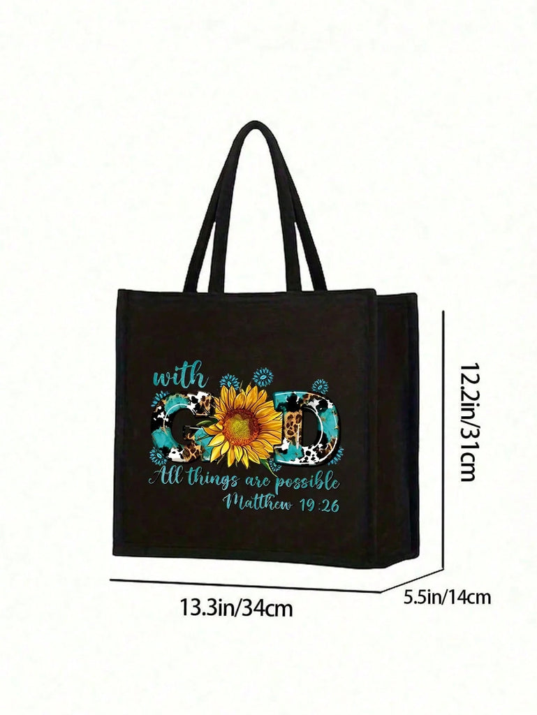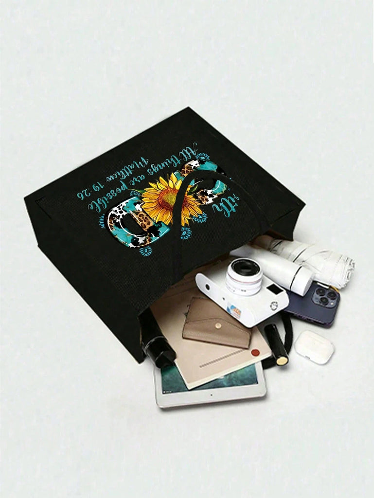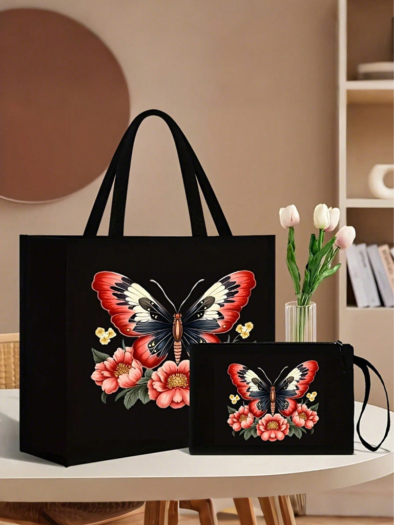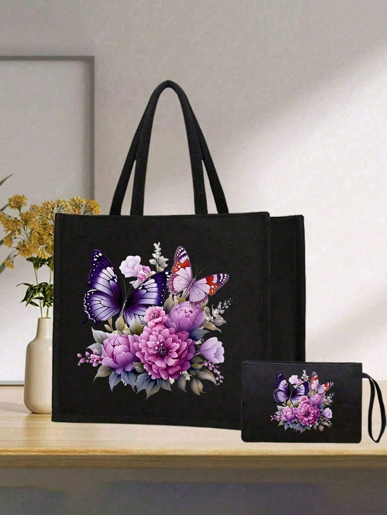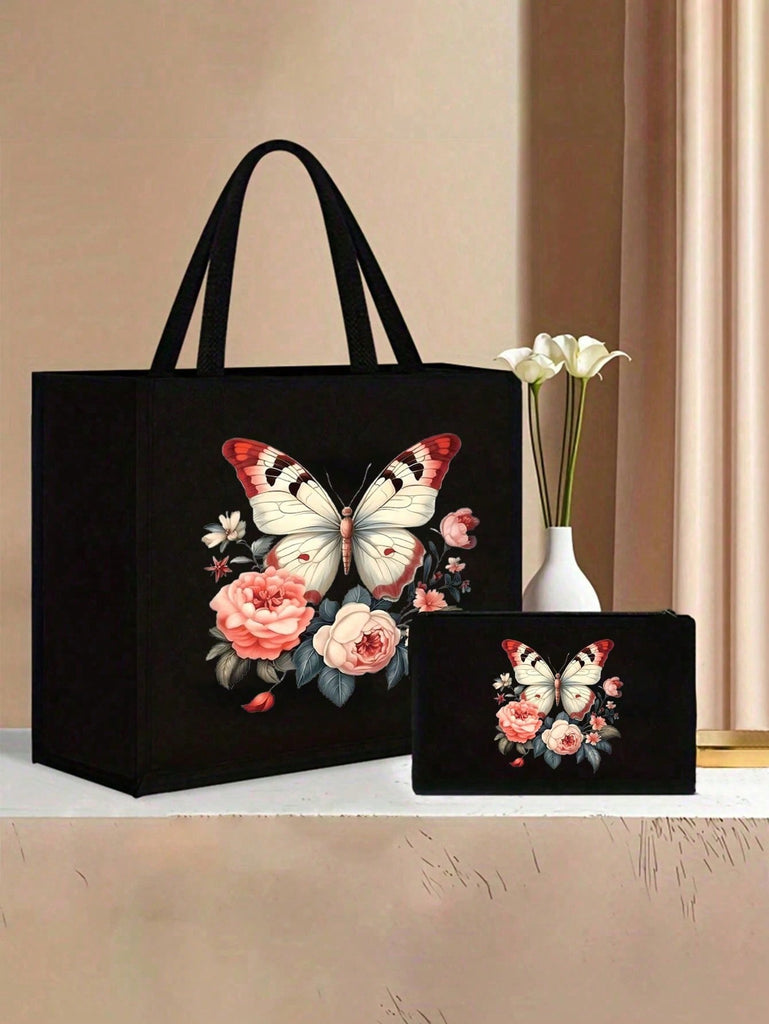 2pcs Fashionable Geometric Print Tote Bag Set, Large Capacity Casual Handbag With Fixed Straps, Foldable Design, Magnetic Closure, Polyester Lined, Non-Washable - Black