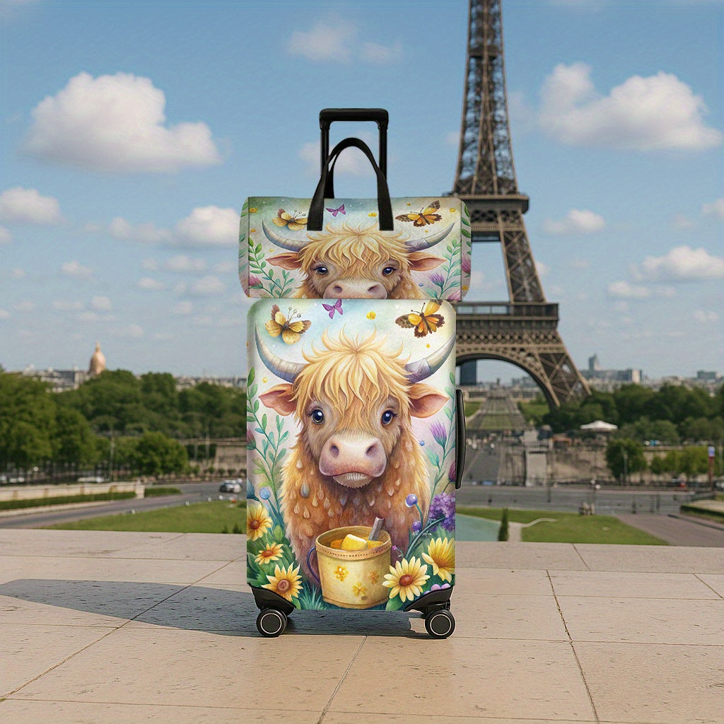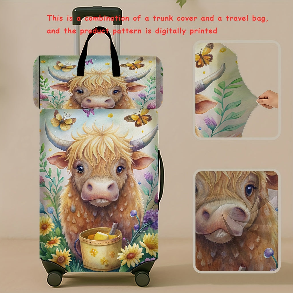 2pcs Highland Cow Floral Butterfly Print Luggage Set (1 Travel Bag 1 Suitcase Protector), Trolley Handbag, Unisex Carry-On Bags, Essential for Outdoor Vacations and Travel